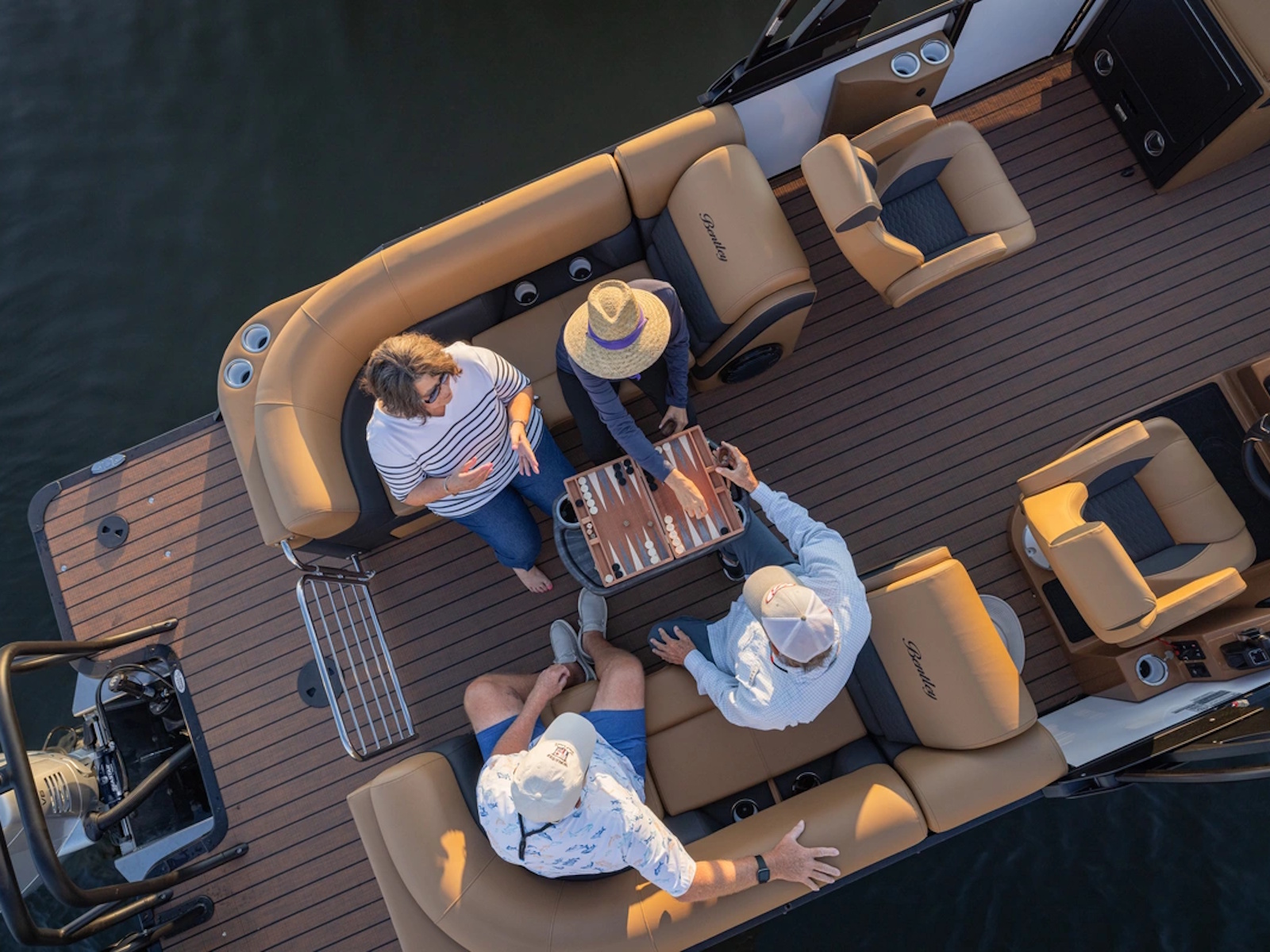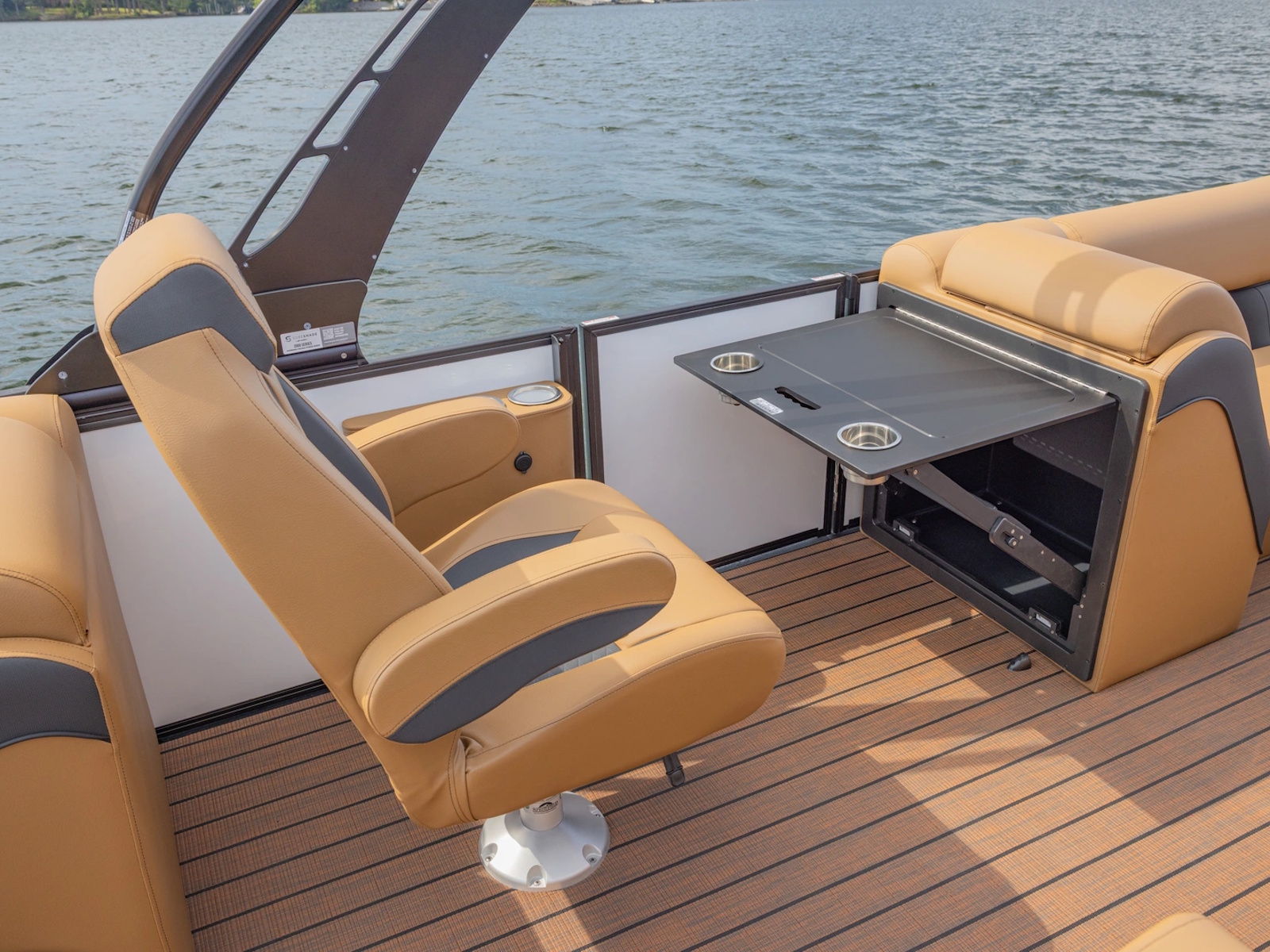 The Elite QSB (Quad Swingback) delivers unmatched versatility on the water. This model features traditional U-shaped seating in the bow, providing ample storage space and convenient amenities like recessed cup holders, plush soft-touch furniture, and dual forward laybacks for ultimate relaxation. The stern includes port and starboard quad swingback seating, allowing for the addition of two standard tables for snacks or entertainment. The adjustable backrest offers the flexibility to face forward or backward, creating a comfortable lounge area to suit any boating experience.