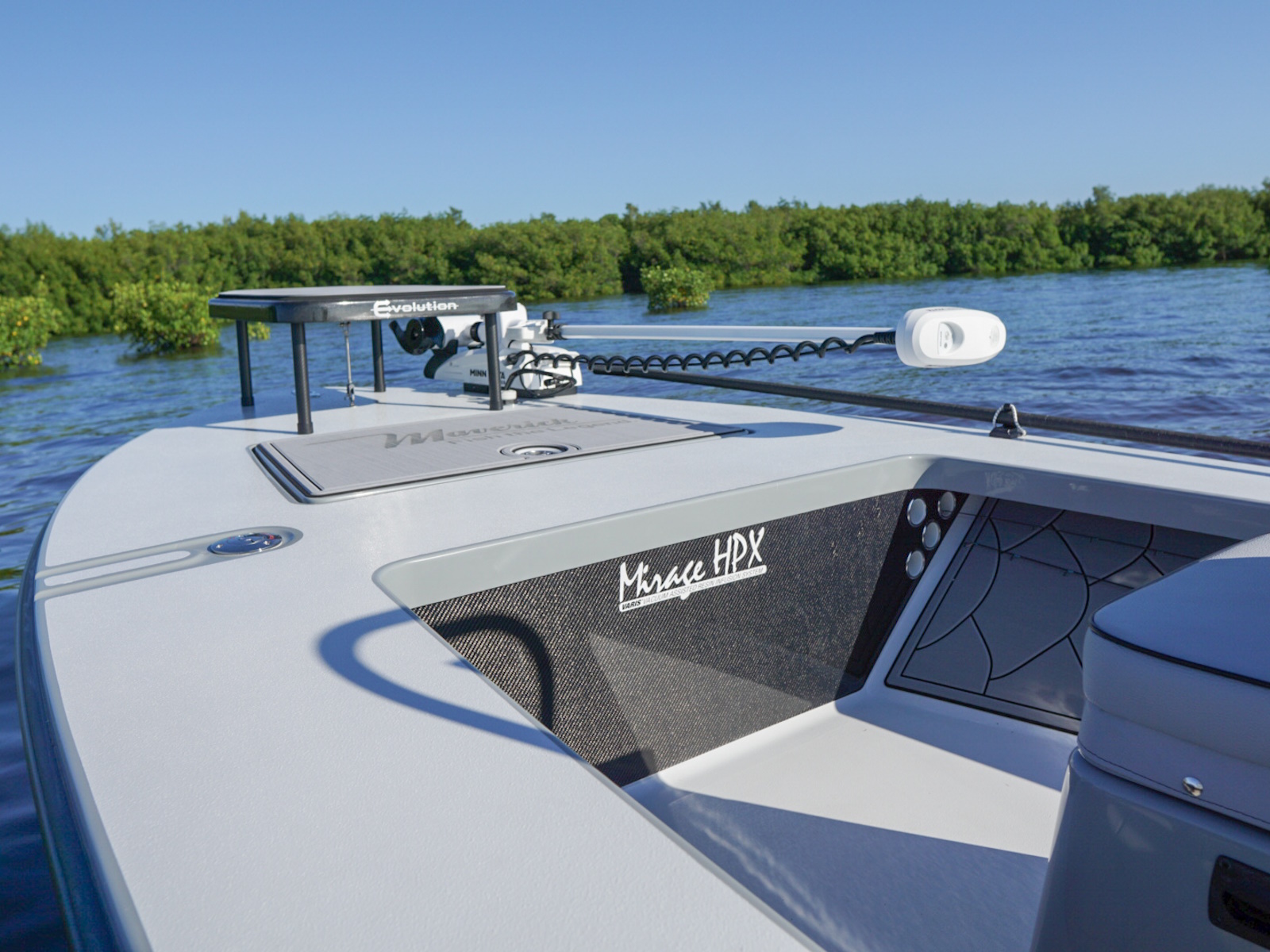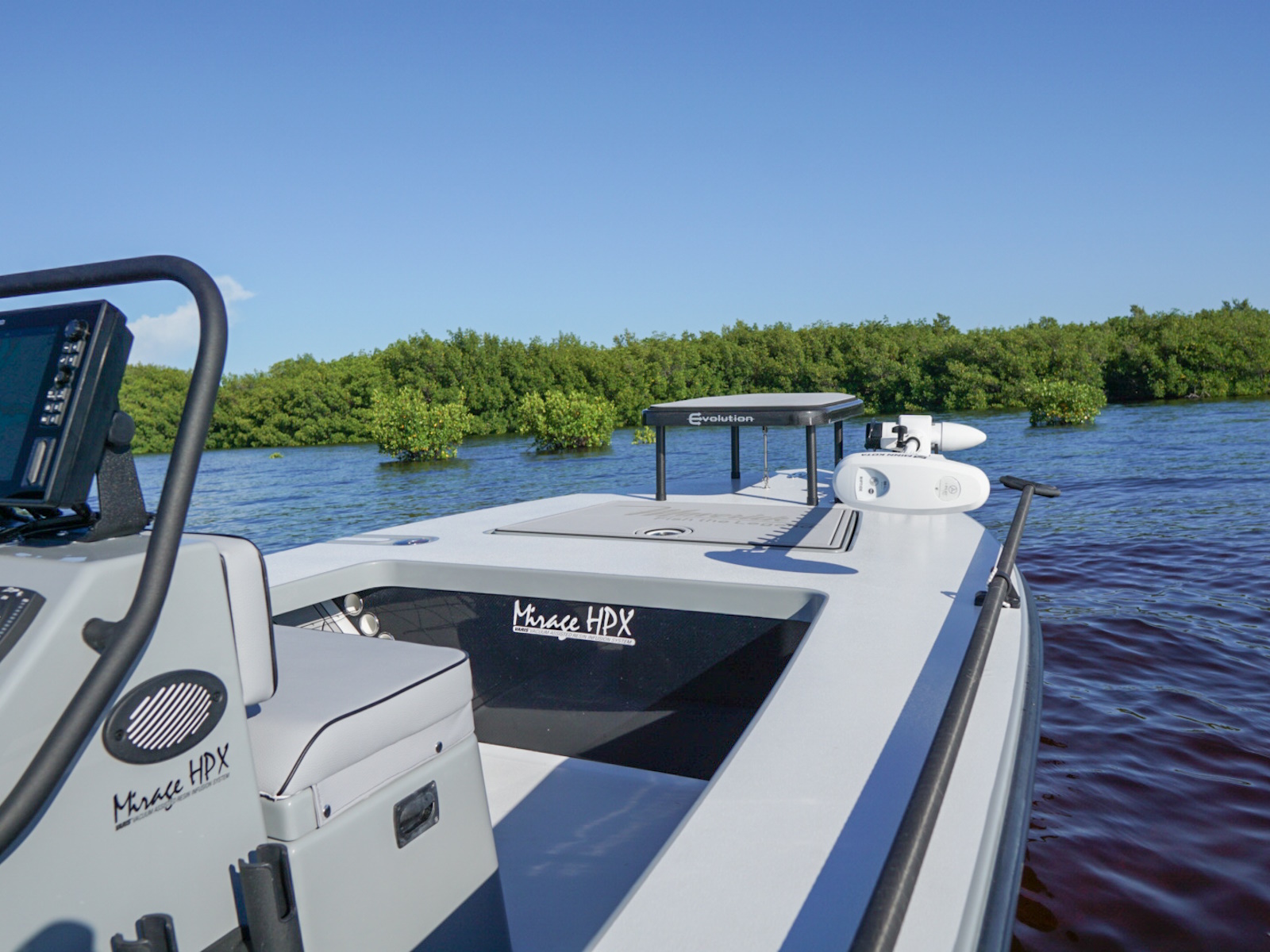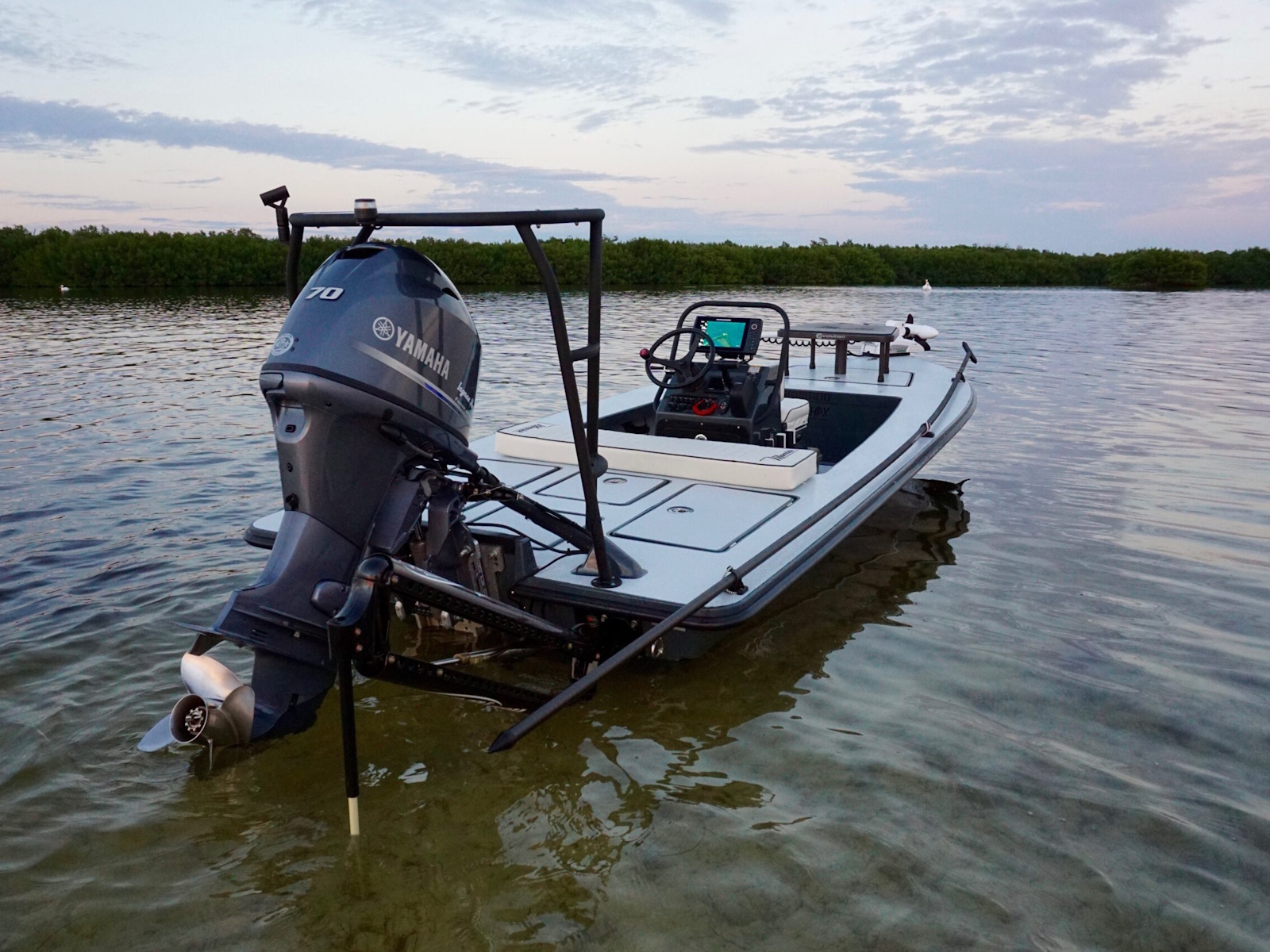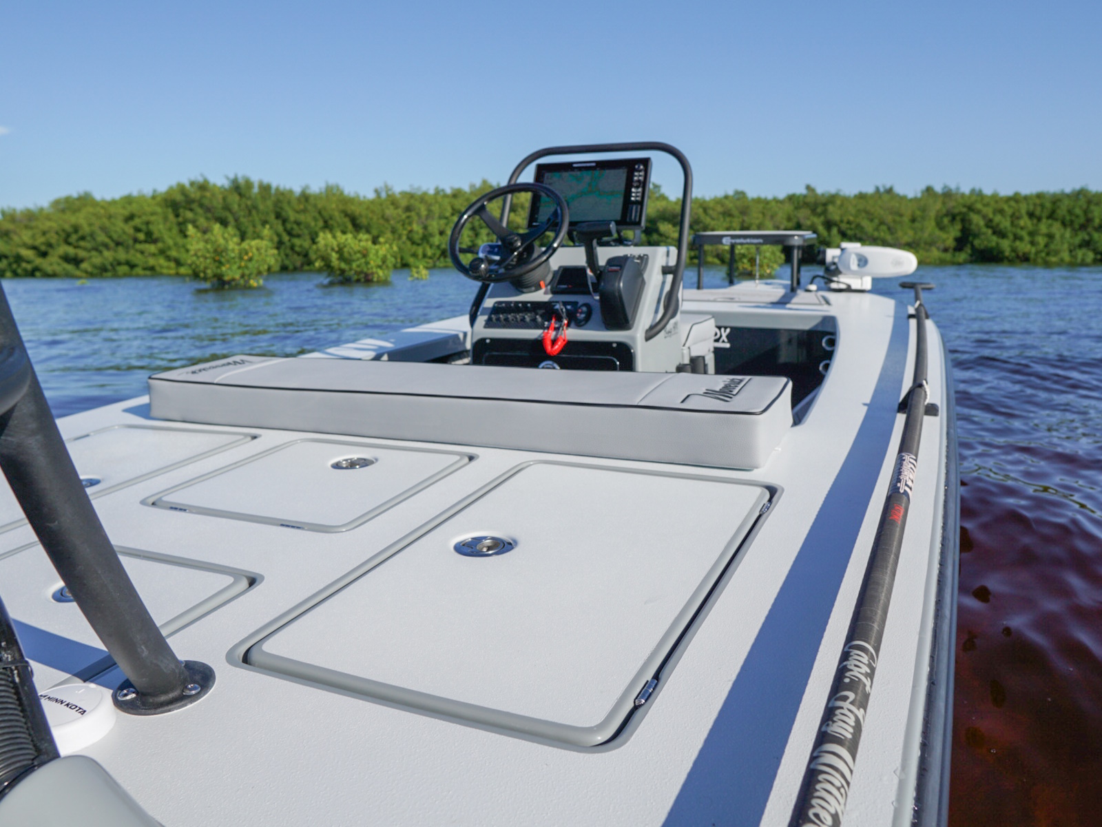 The revolutionary skiff that has cracked the code of sacrificing running comfort, range and poling performance for the sake of getting super shallow. The 17 HPX-S’s one of a kind hull combines the knowledge of the most experienced skiff designing team in the business, the latest in CAD designed naval architecture, and advanced aeronautic technologies. The result is a skiff that floats in less than 6″ inches of water, drives like a sports car while keeping its occupants exceptionally dry and comfortable, and poles with precision and complete stealth. Sounds too good to be true? It was until now.