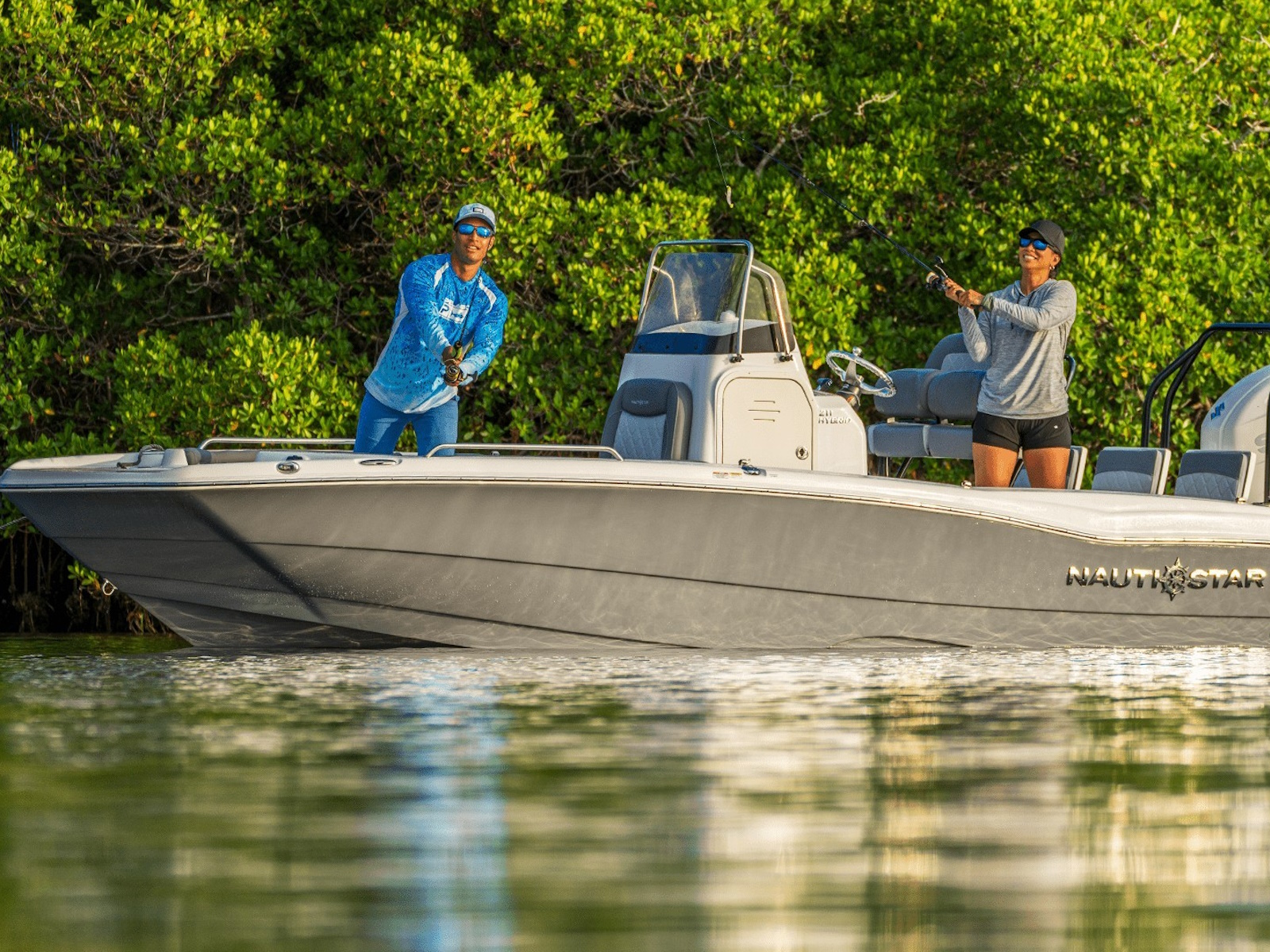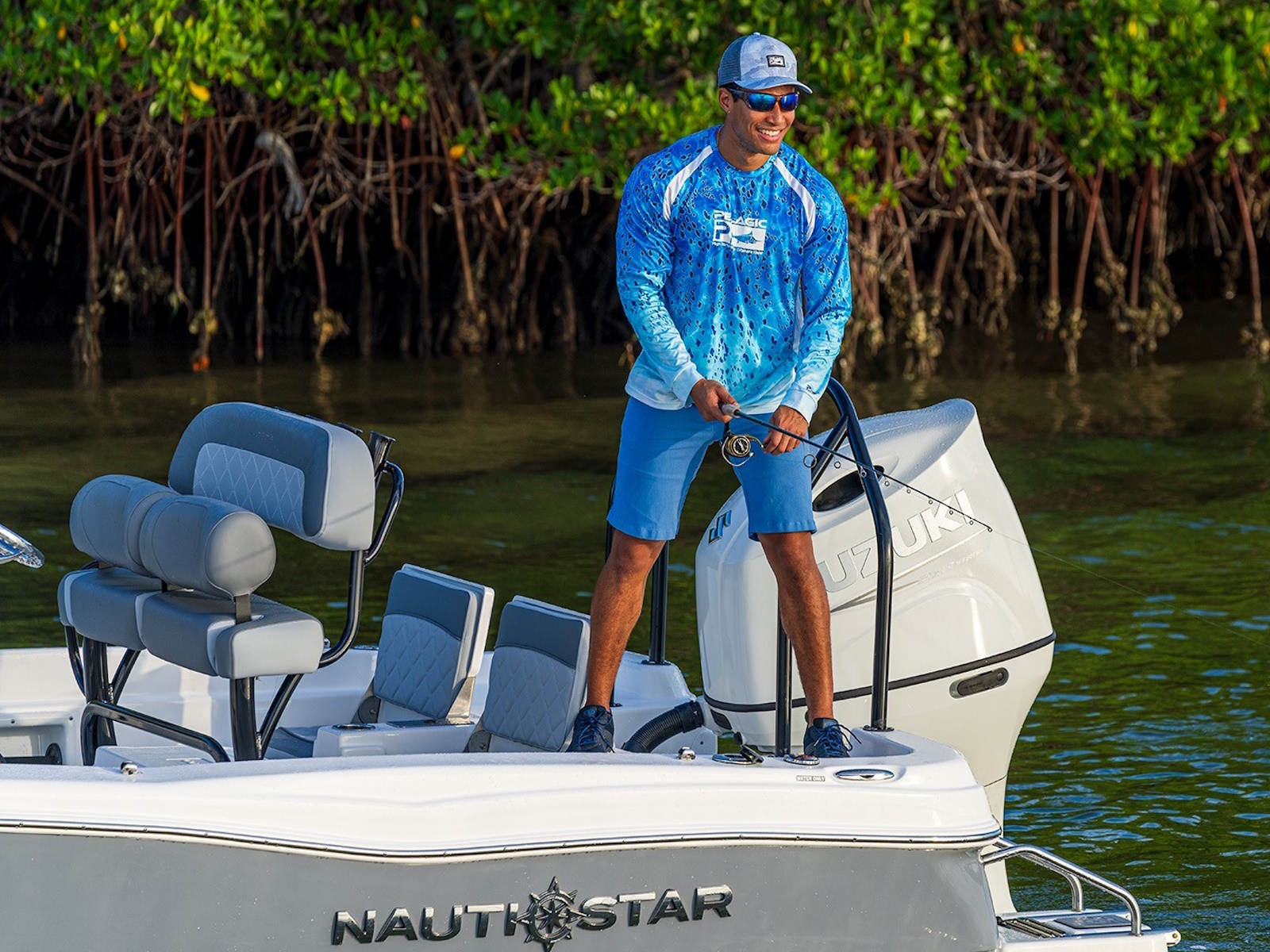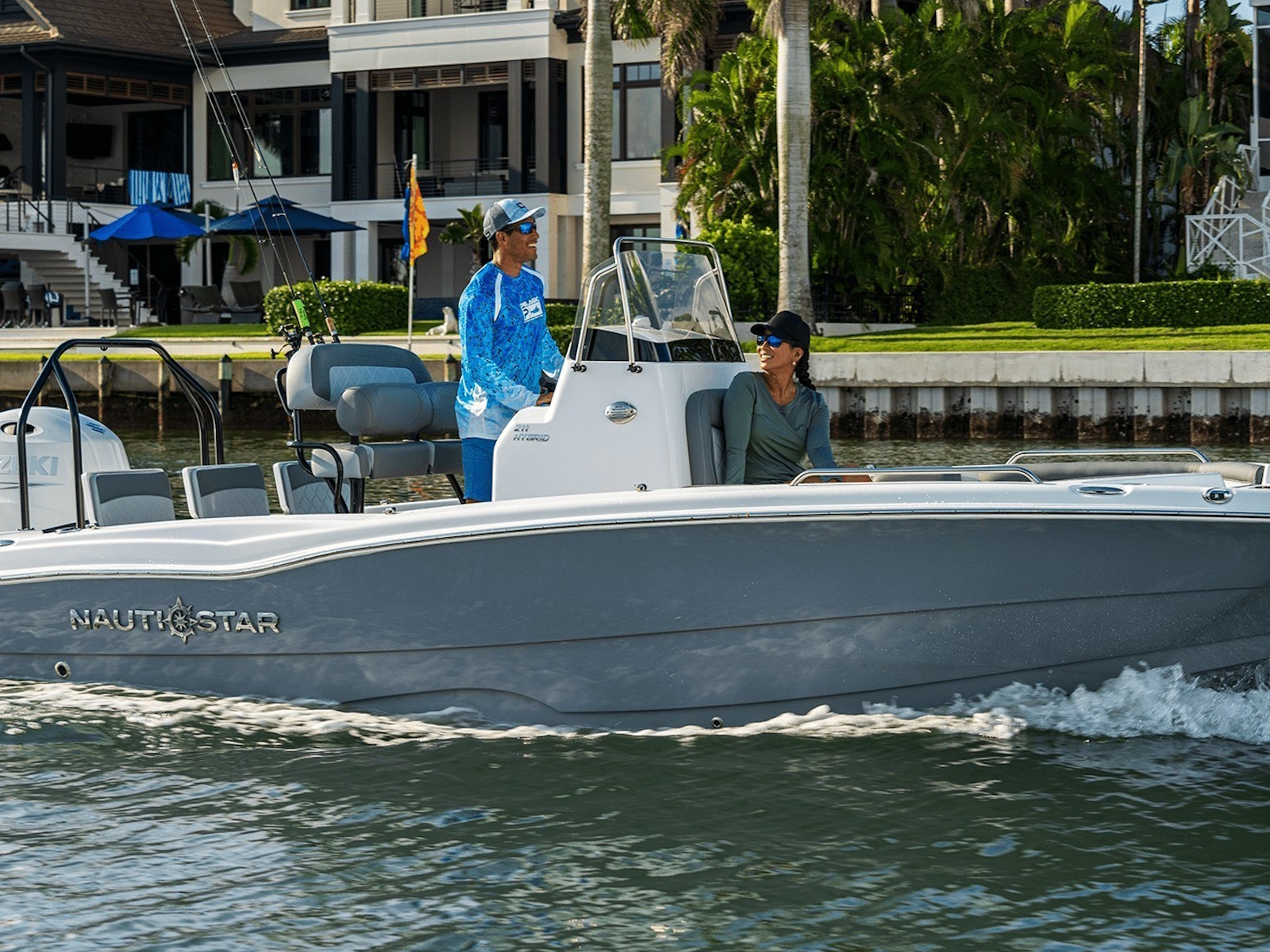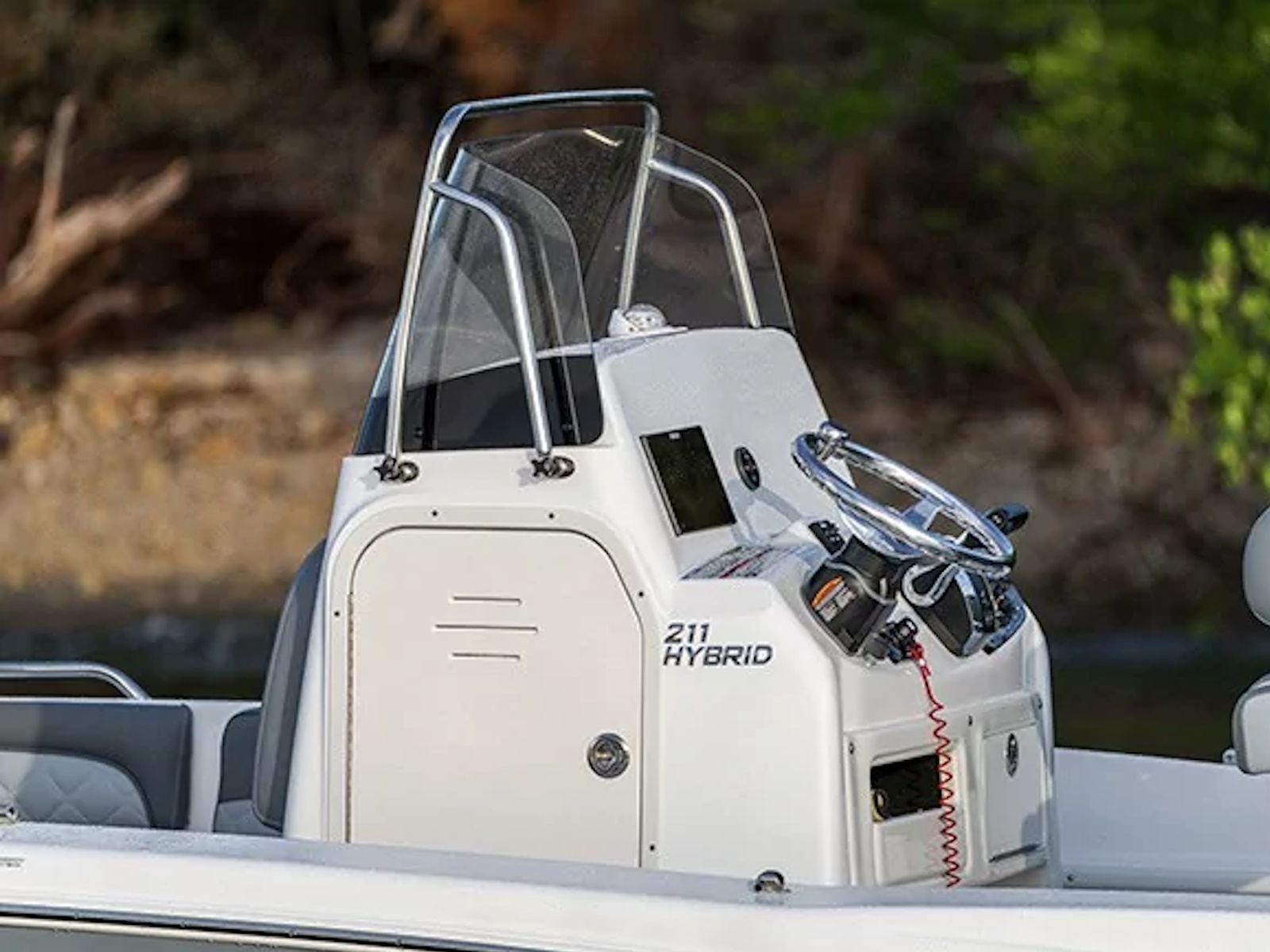 NauticStar’s 211 Hybrid is the perfect host for friends and family. Its ample seating – three-across at aft and five up at bow – make it easy to engage socially on the water. When it is time to get serious about fishing, however, the 211 Hybrid will up your game big time. Features like six in-console rod holders and 13-gallon livewell/baitwell, gunnel rod holders, and a non-skid self-bailing cockpit come standard. The aft and bow seats even convert into casting platforms and are utilized for cast net storage, battery, and livewell storage.