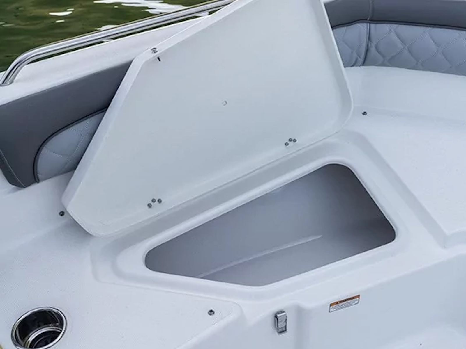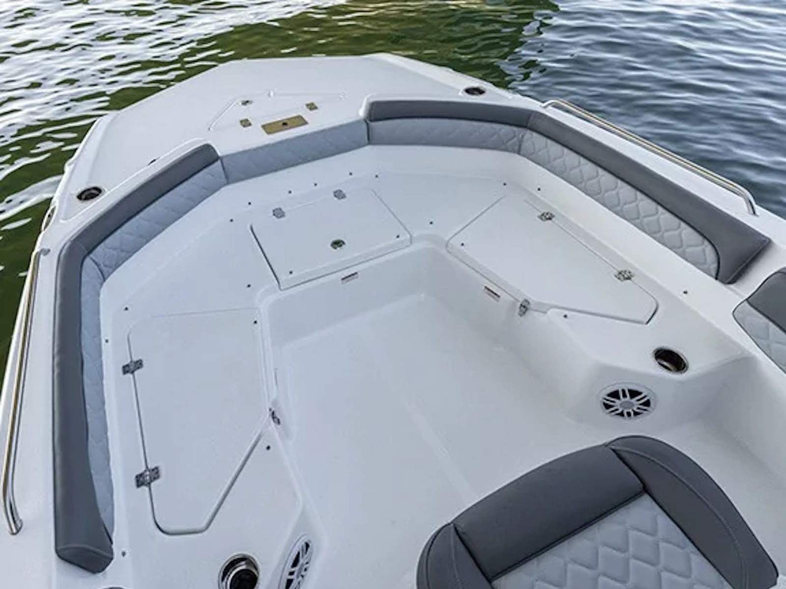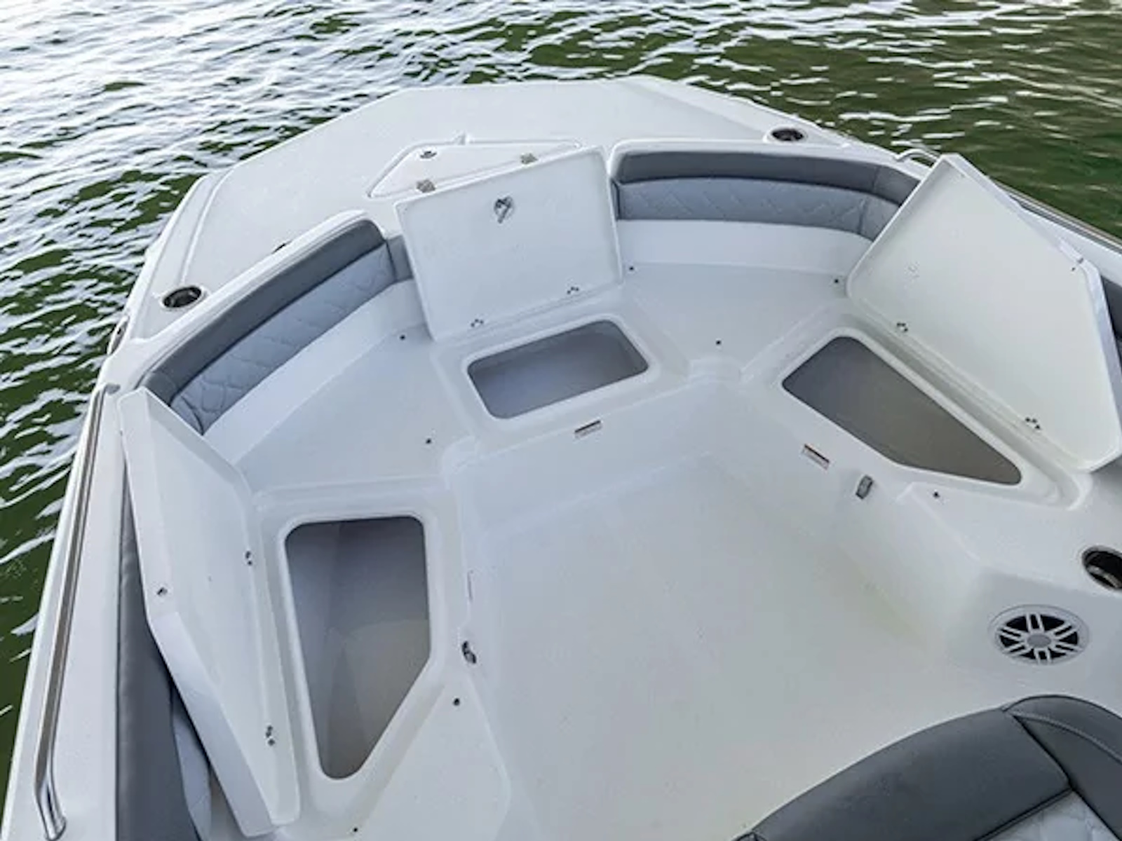 Turn your 211 into a versatile deck boat with an added Sport Package, which includes a swim platform, bimini top, and Fusion stereo system.