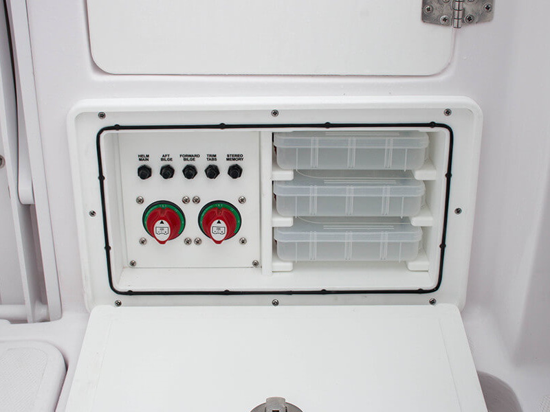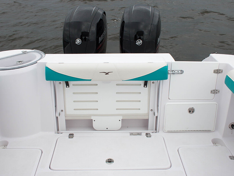 On deck fishability abounds. A twin helm seat is positioned for easy 360 degree views. Pro-Line’s custom foldaway cockpit bench seat makes it easy to entertain or easy to make quick room to bring in the big catch. And fishboxes, a lighted baitwell, rod storage, bolster pads, and large transom door ensure that when the fishing gets hot, your new 26 Express delivers!