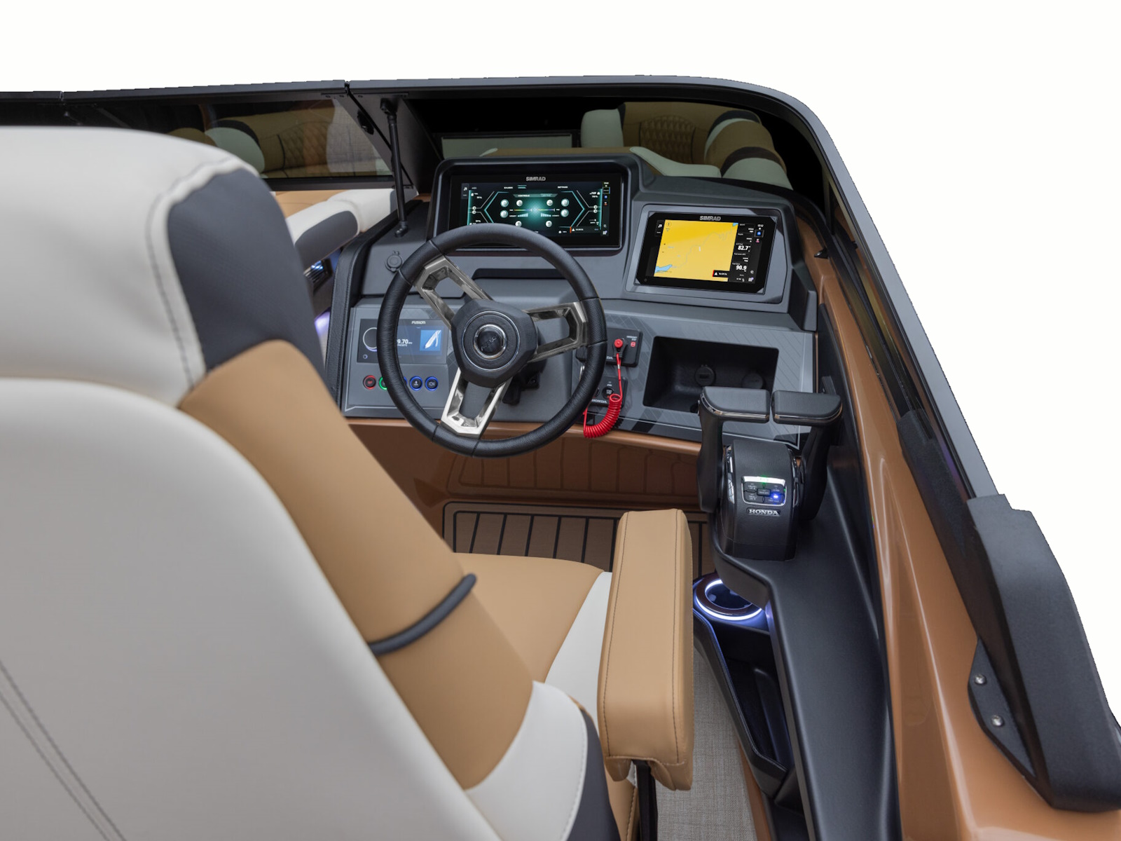 - Rear fishing center with 2 fishing chairs, rod holders & livewell