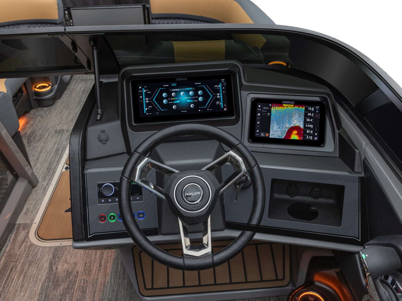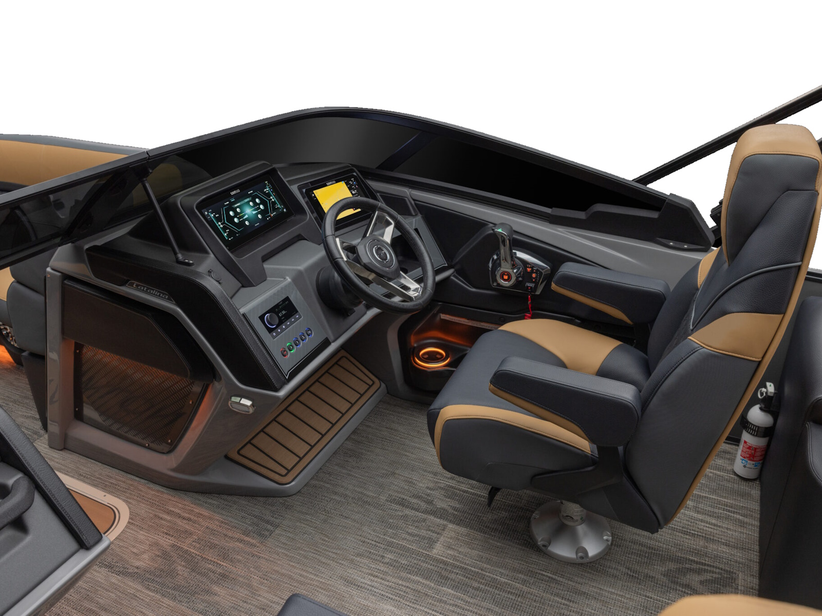 - Rear fishing center with 2 fishing chairs, rod holders & livewell