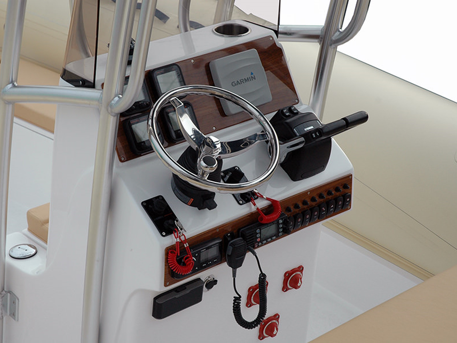 - Fiberglass Console with Windshield, Cup Holders, Lockable Glove Compartment, Handrail & Front Seat with Cushion