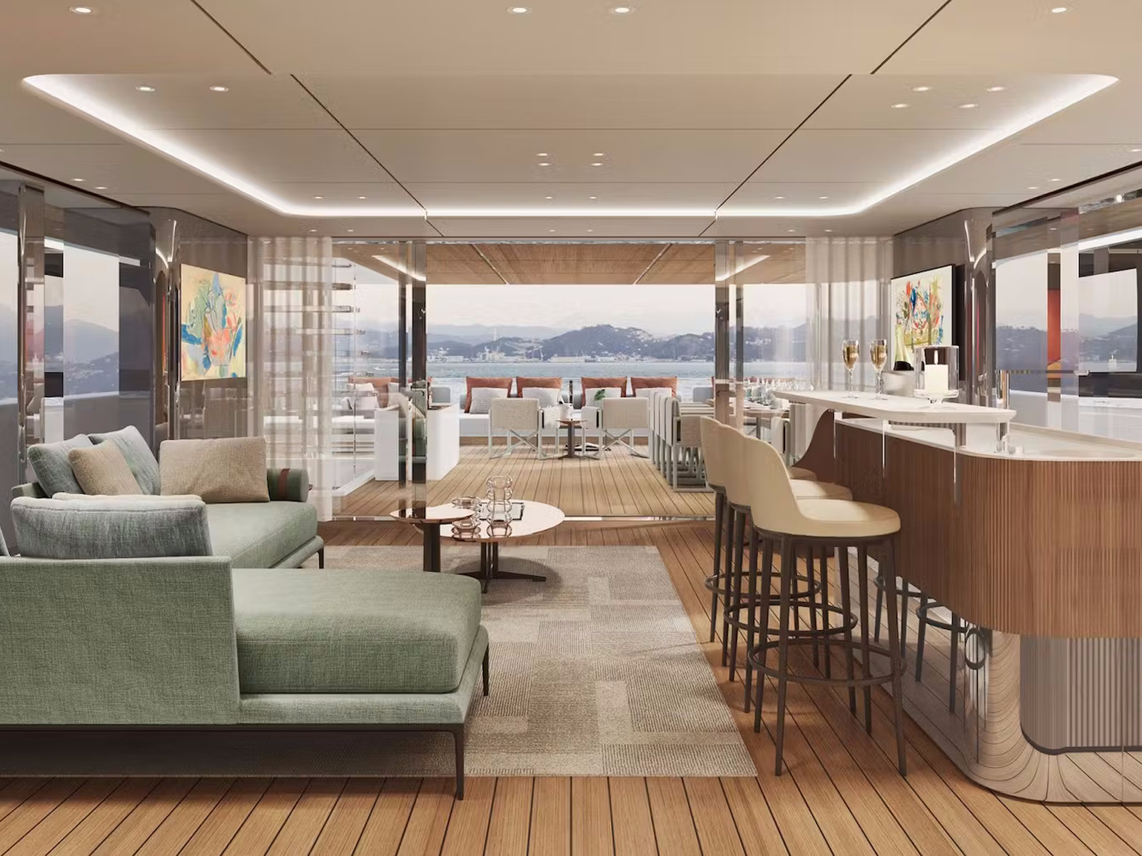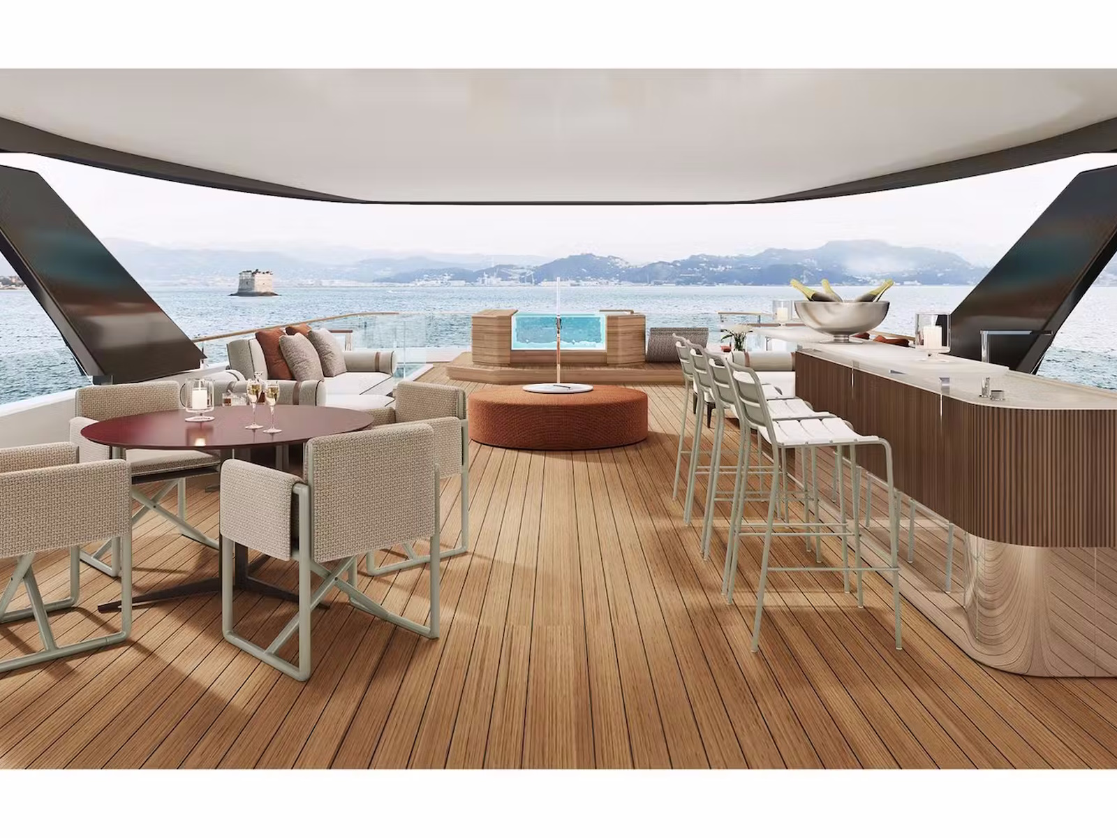 The magnificent beach club at the water’s edge is in direct contact with the outdoor area aft on the main deck, fitted out as a private lounge and forming an incredibly atmospheric space.