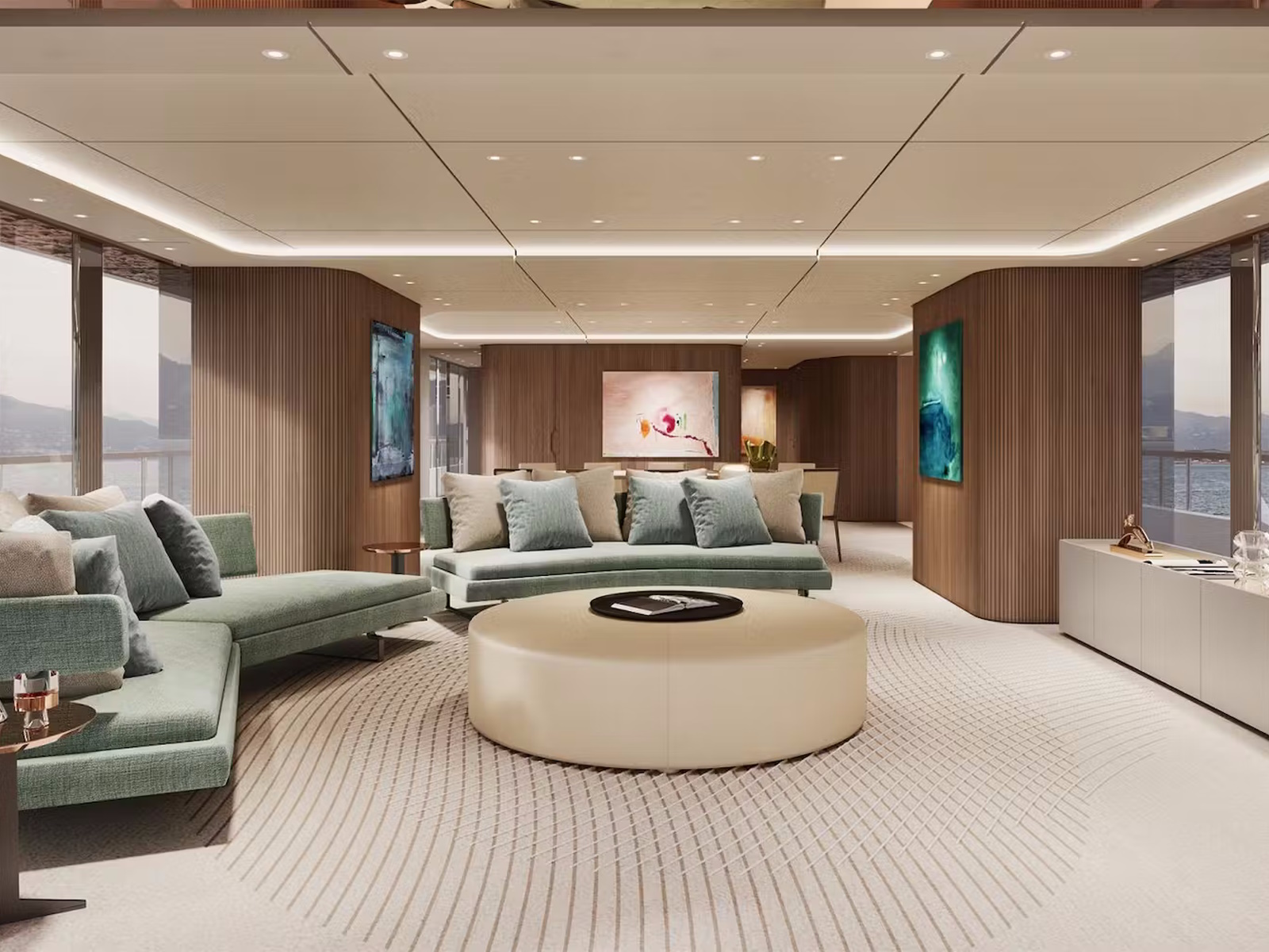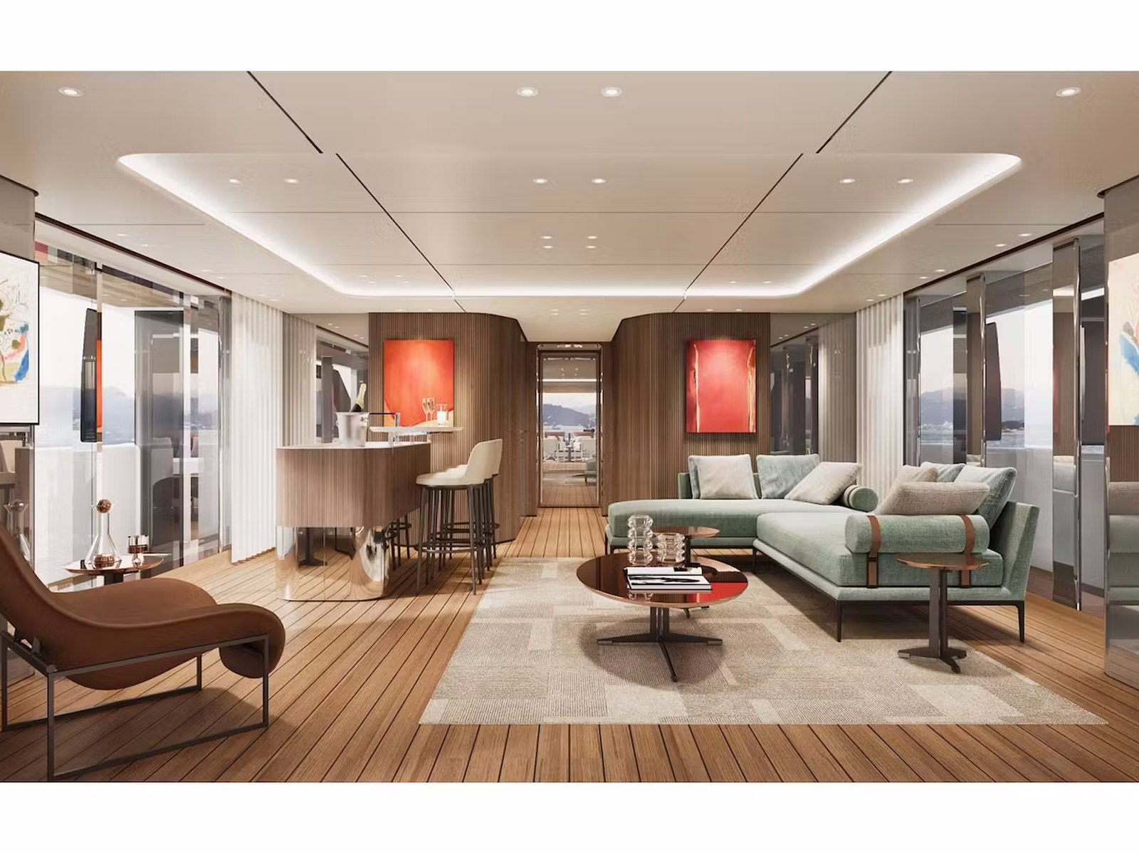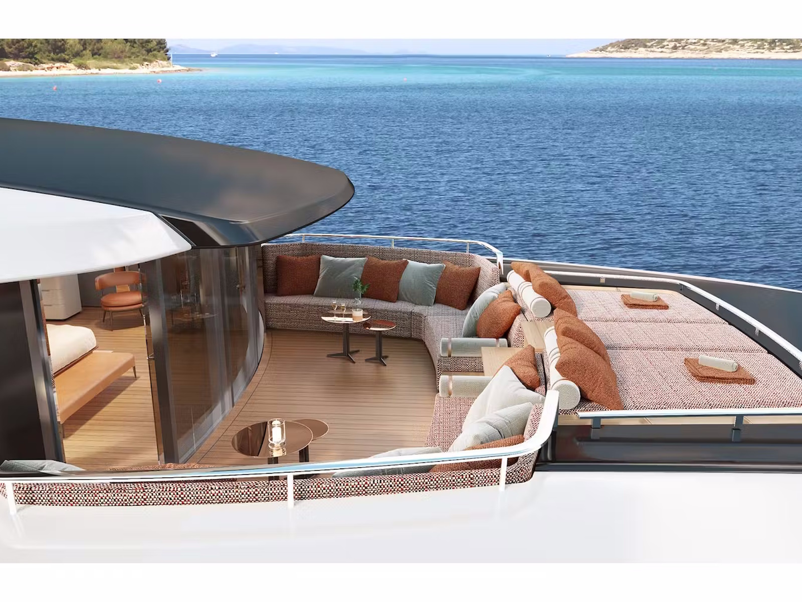 Interconnection between interiors and exteriors is one of the distinctive features of Custom Line Navetta 50, with large floor-to-ceiling windows and reflective surfaces used to convey the feeling of being on an island rising from the seascape.