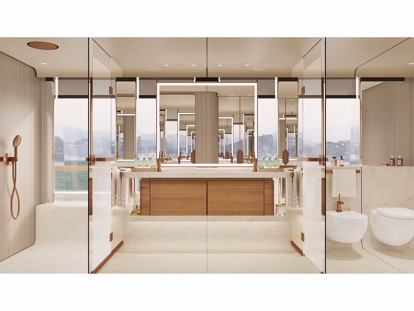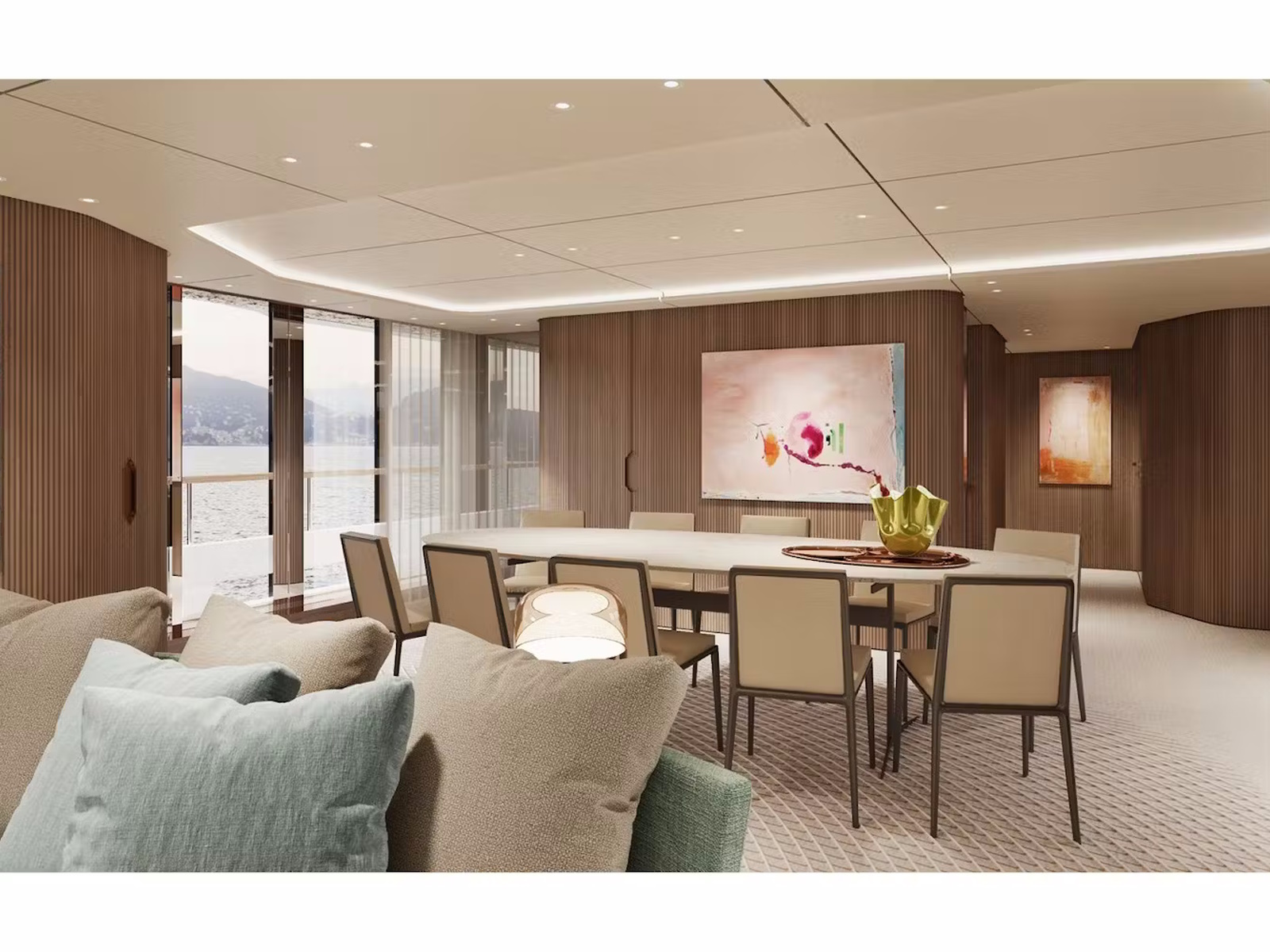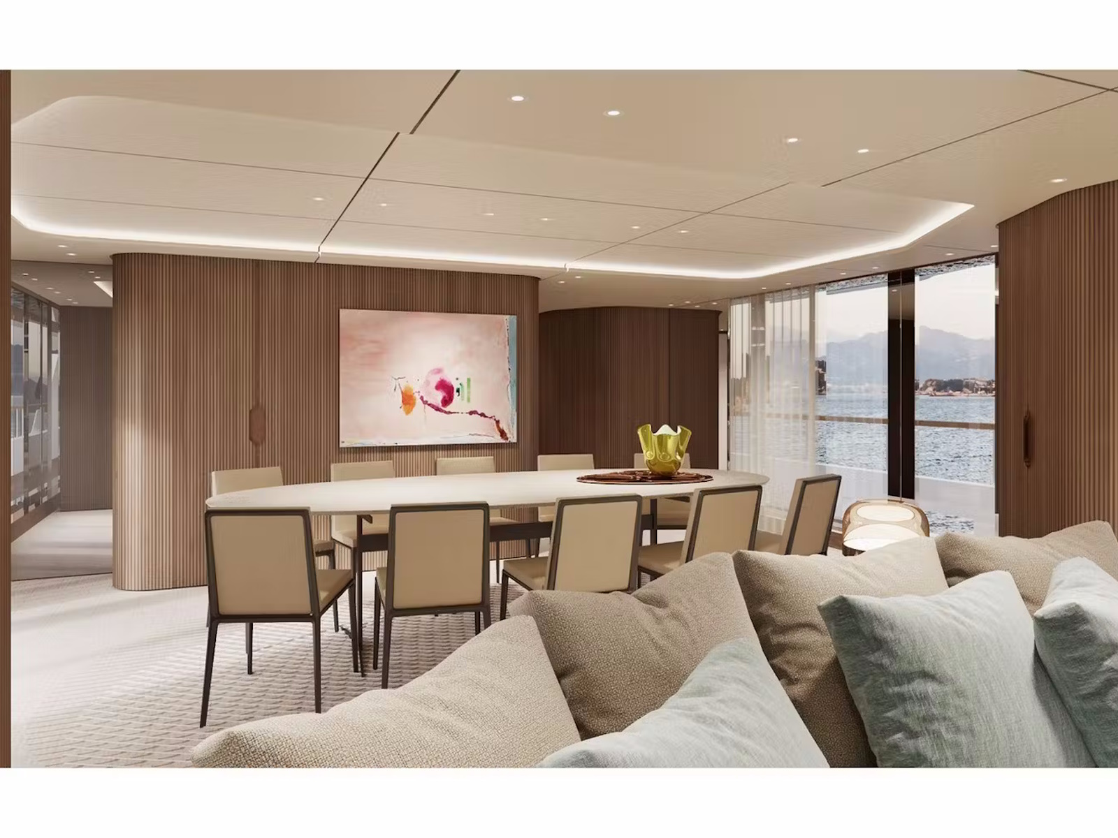 Interconnection between interiors and exteriors is one of the distinctive features of Custom Line Navetta 50, with large floor-to-ceiling windows and reflective surfaces used to convey the feeling of being on an island rising from the seascape.