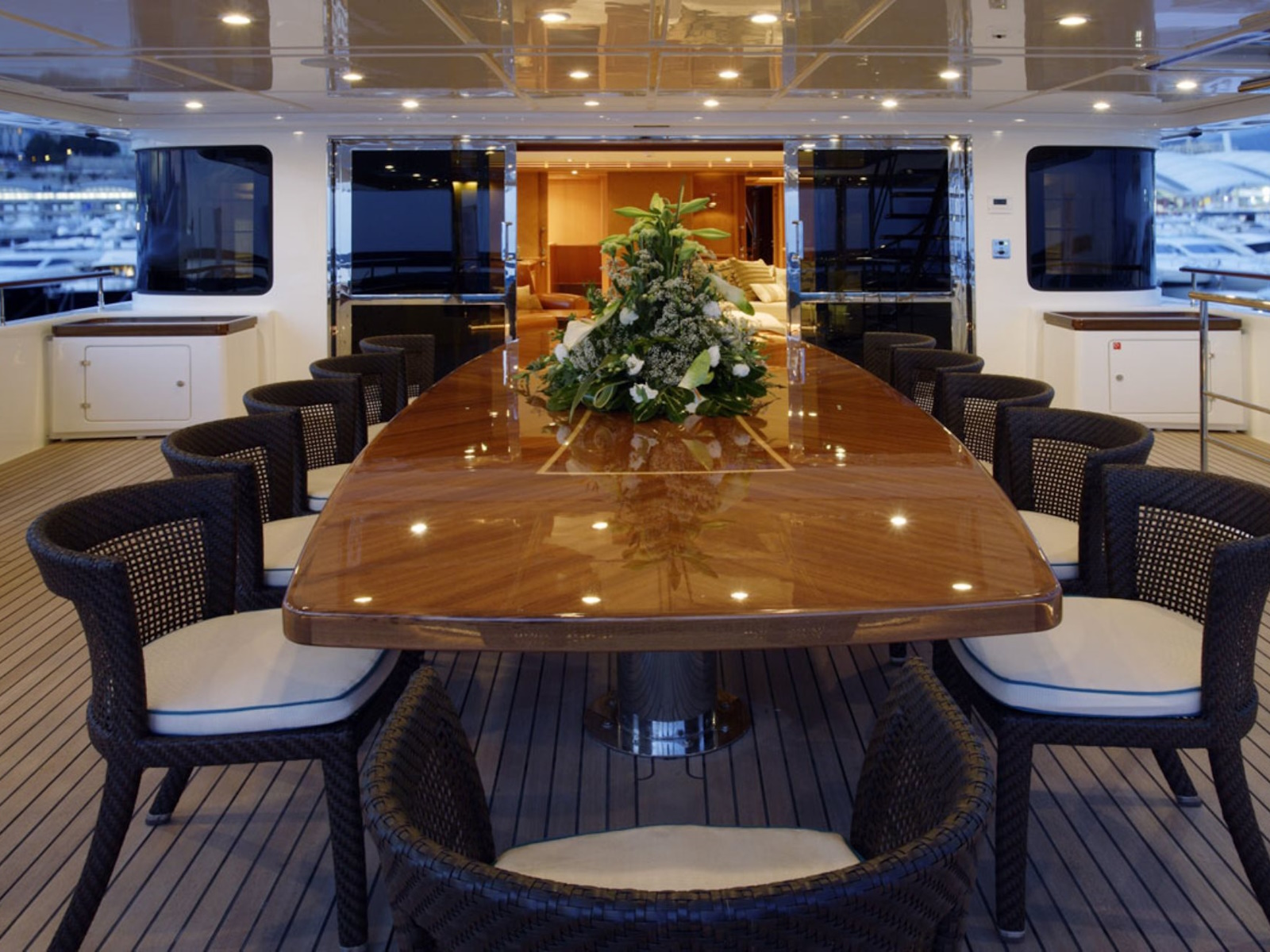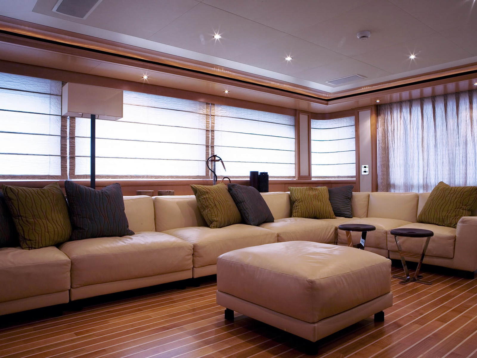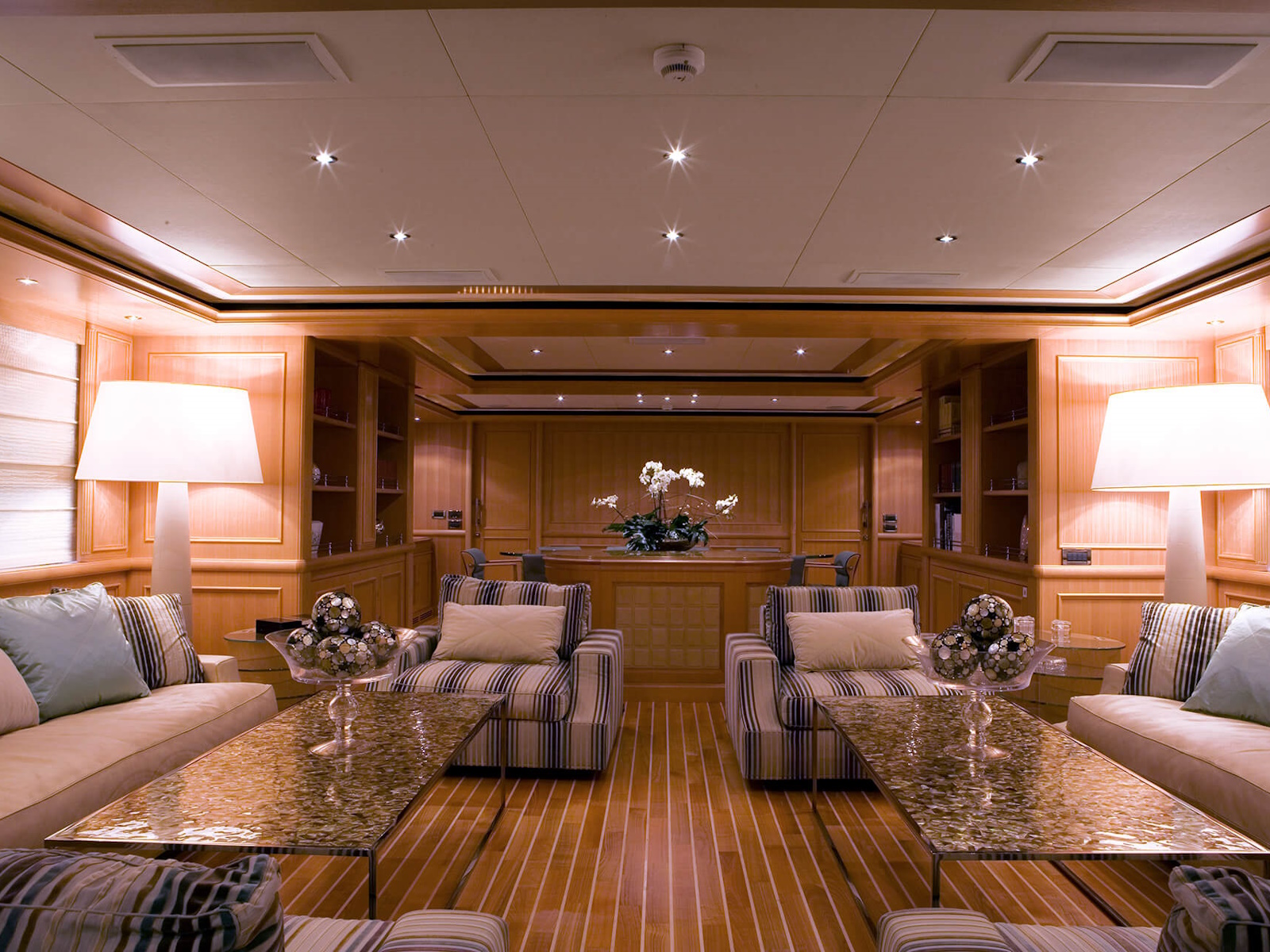 Light is the key element in the architecture of this superyacht, characterised not only by the space reserved for windows, but also by the decision to use a single type of wood panelling on all the decks. The light-hued relaxing shades of Tanganyika oak highlight the sense of luminosity, further emphasised by the use of exquisite fabrics in pastel tints running from aquamarine and turqoise to ivory and amber.