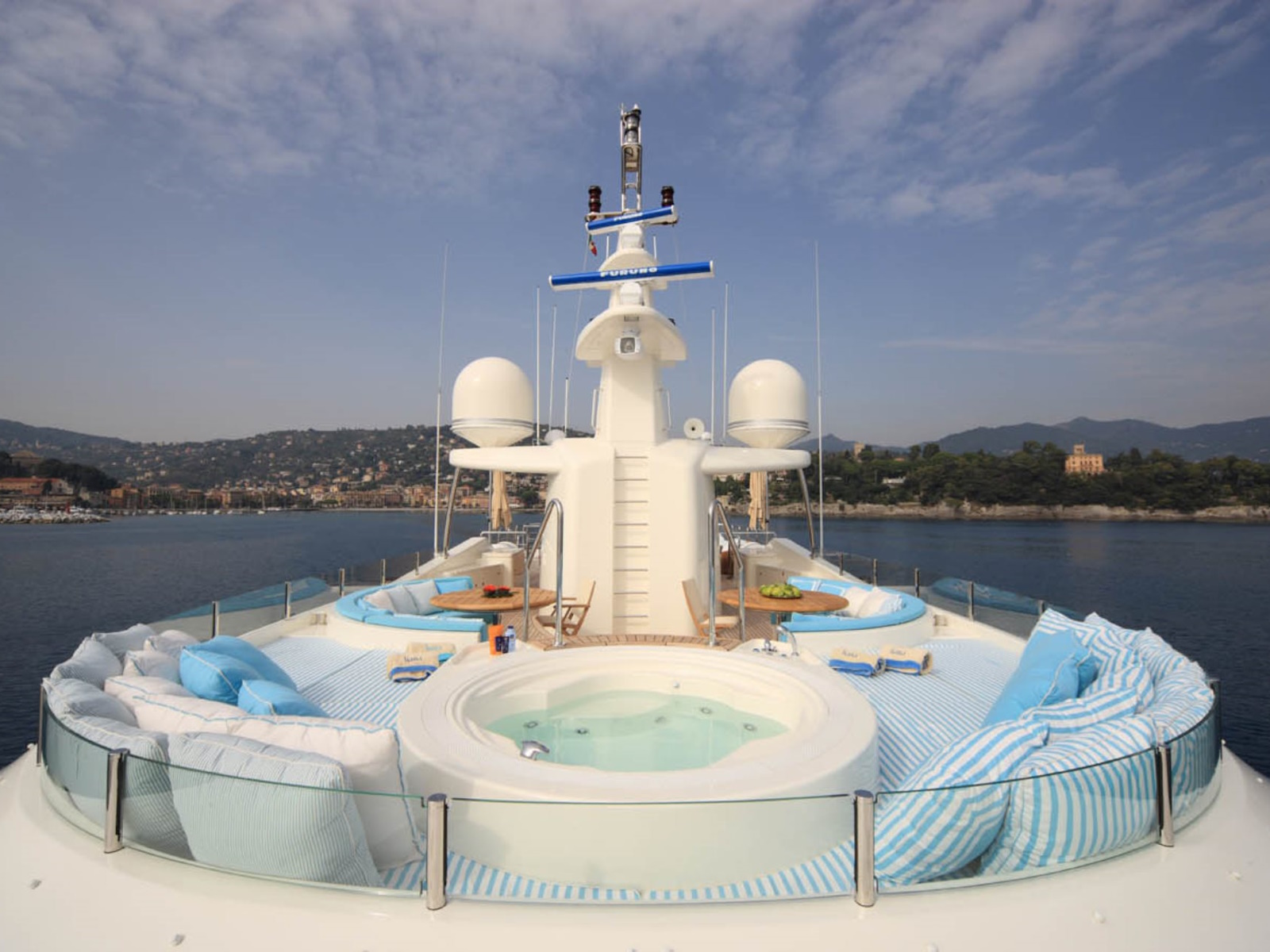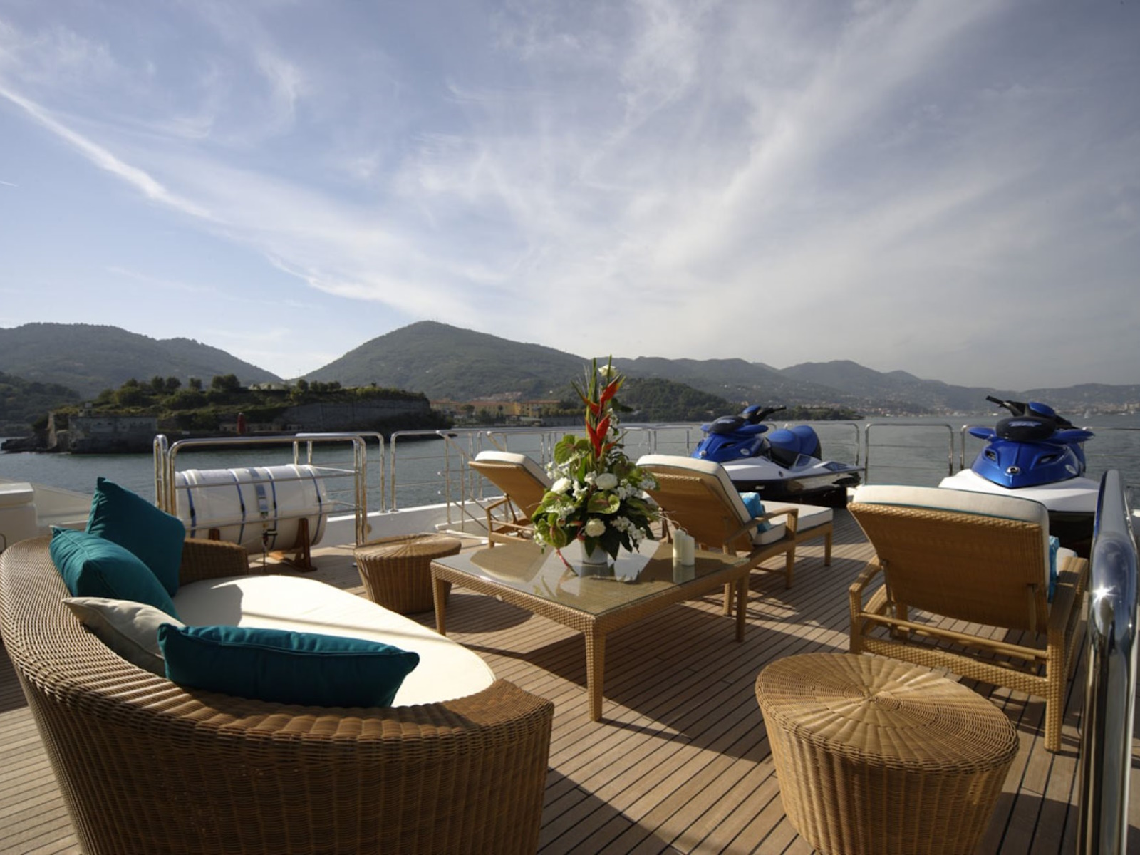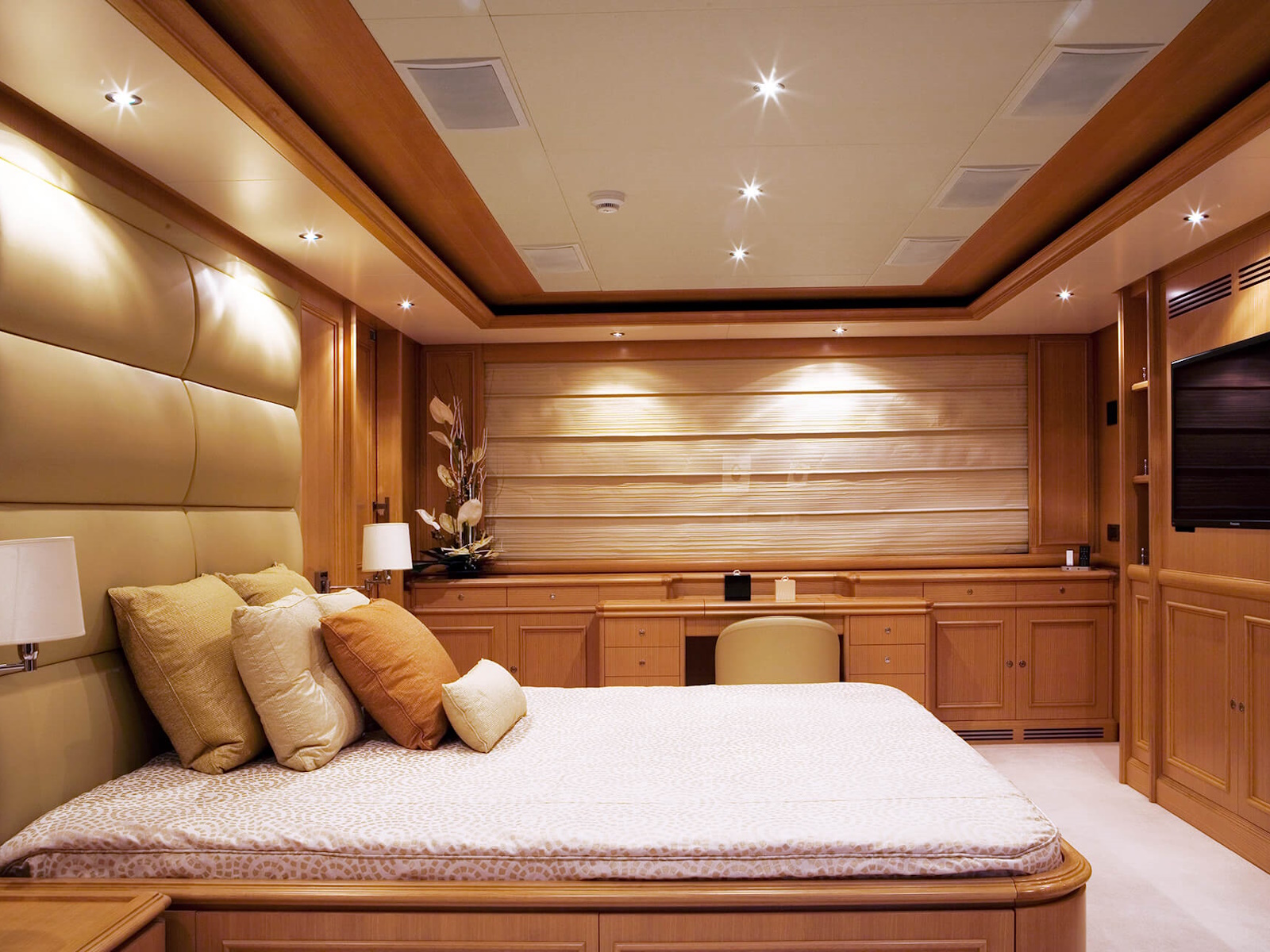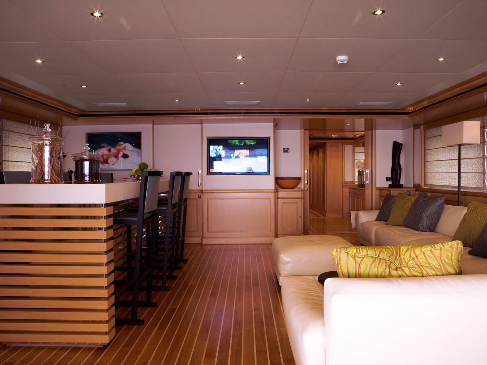 Light is the key element in the architecture of this superyacht, characterised not only by the space reserved for windows, but also by the decision to use a single type of wood panelling on all the decks. The light-hued relaxing shades of Tanganyika oak highlight the sense of luminosity, further emphasised by the use of exquisite fabrics in pastel tints running from aquamarine and turqoise to ivory and amber.