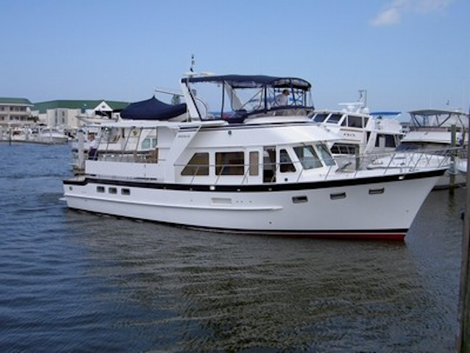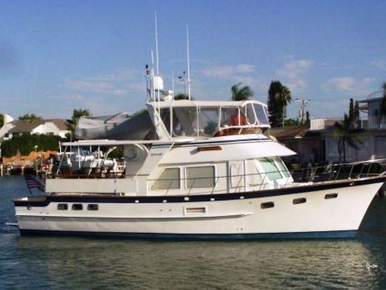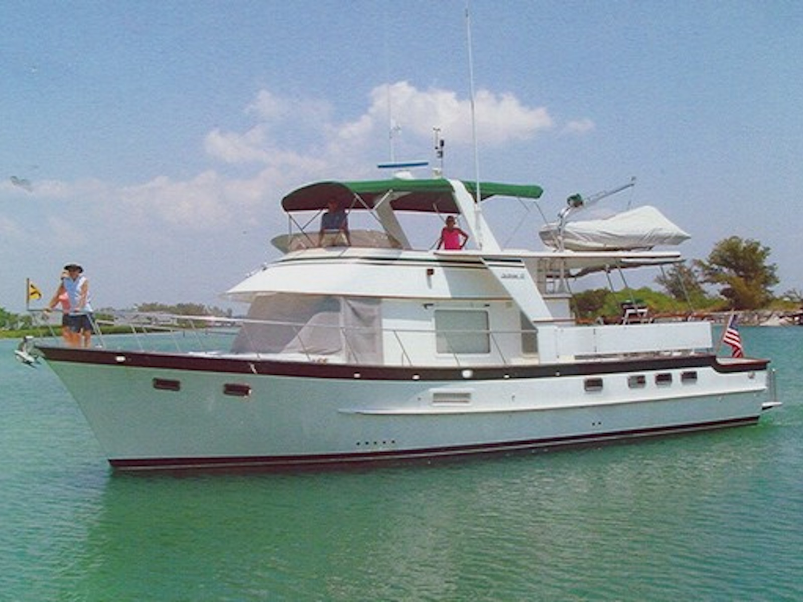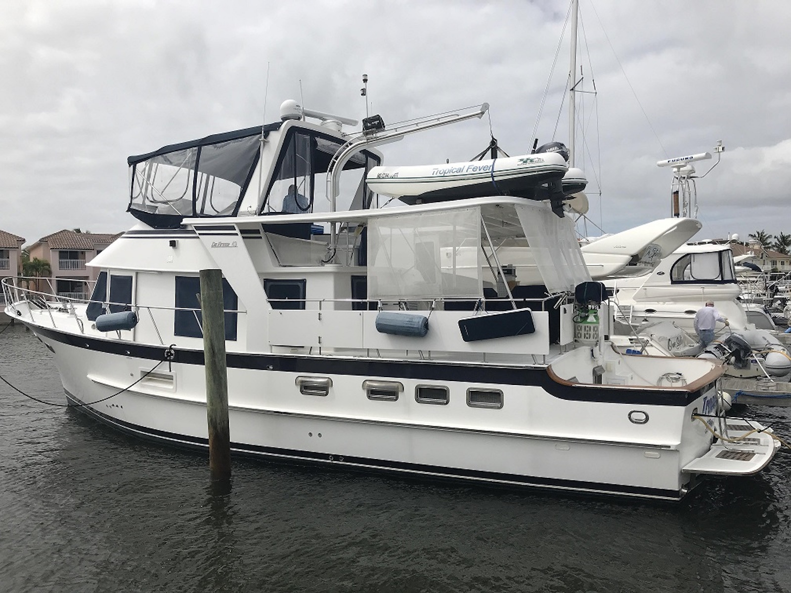 The 49 CMY is sometimes referred to as a 44 + 5 because she is the same as a 44 but with a 5-foot cockpit. The 49 carries more fuel, usually 1,100 gallons and is a little faster than the 44, due to her longer waterline length. Very popular now. An excellent cruiser for a couple with occasional guests. This is an excellent boat for the tropics because of the large shaded area under the usual Bimini top. Most people enclose the bridge with full canvas and run the boat from the bridge. Some models have a steering station in the saloon that is rarely used because of the comfort and visibility from the bridge. Not in production in 2019.