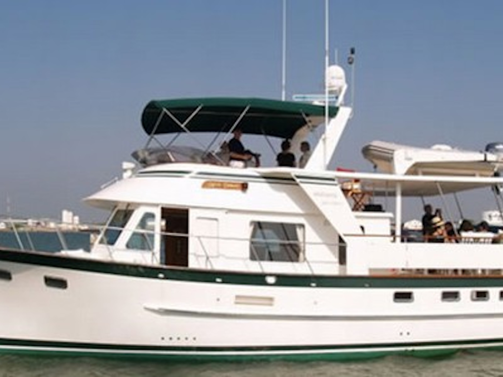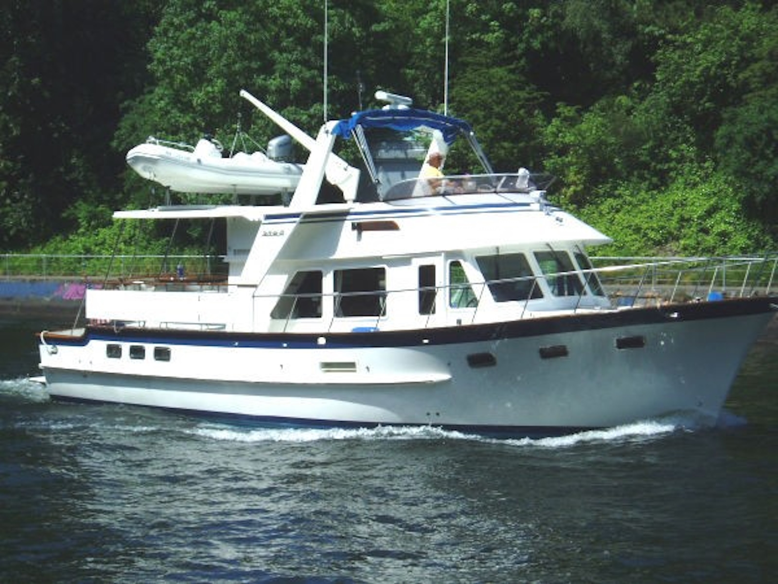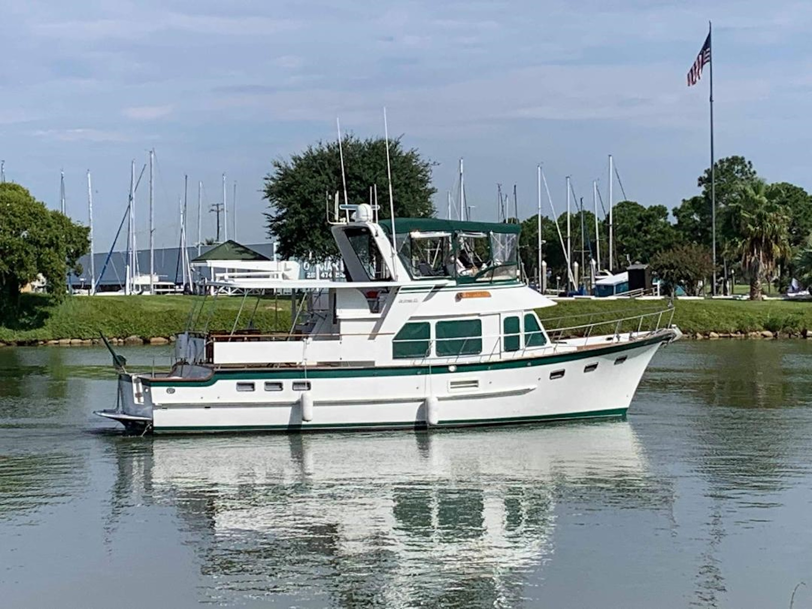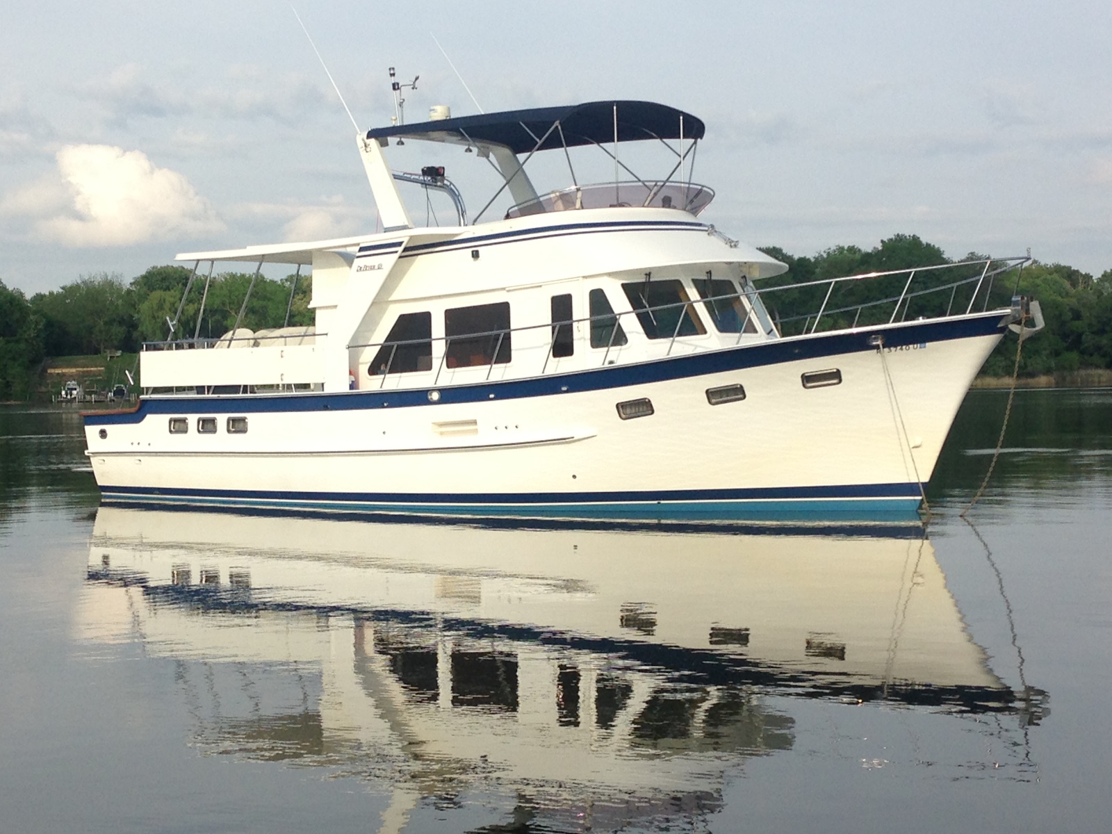 The 49 CMY is sometimes referred to as a 44 + 5 because she is the same as a 44 but with a 5-foot cockpit. The 49 carries more fuel, usually 1,100 gallons and is a little faster than the 44, due to her longer waterline length. Very popular now. An excellent cruiser for a couple with occasional guests. This is an excellent boat for the tropics because of the large shaded area under the usual Bimini top. Most people enclose the bridge with full canvas and run the boat from the bridge. Some models have a steering station in the saloon that is rarely used because of the comfort and visibility from the bridge. Not in production in 2019.