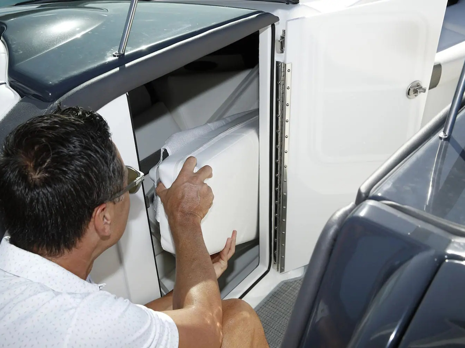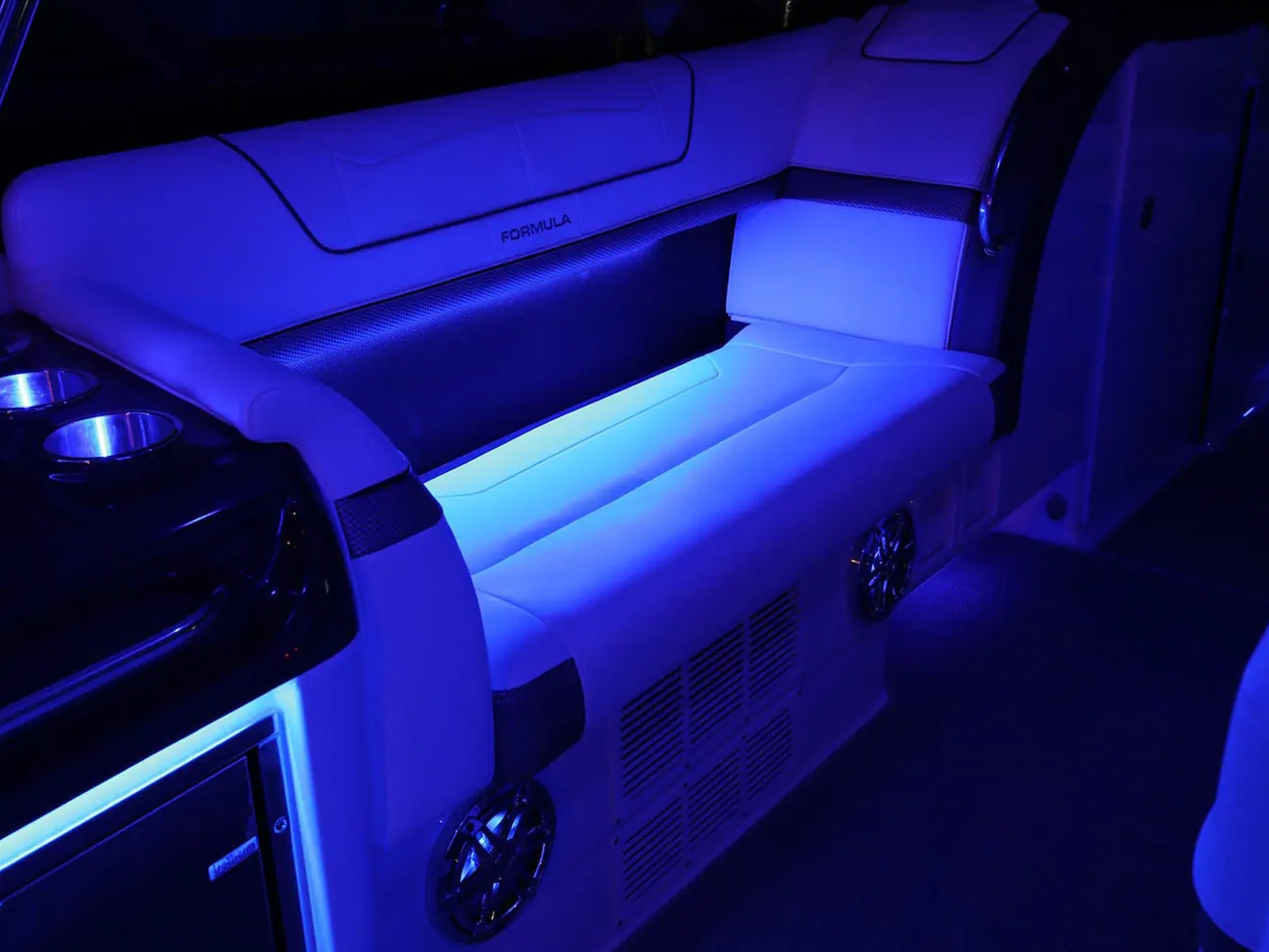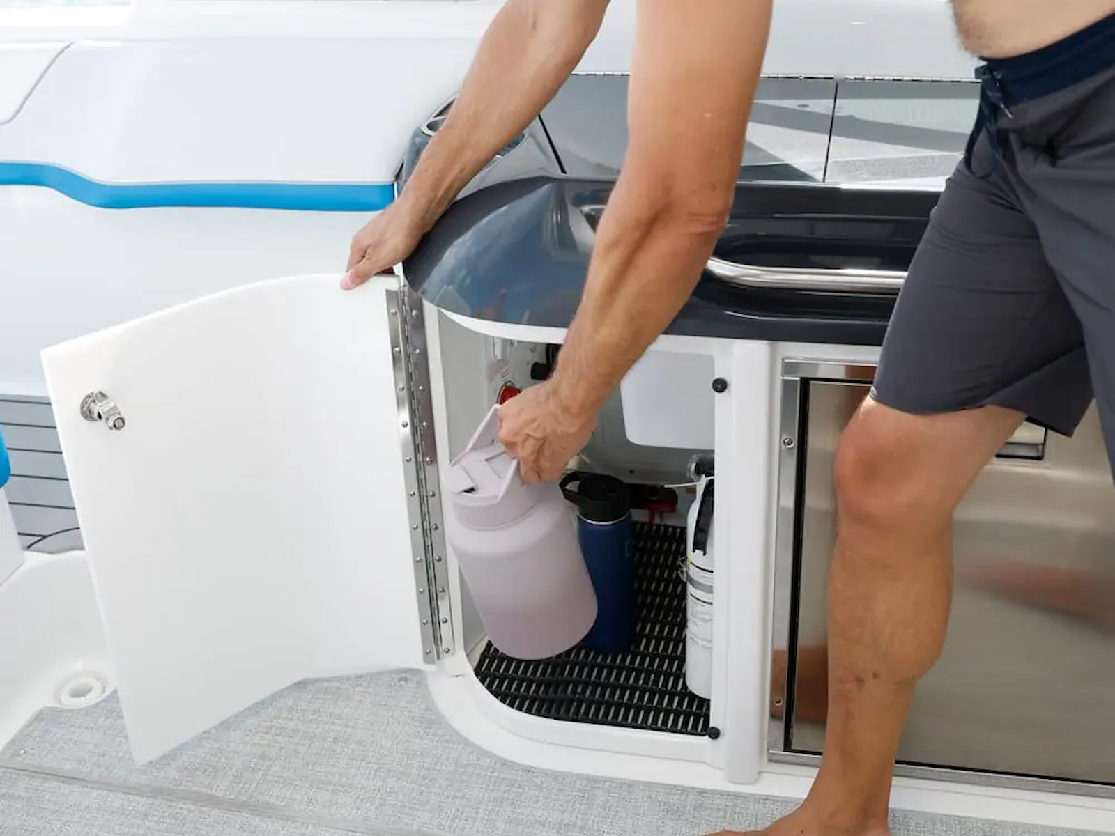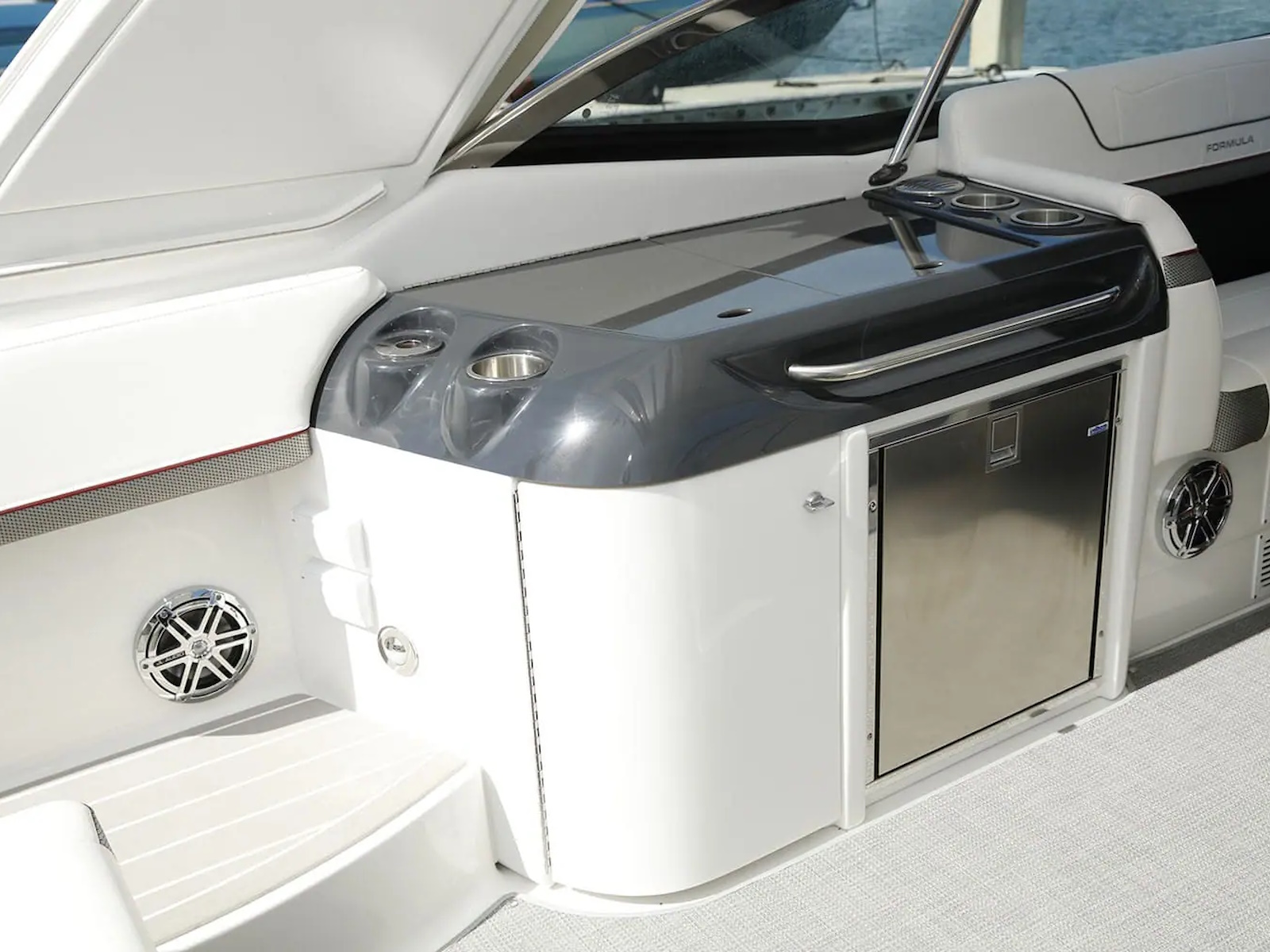 Swim platform: Enjoy an extended water sport and swim platform with under-mount swim seats and four drink holders, so you can spend the day doing what you love with easy access to everything you need. - WET BAR: Craft unforgettable drinks with the molded wet bar with an integrated sink, sleek Corian® countertop and pull-out stainless steel refrigerator unit. The wet bar also includes a compartment with a trash container inside, so clean-up is a breeze.