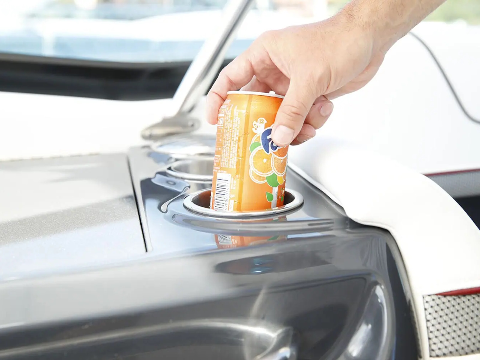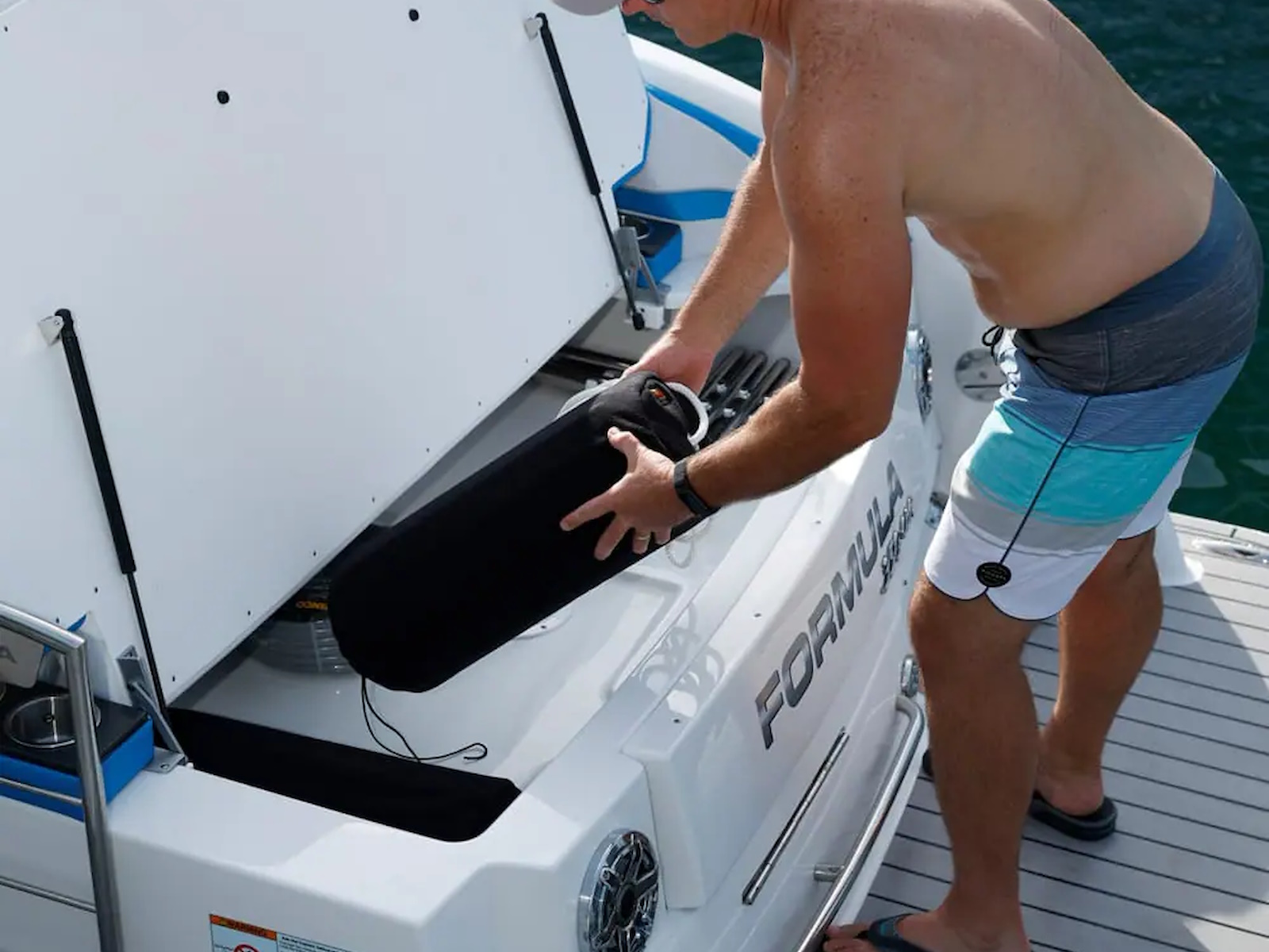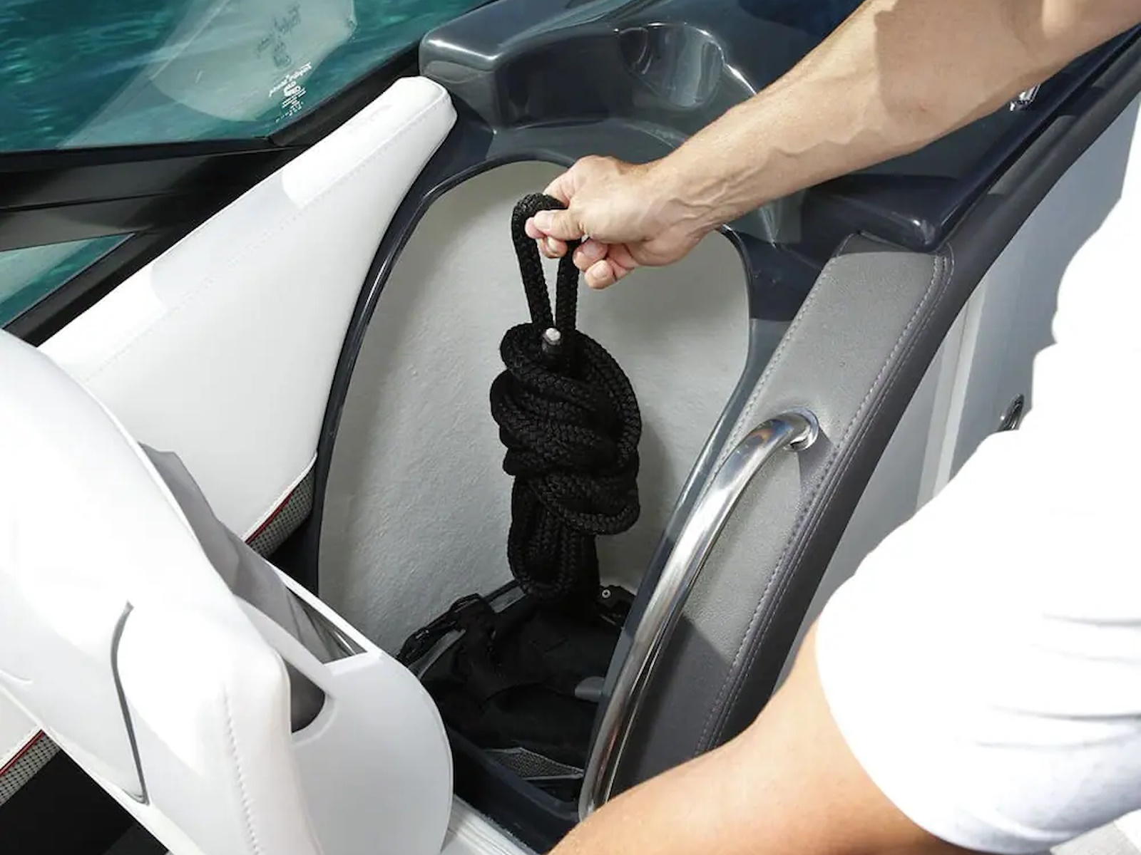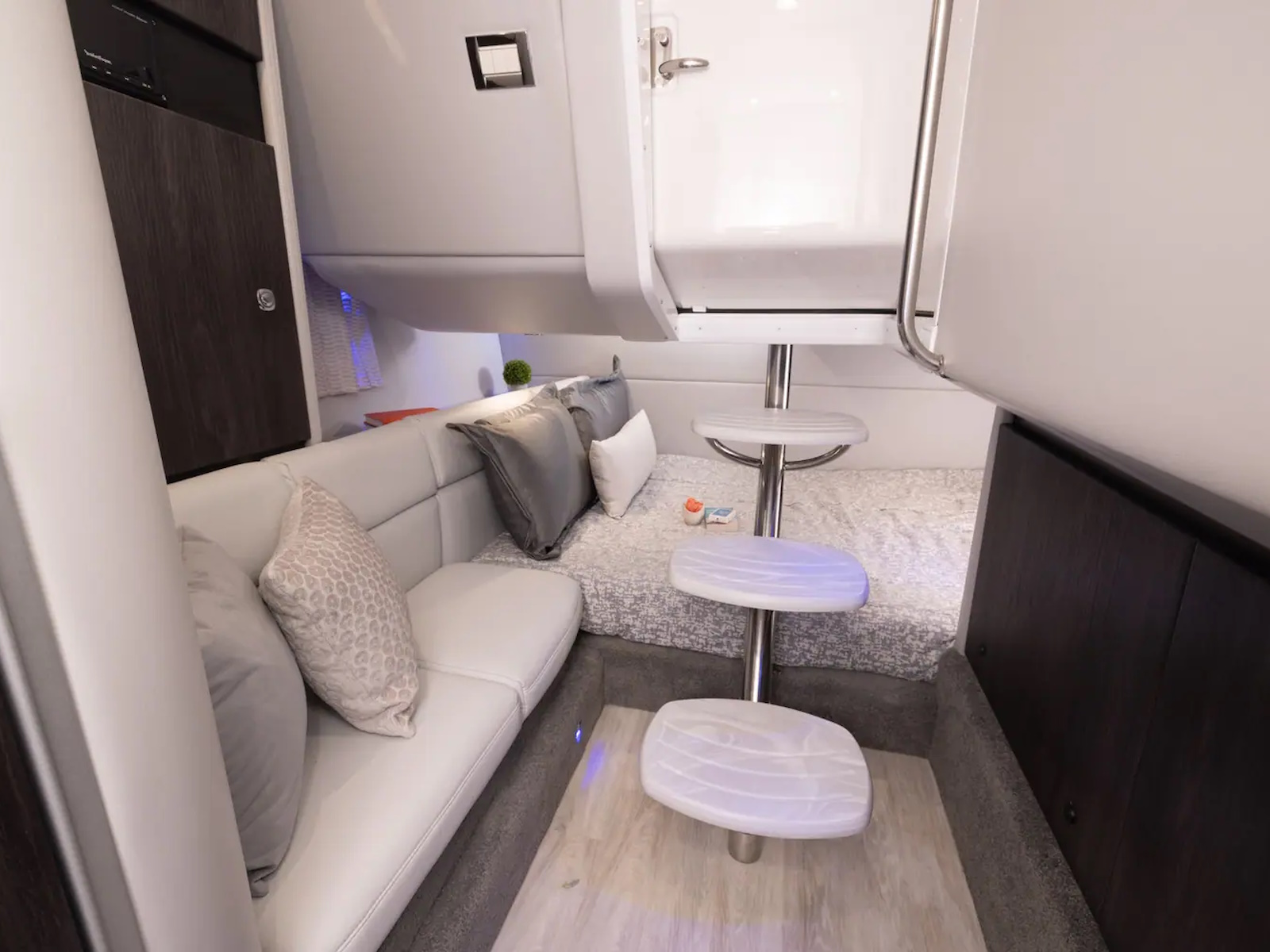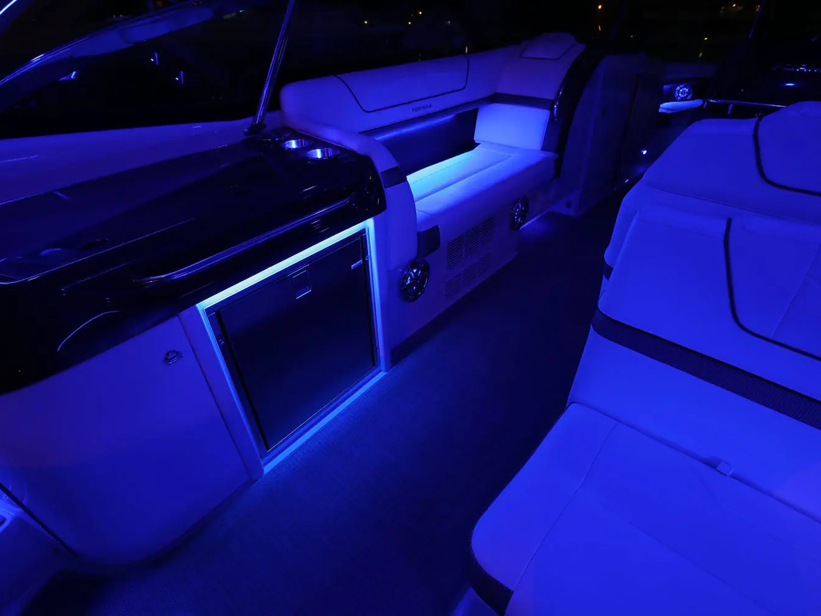 Swim platform: Enjoy an extended water sport and swim platform with under-mount swim seats and four drink holders, so you can spend the day doing what you love with easy access to everything you need. - WET BAR: Craft unforgettable drinks with the molded wet bar with an integrated sink, sleek Corian® countertop and pull-out stainless steel refrigerator unit. The wet bar also includes a compartment with a trash container inside, so clean-up is a breeze.
