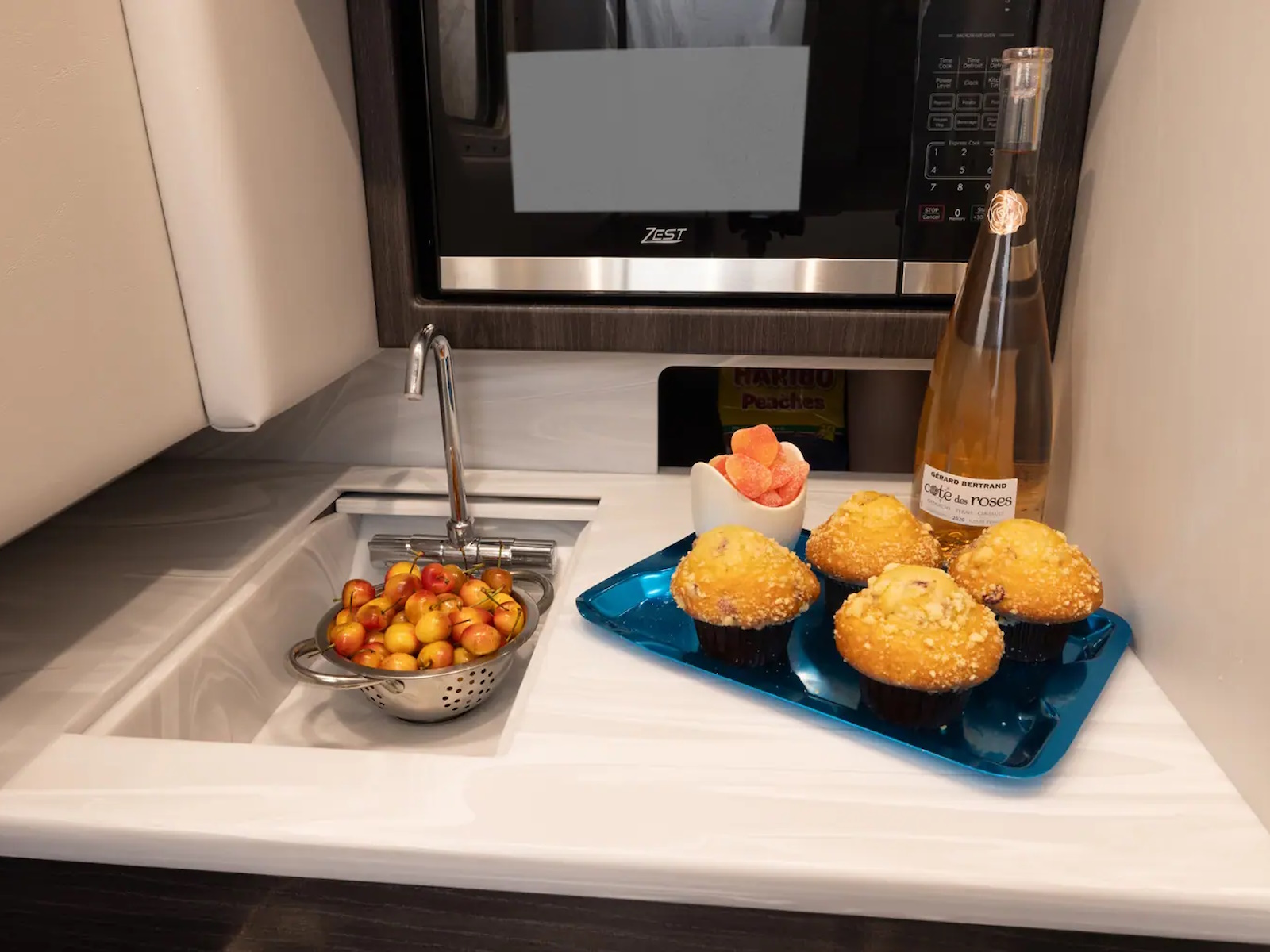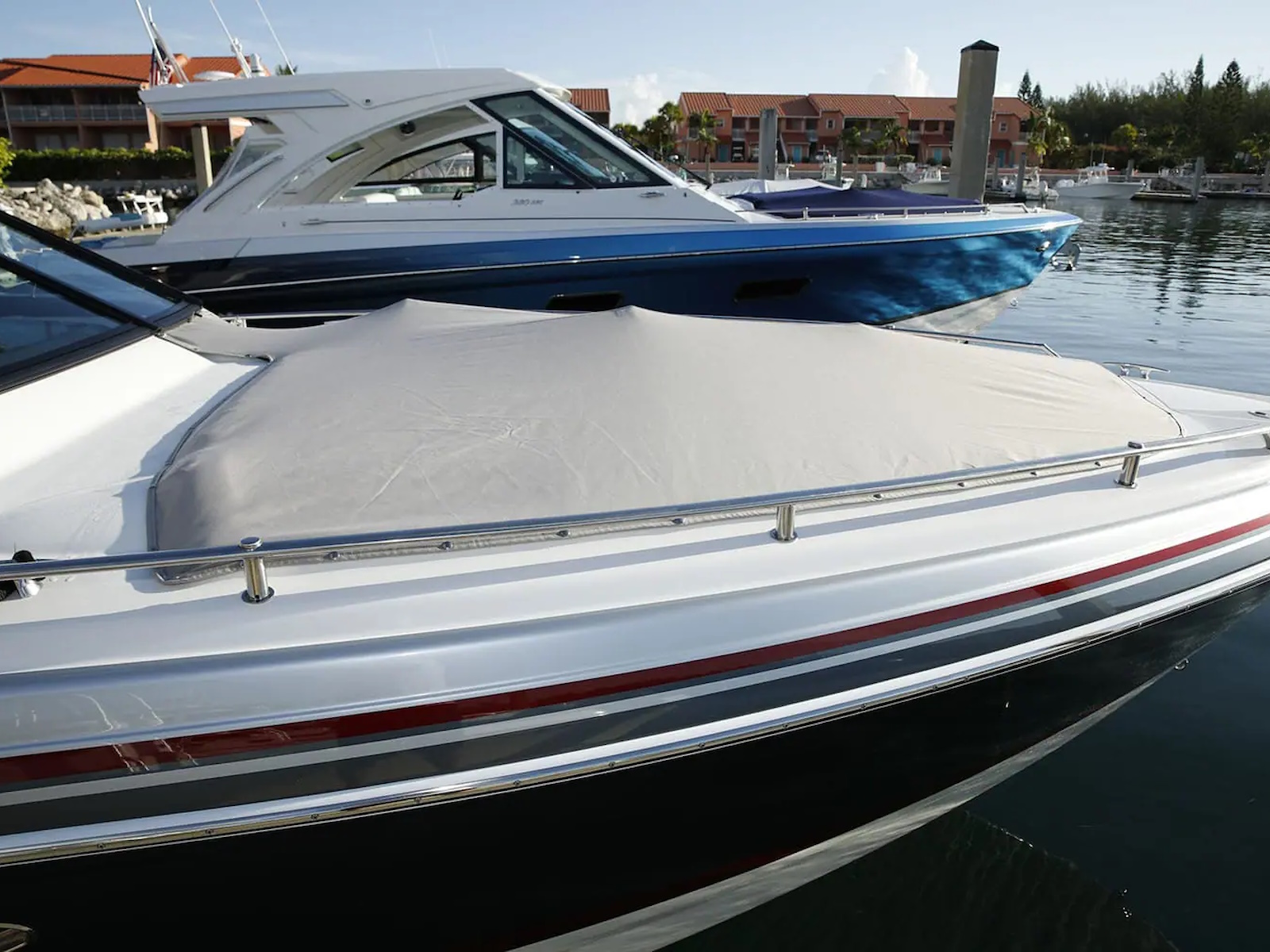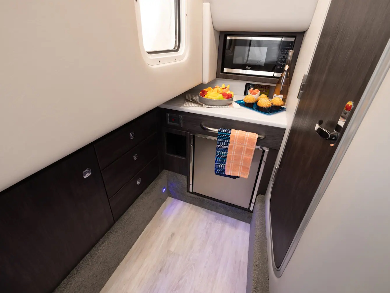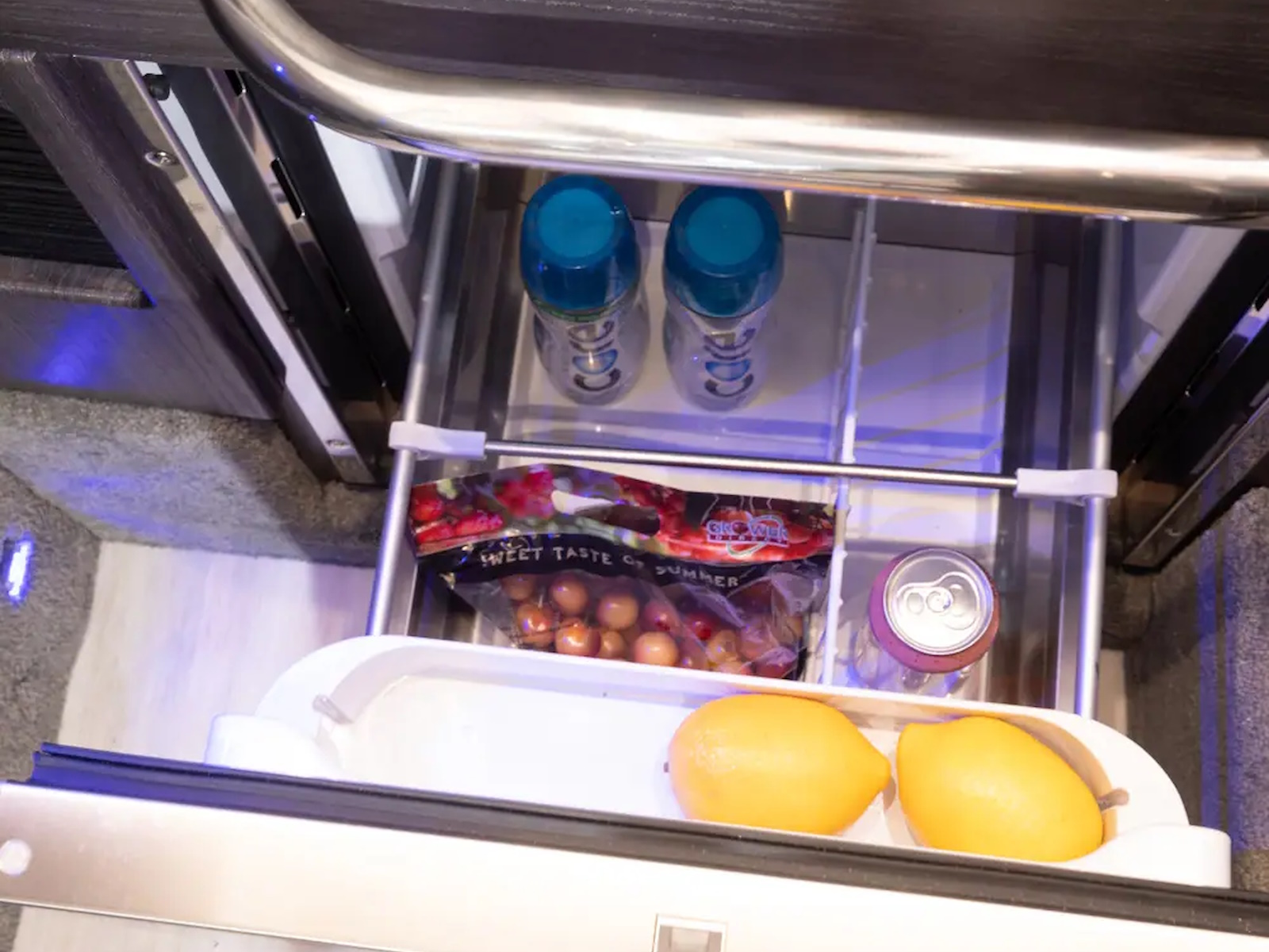 Swim platform: Enjoy an extended water sport and swim platform with under-mount swim seats and four drink holders, so you can spend the day doing what you love with easy access to everything you need. - WET BAR: Craft unforgettable drinks with the molded wet bar with an integrated sink, sleek Corian® countertop and pull-out stainless steel refrigerator unit. The wet bar also includes a compartment with a trash container inside, so clean-up is a breeze.