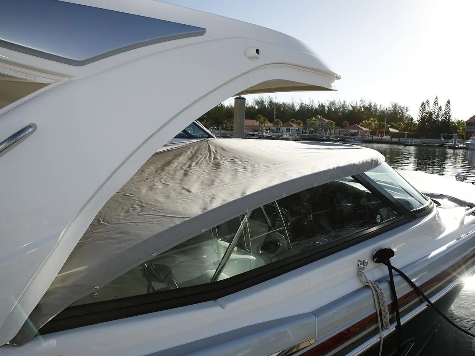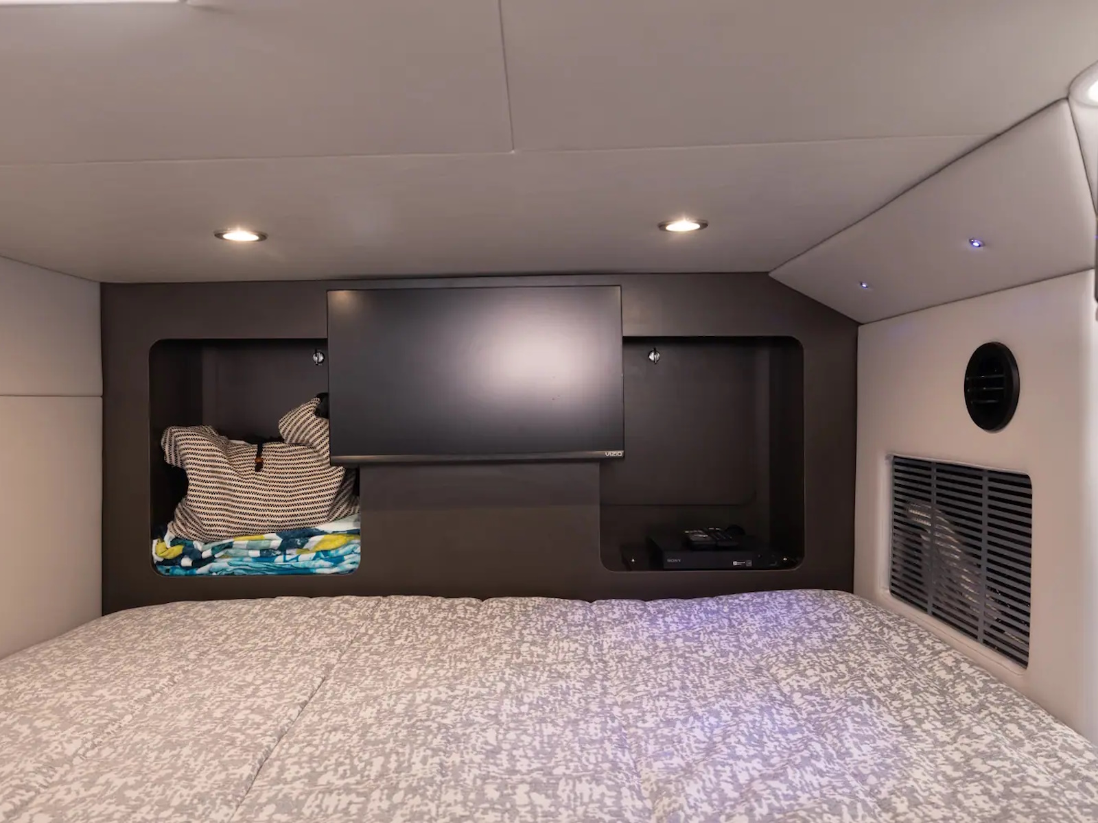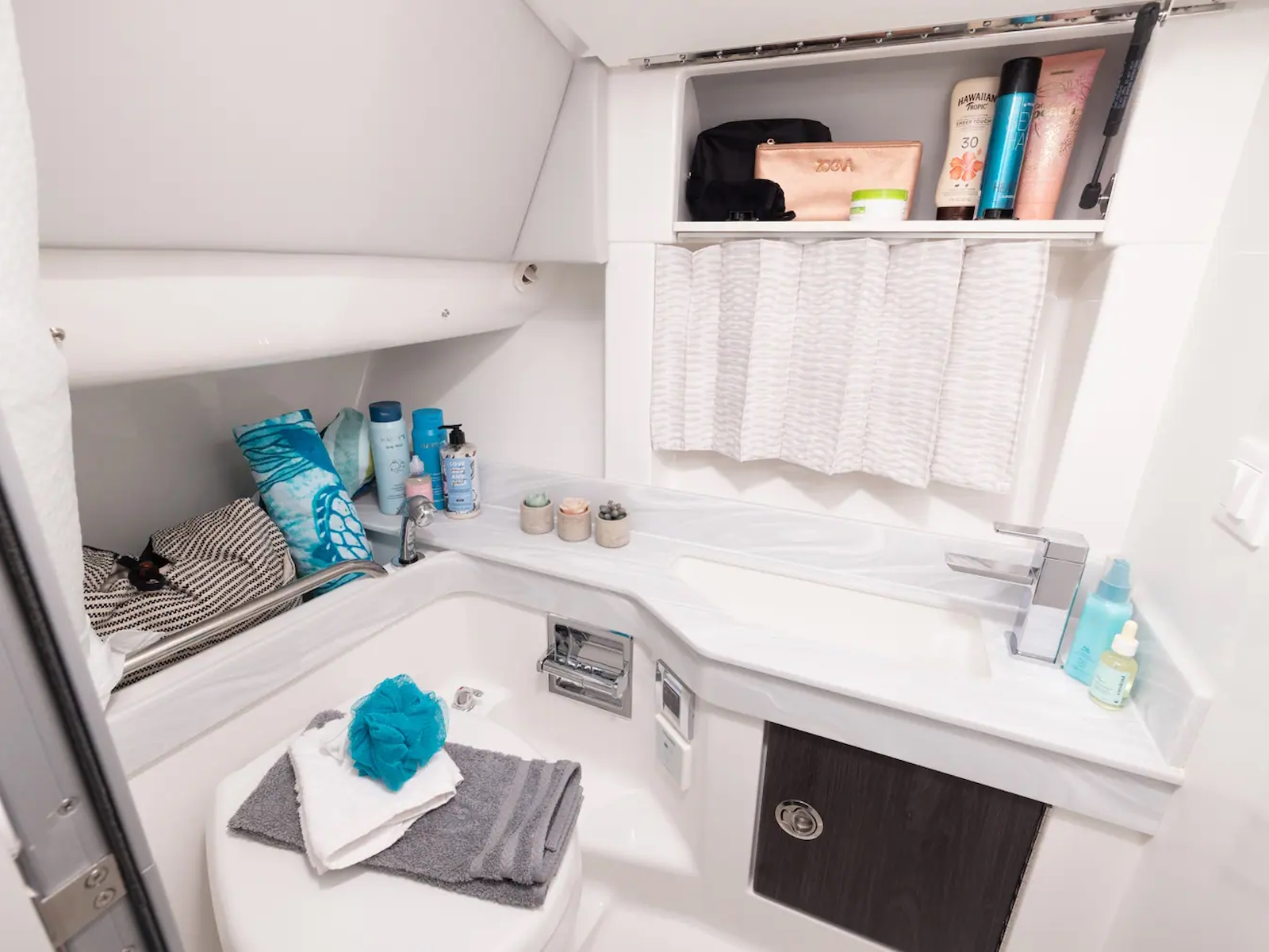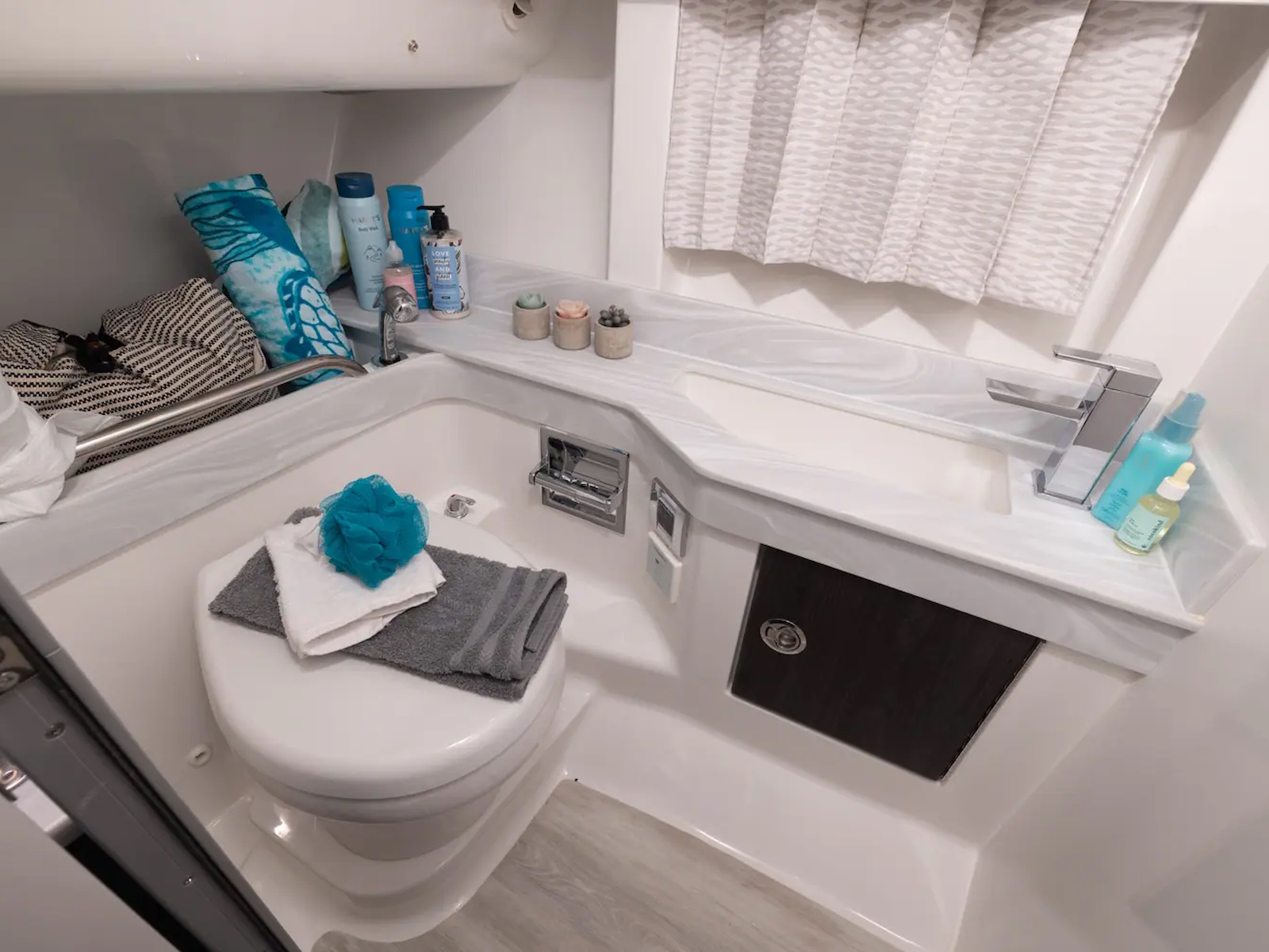 - FULL SIZE HEAD: The head compartment come with a VacuFlush® head unit, 37-gallon holding tank and dockside pumpout, It also features a vanity, custom molded sink with faucet, Corian counter top, retractable showerhead, exhaust fan and woodgrain-finish flooring.