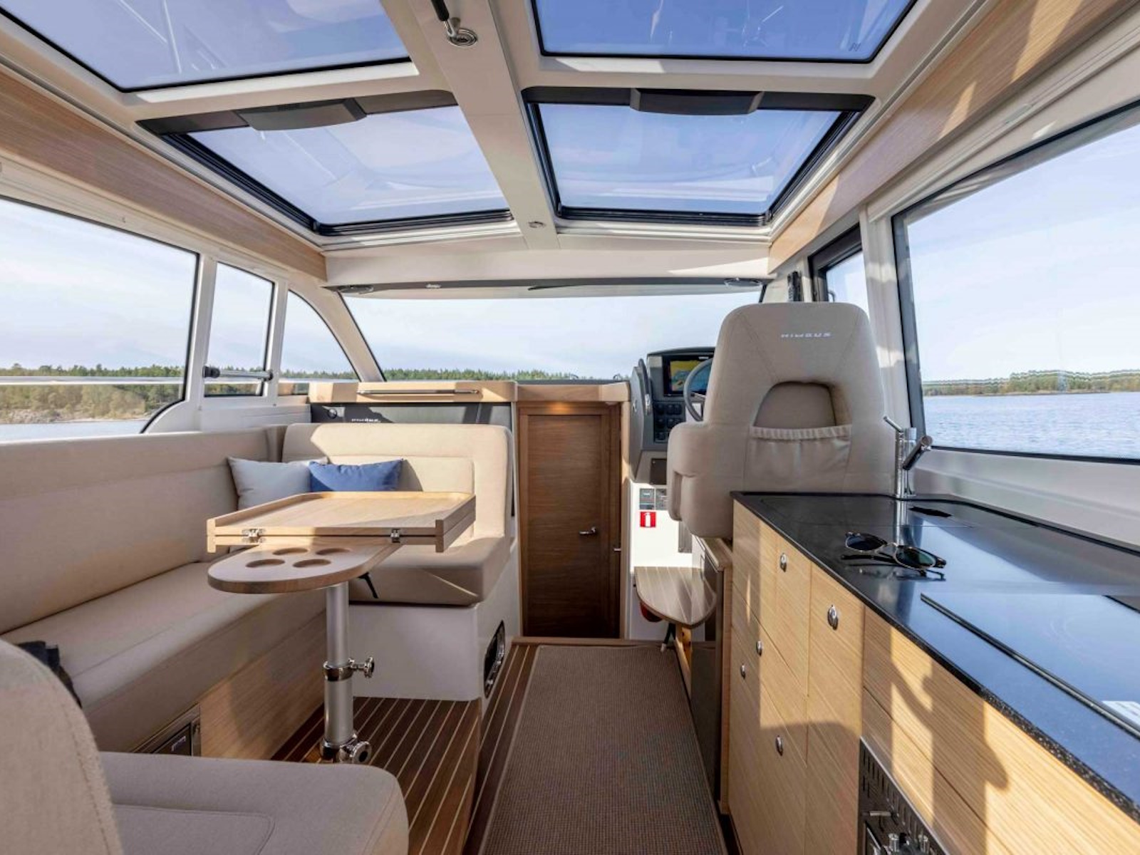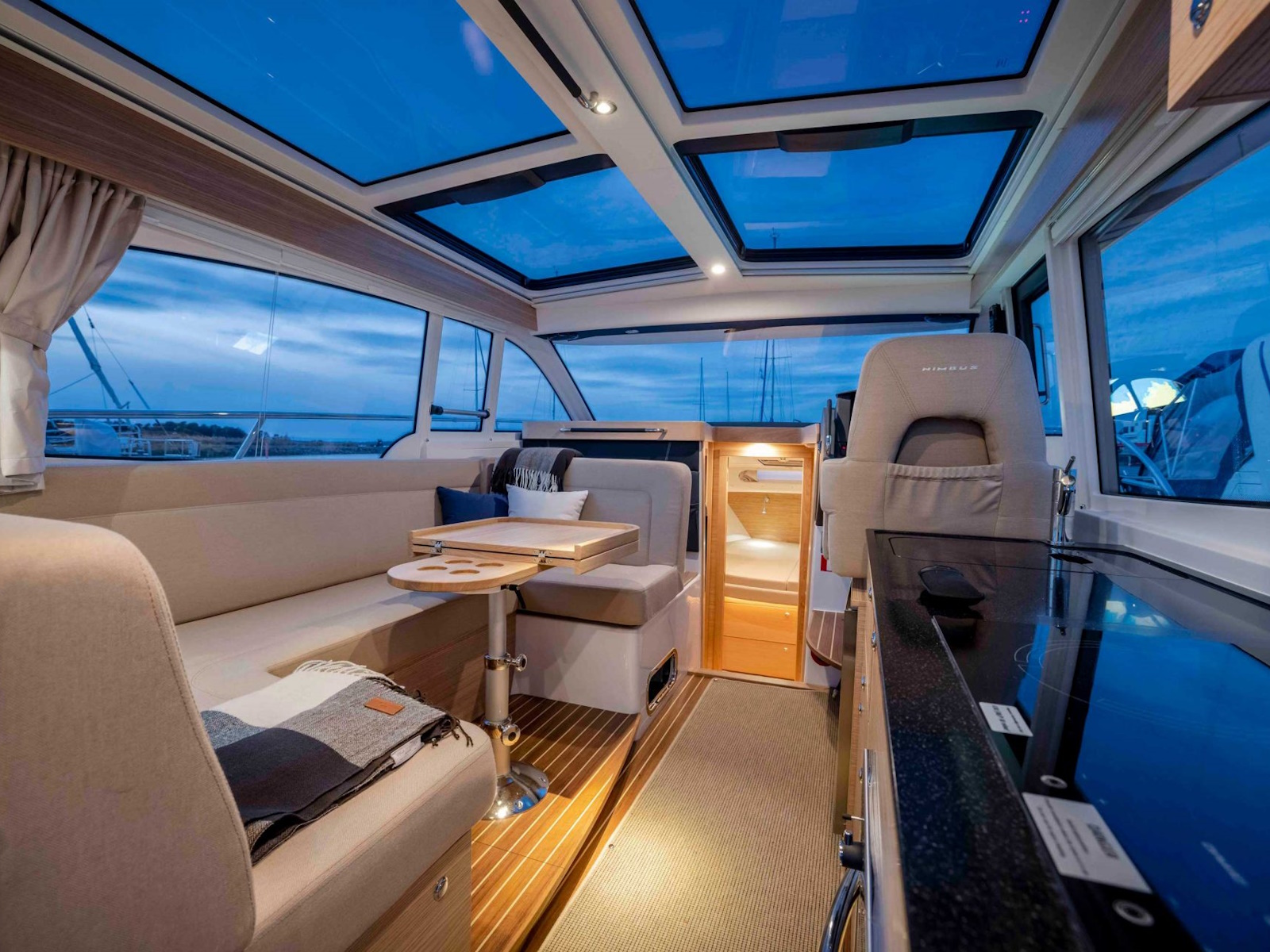 The model year 2022 for Nimbus 365 offers some exciting modifications that will improve the look of the boat, both exterior as well as interior. The side cabin portlight has changed shape and doubled in size, offering more natural light in the cabin. All portlights are also painted in a fresh white color, which, in combination with their new shape and size, result in a more modern look and feel throughout. Additionally, a new Nordic Oak wood finish is available. The oak, in combination with a new cushion fabric color “Carbon Beige”, and the new roof panel in “anthracite” above the dashboard gives the boat a light, modern, and elegant Scandinavian touch.