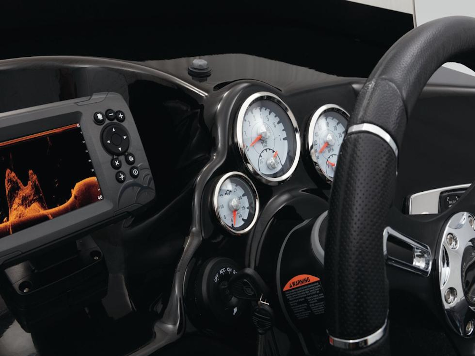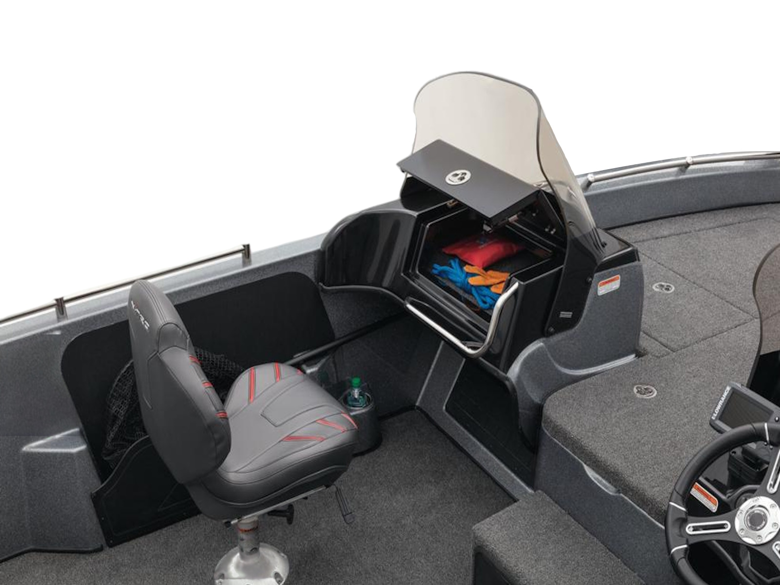 Inside, the front deck is perfect for casting and fishing with electronics thanks to its generous width. Underfoot are deep, gaskets storage boxes as well as provisions for a bait bucket and an insulated cooler. The dual-console design keeps the elements at bay and keeps your necessities on hand. A gimbal-mounted Lowrance® Eagle 5 fishfinder complements the gauge set and simple, intuitive switching at the helm.