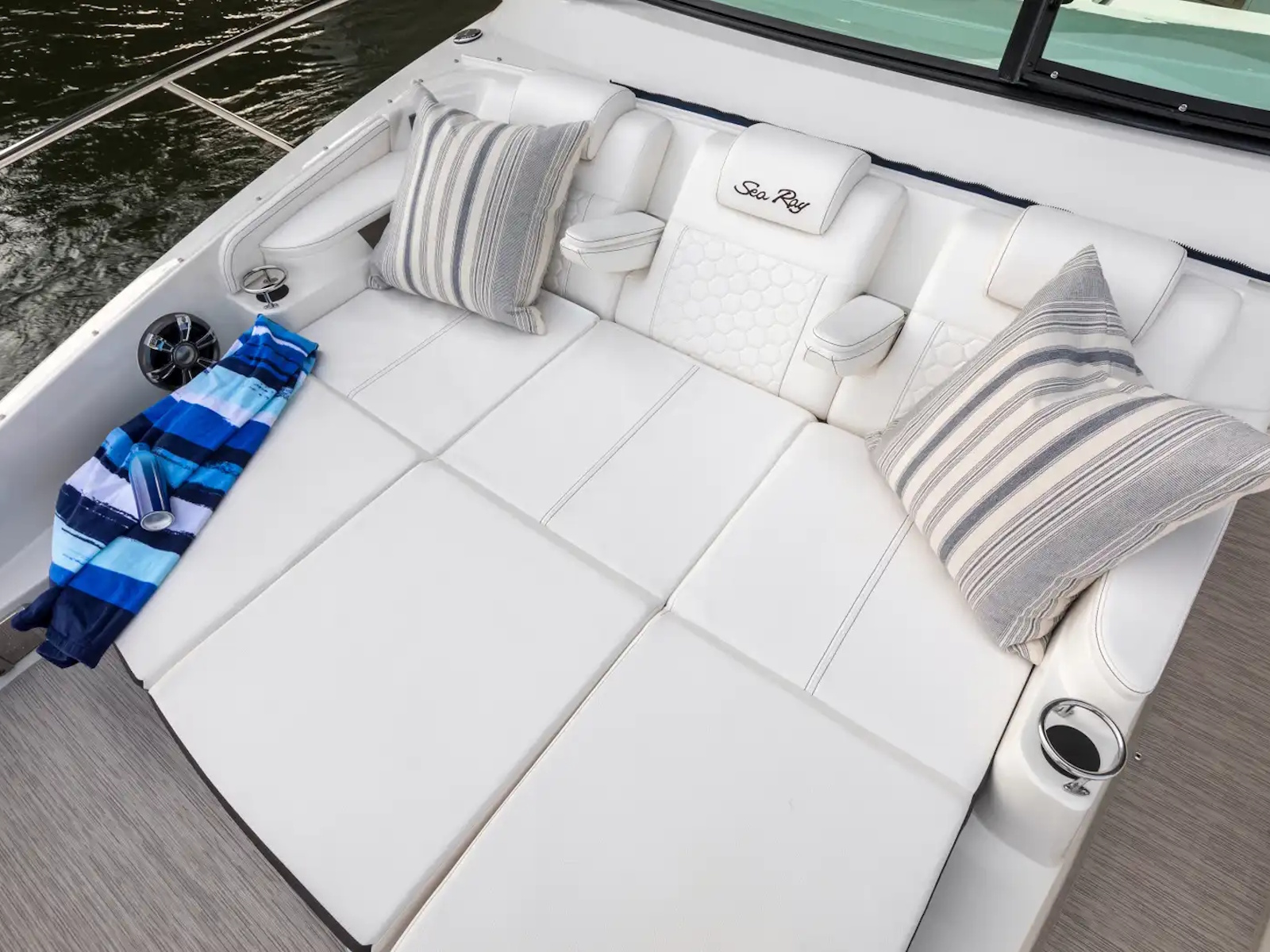 Expansive open bow lounging & seating area with actuated headrests and armrests on the Sundancer 320 Outboard, allow for perfect comfort while underway or at rest.