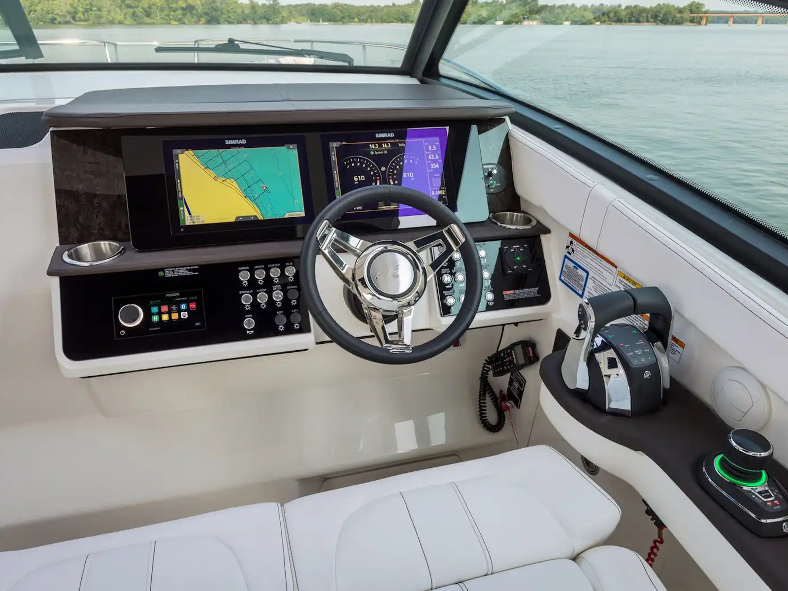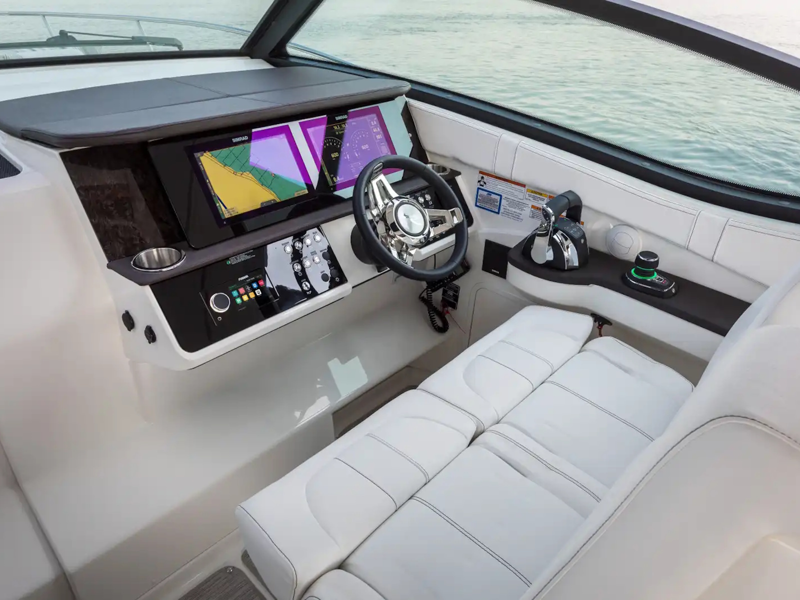 The intuitive helm station features a Dual Digital Dash with Simrad® touchscreen displays, ensuring you have all the information you need at your fingertips. The dual helm seat provides all-day comfort for navigating your favorite waters