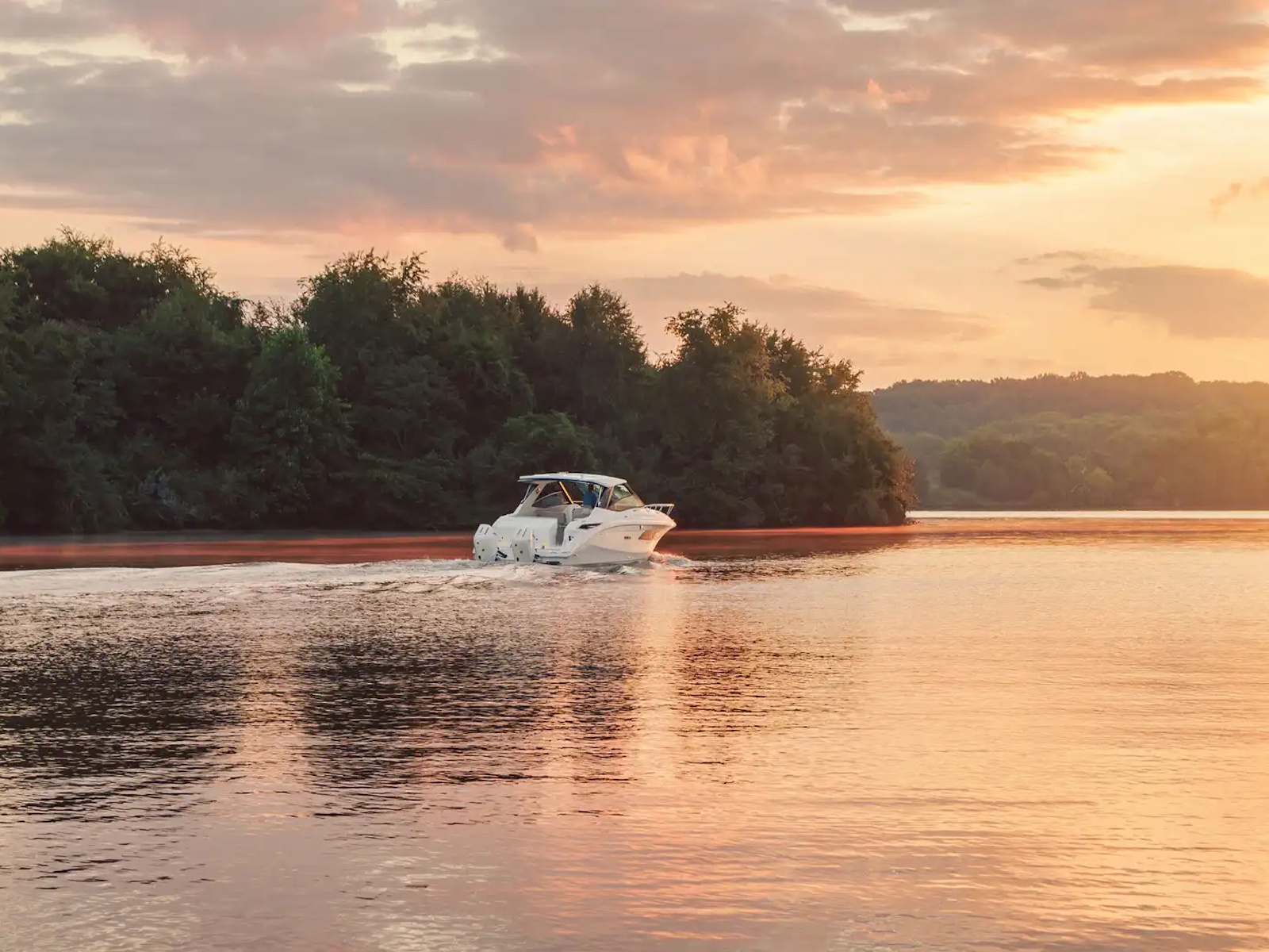 Enjoy every moment in a signature Sea Ray Sundancer. Every inch of a Sea Ray cruiser is attended to with expertly appointed textures, finishes and details that transform a beautiful boat into a second home. Solid-surfaced countertops, stainless-steel trim, fully finished head compartments and multi-tone upholstery shine below with a gleam that invites you to stay.
