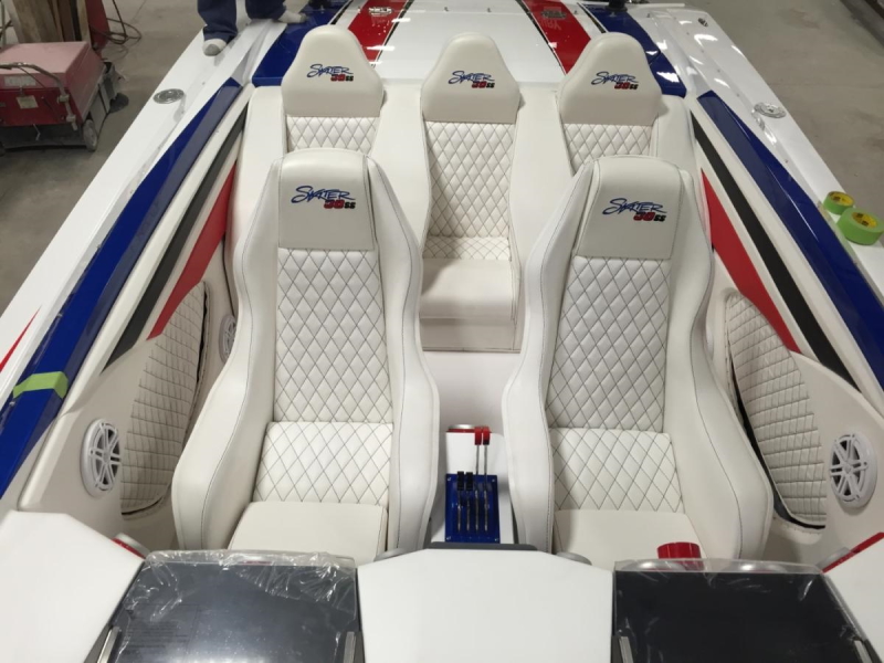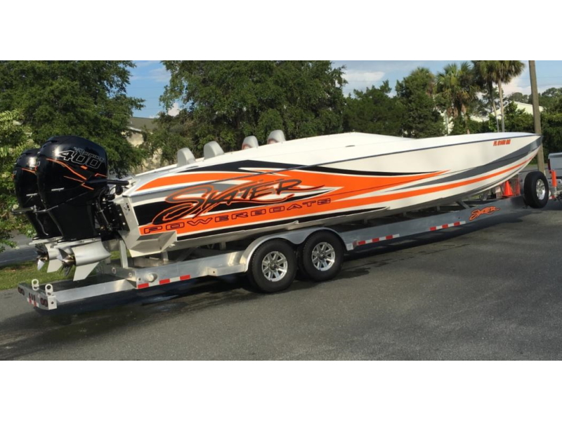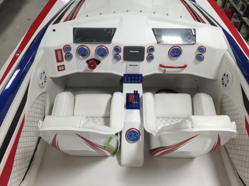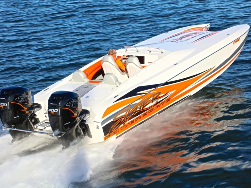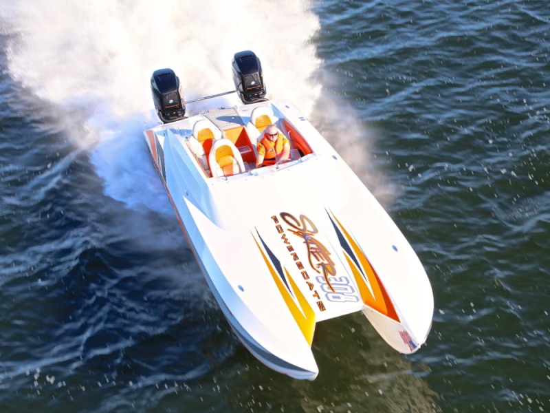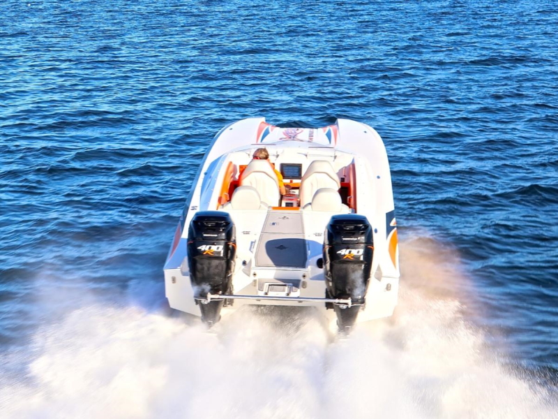 For those that like the user-friendly attributes of an outboard boat but want to step up into the 30’+ size range, the 308 Skater is the boat to have. It has all the great performance qualities of the venerable 28, in a scaled-up package that provides a more comfortable ride in rougher waters. The sleek deck fairing with raiseable windshields at the touch of a button provide the best of both worlds – wind in your face good times when you want it, and protection from the wind when you need it. The cockpit has seating for 5, with a large molded-in rear hatch for storage in the back. Mercury Racing’s venerable 400Rs are the motors of choice for this model, providing speeds of up to 120mph and a range of over 500 miles with the standard 100-gallon fuel tanks. The 308 raised the bar for outboard powered catamarans, and with today’s new outboards is even better than ever.