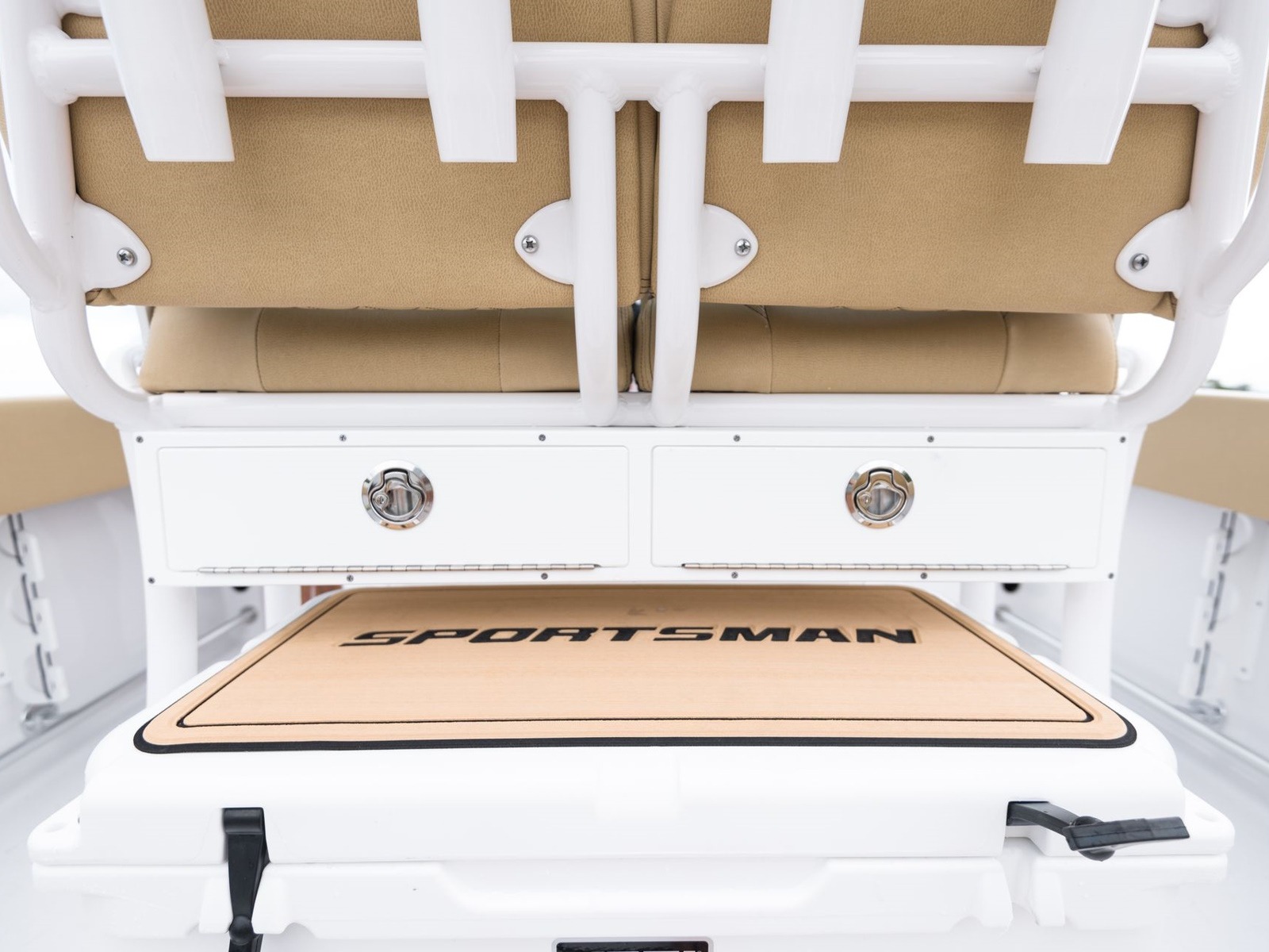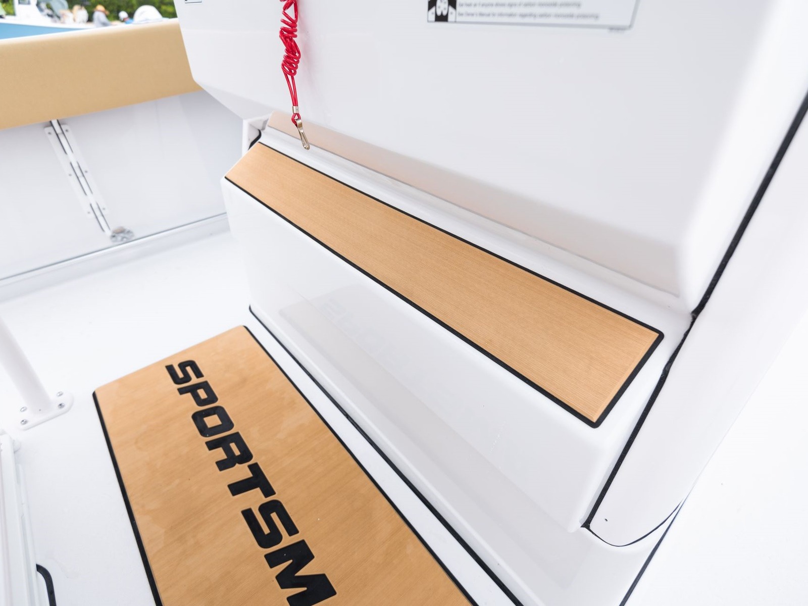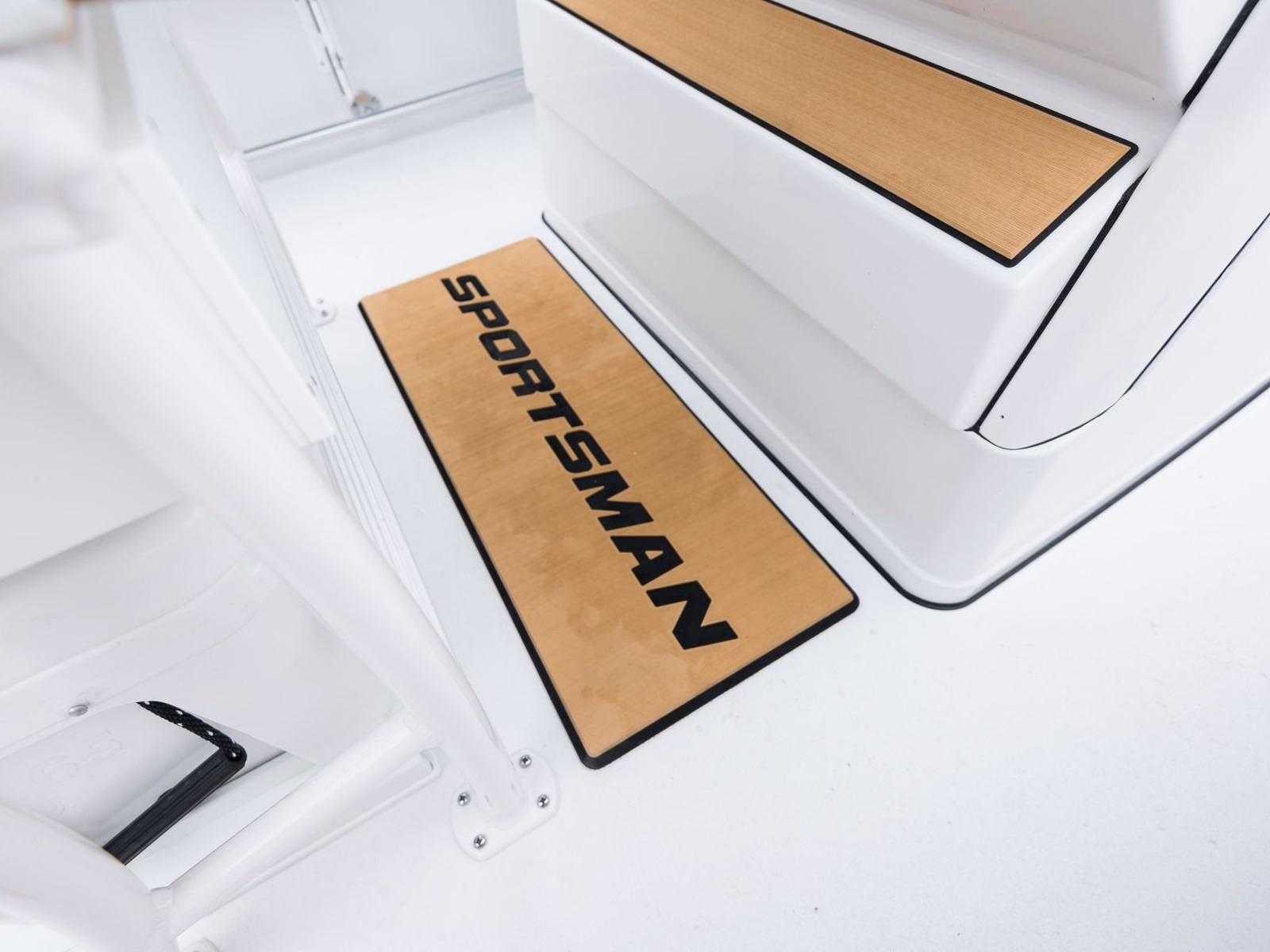 The console has molded in steps to offer a place to put your feet while the boat is underway. They are topped with custom pads with the Sportsman logo.