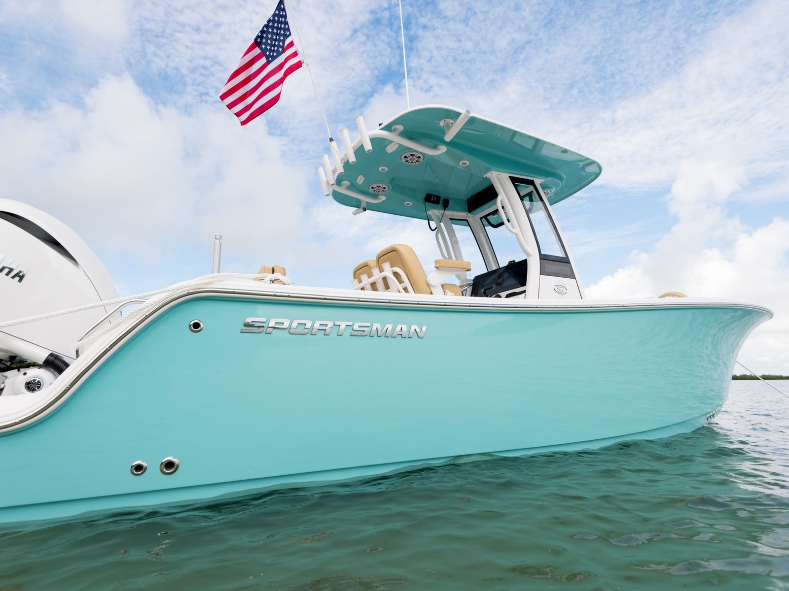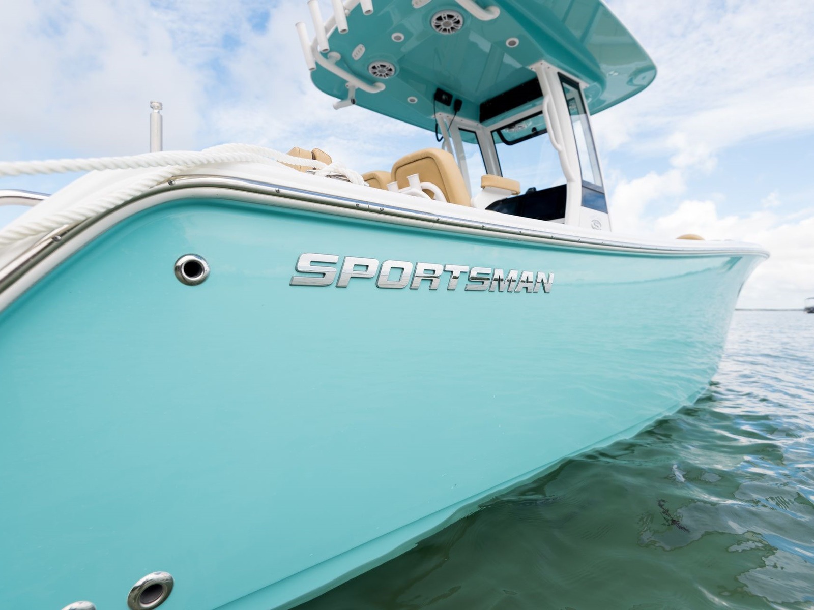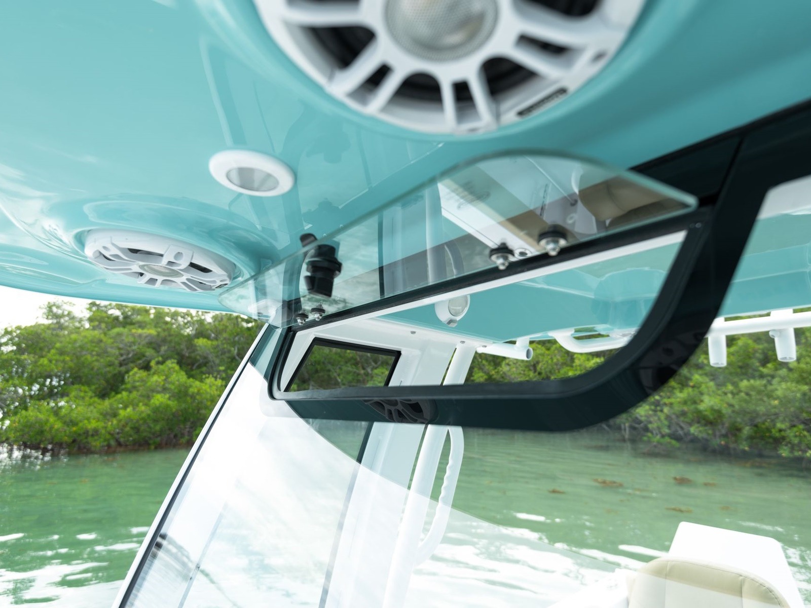 The boat's console stands out as a unique aspect of its design, showcasing a stylish and contemporary appearance that perfectly complements the Sportsman design language. The console incorporates numerous ingenious components that enhance its aesthetic appeal and functionality. The console is designed with a d-tubing hard-top frame that's extruded from a single piece of aluminum. This unique design removes the frame legs from the deck, resulting in more space around the console and a sturdy frame structure. In addition, this design provides more interior space within the console. The starboard side of the console features the iconic Sportsman side window glass, which floods the interior space with light. The console is wrapped with a tempered glass enclosure that includes a manually actuated vent.