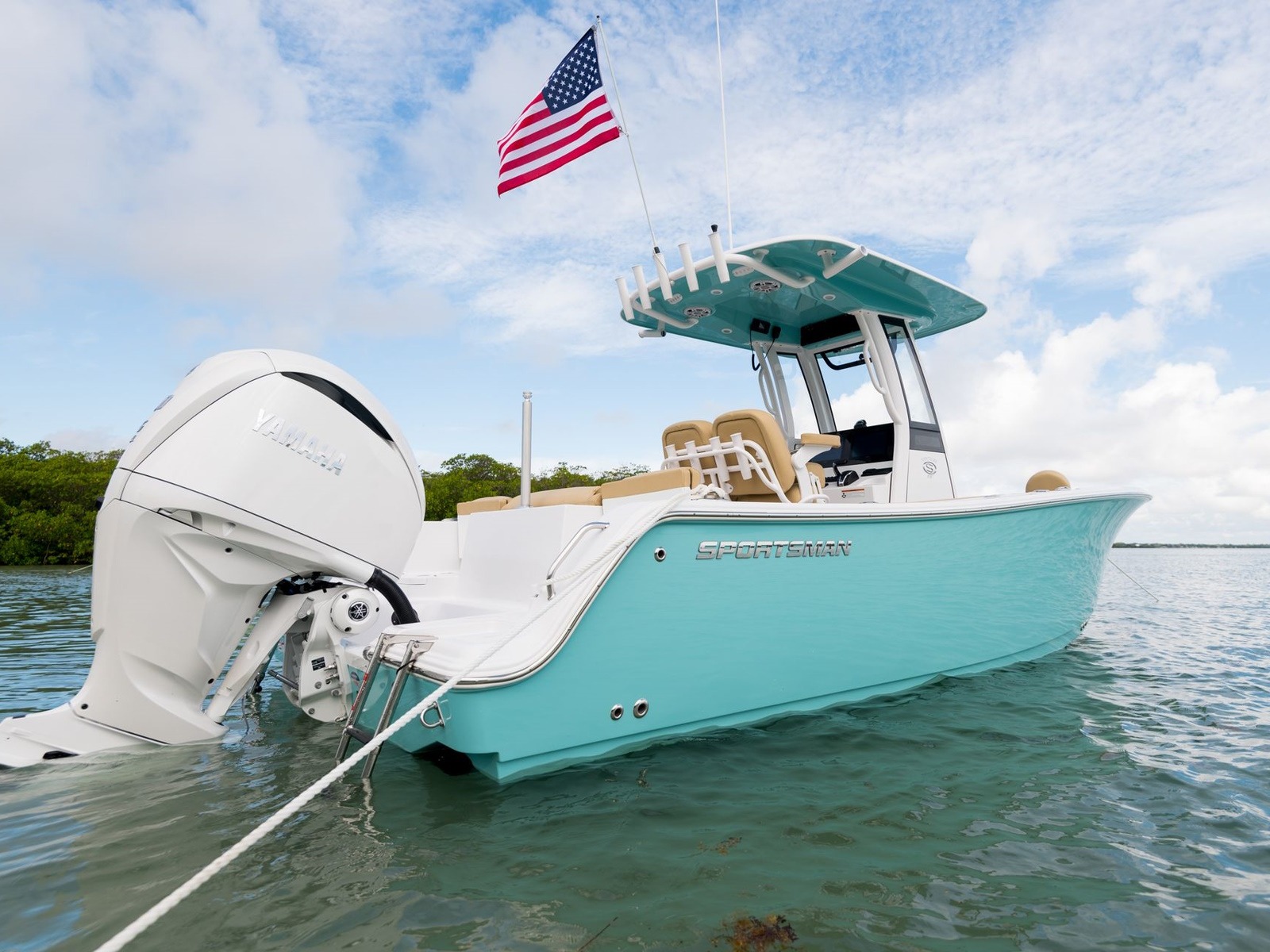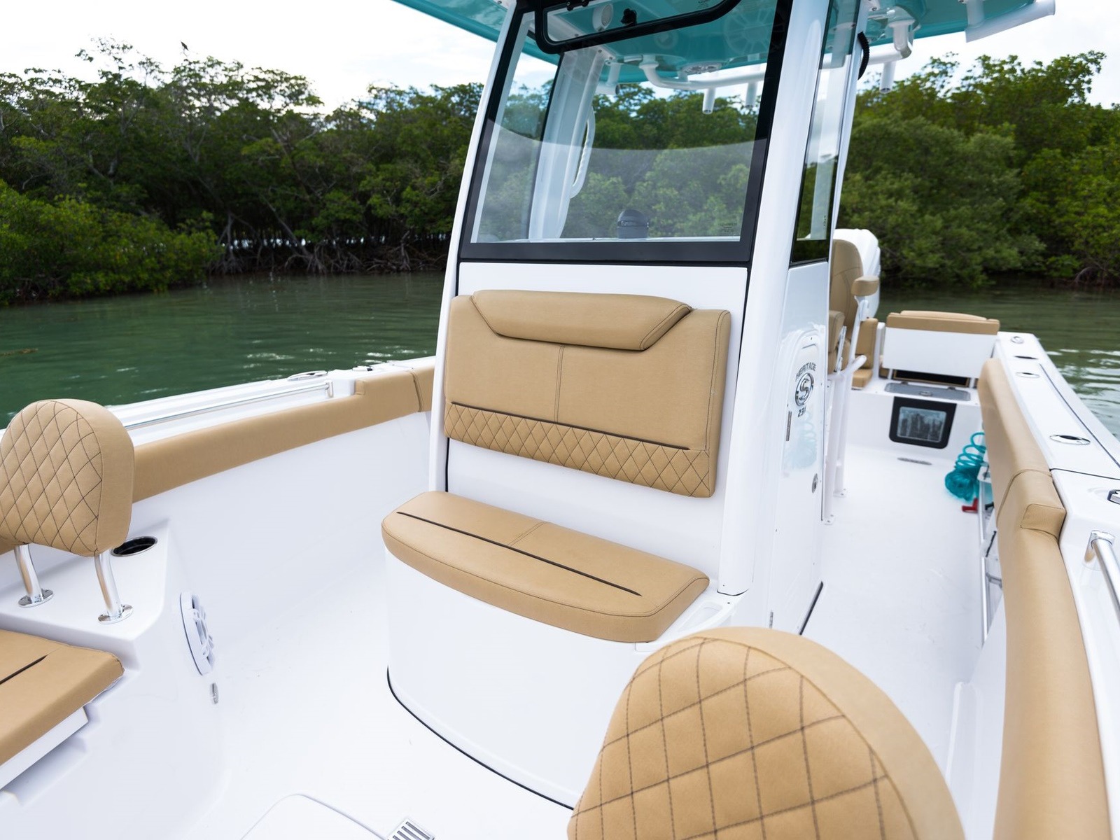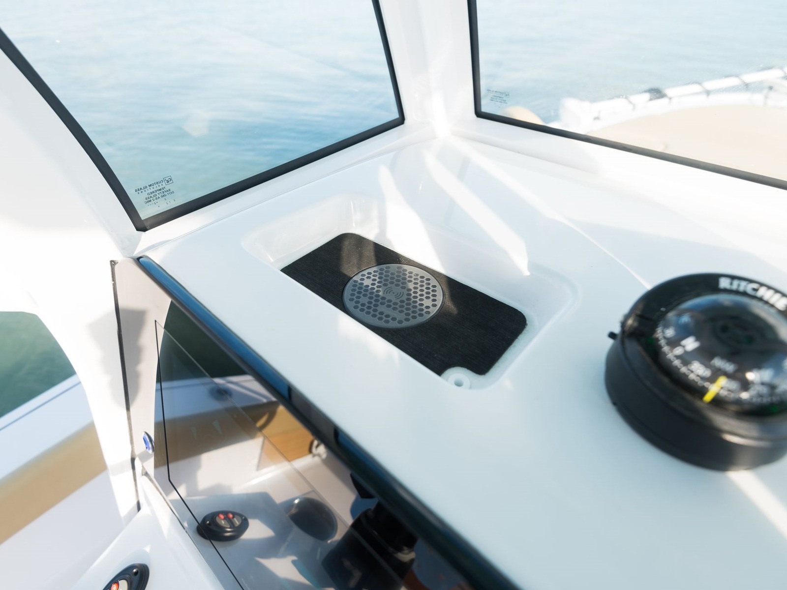 The boat's console stands out as a unique aspect of its design, showcasing a stylish and contemporary appearance that perfectly complements the Sportsman design language. The console incorporates numerous ingenious components that enhance its aesthetic appeal and functionality. The console is designed with a d-tubing hard-top frame that's extruded from a single piece of aluminum. This unique design removes the frame legs from the deck, resulting in more space around the console and a sturdy frame structure. In addition, this design provides more interior space within the console. The starboard side of the console features the iconic Sportsman side window glass, which floods the interior space with light. The console is wrapped with a tempered glass enclosure that includes a manually actuated vent.