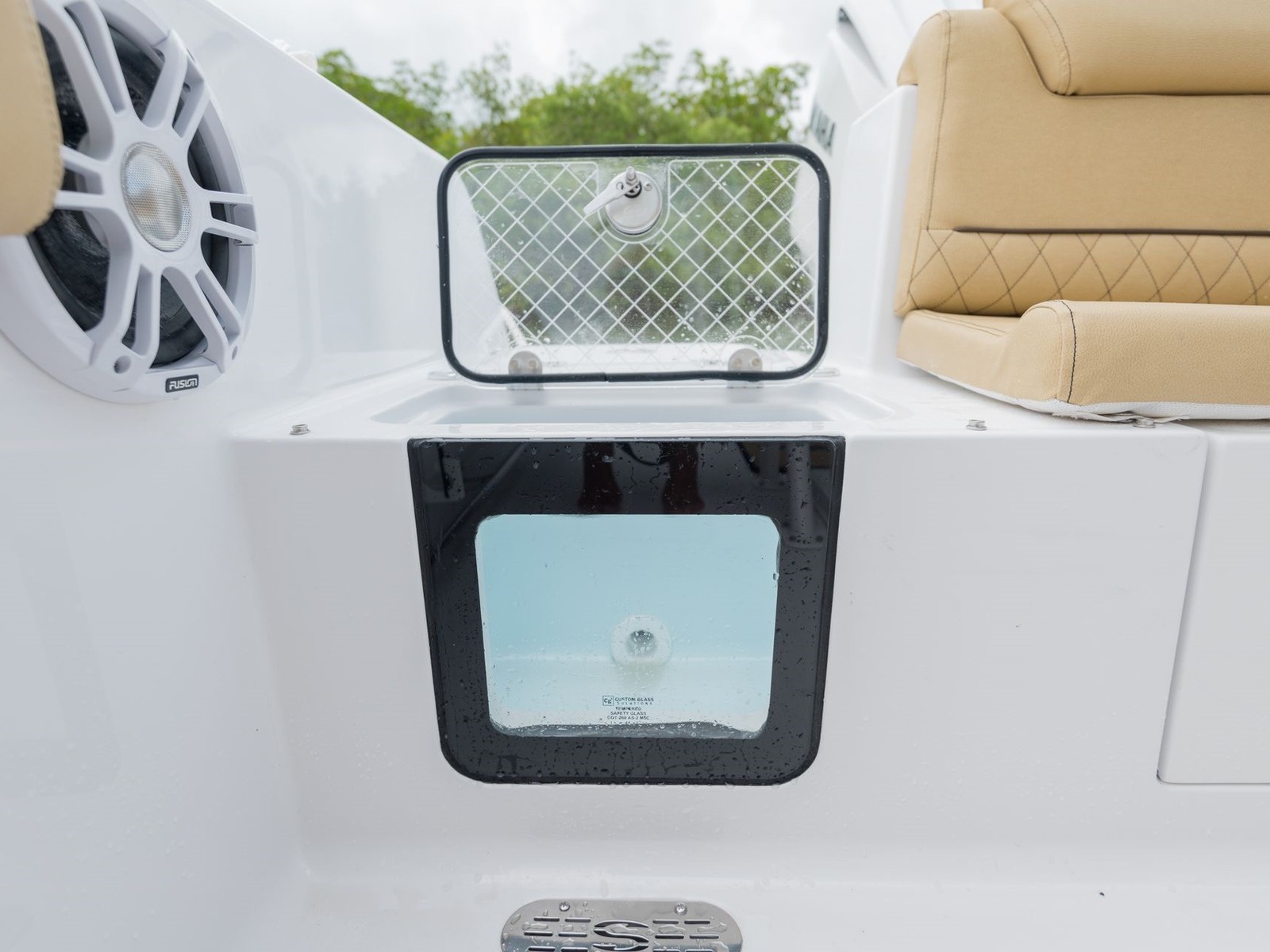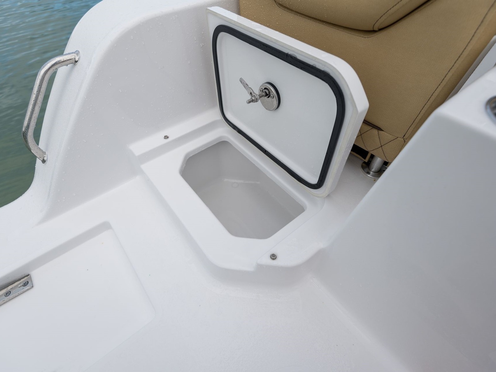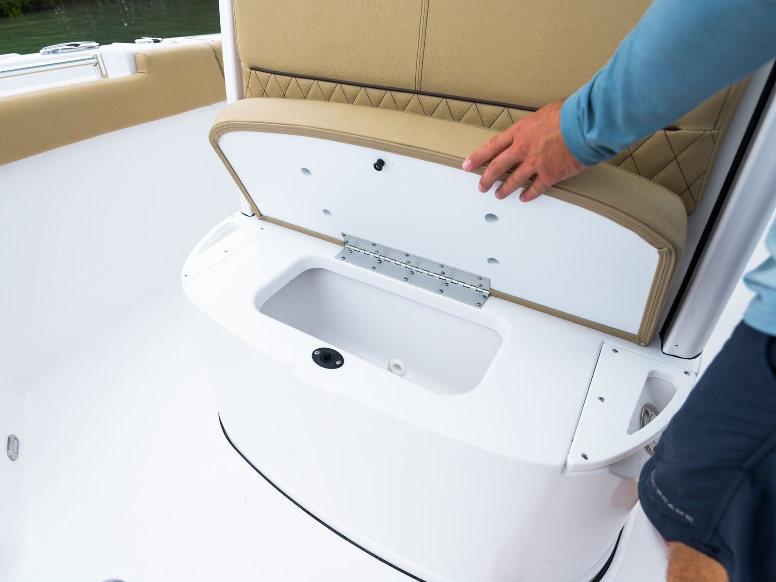 Flip the bottom cushion of the console-front seat to reveal an insulated cooler. Conveniently located for those sitting up front. You will also find the freshwater fill hidden under the cushion, if your boat is equipped with the freshwater system.