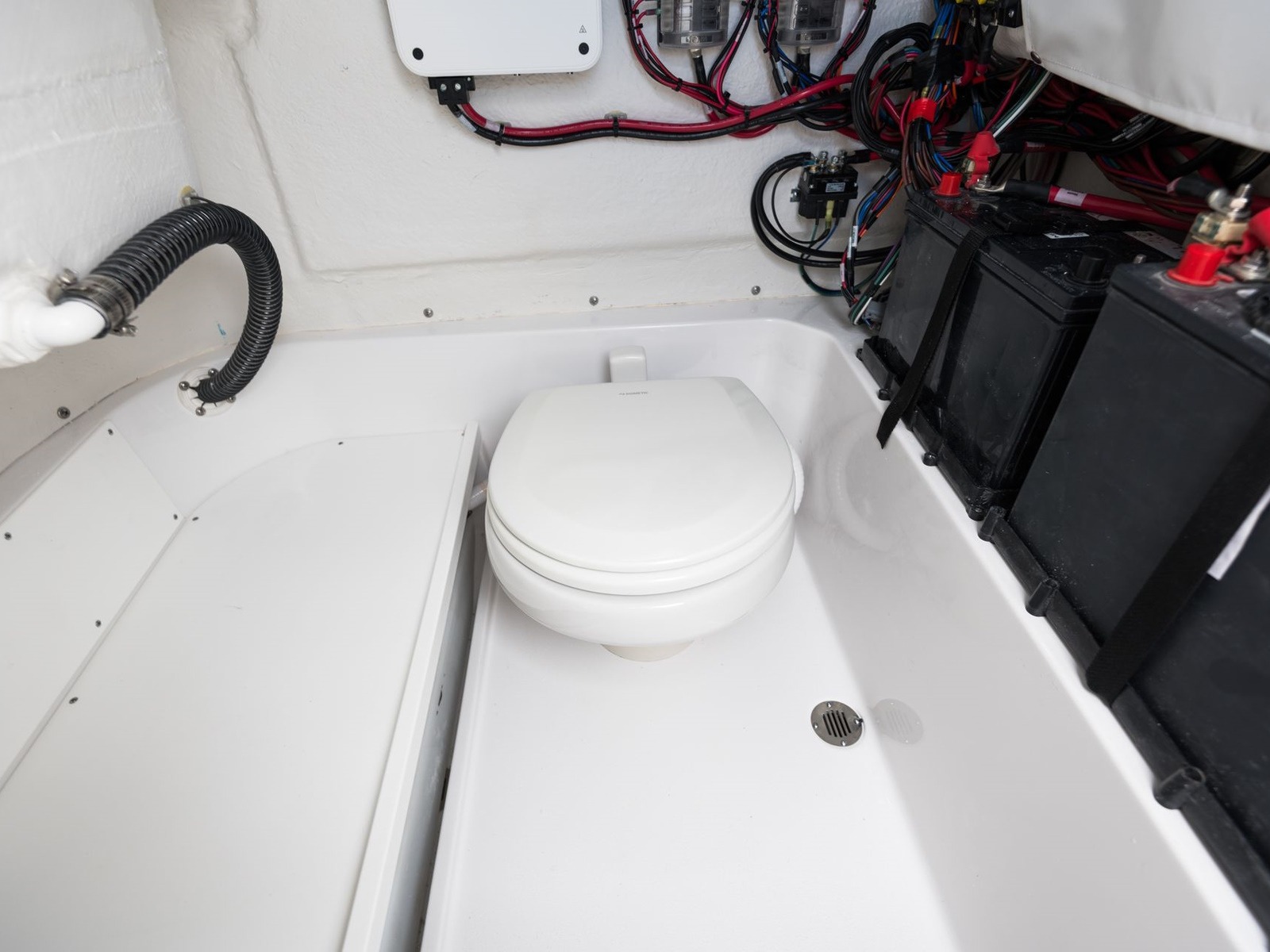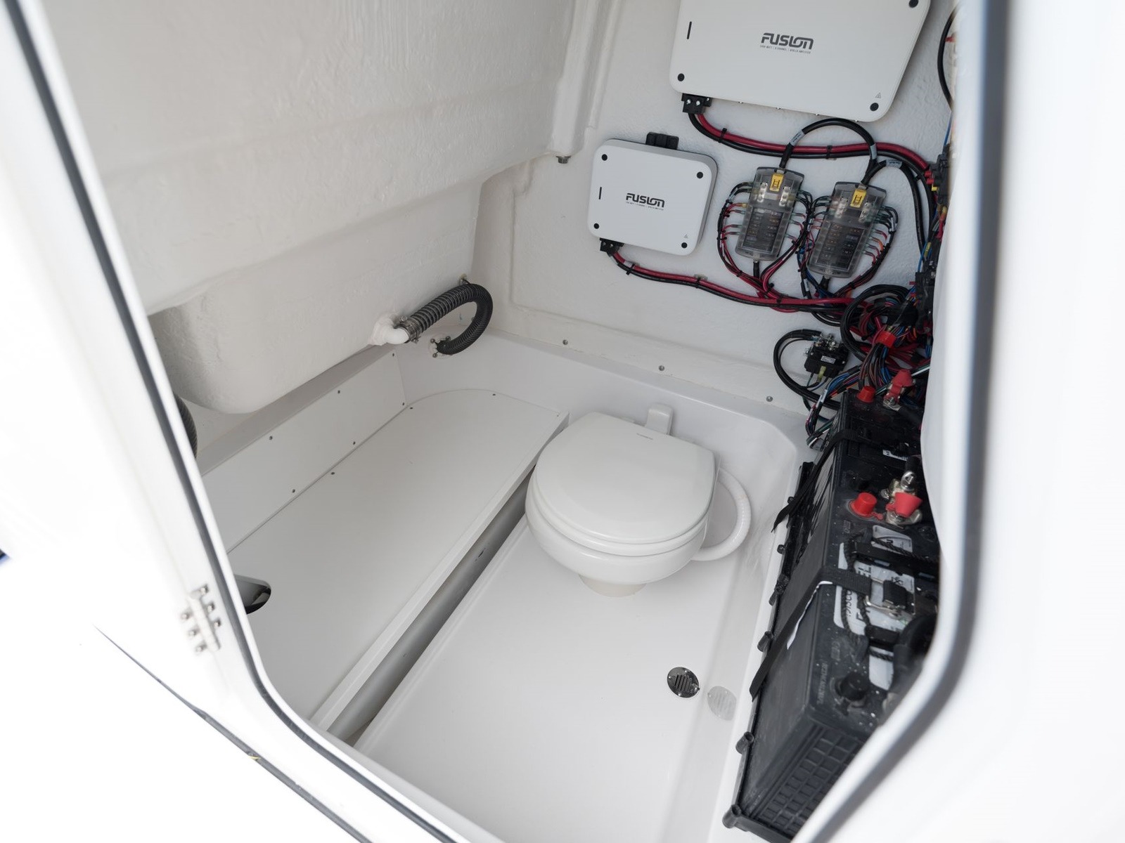Inside the console, there is a built-in lockable storage area. This enclosed space can be used as a changing room or storage of bulky items. On the back wall, there's access to all of the connections to the electronics and fuses, very convenient for quick troubleshooting. This space can also be optionally fitted with a porta potti or a full fresh water porcelain toilet with overboard discharge and pump out system.