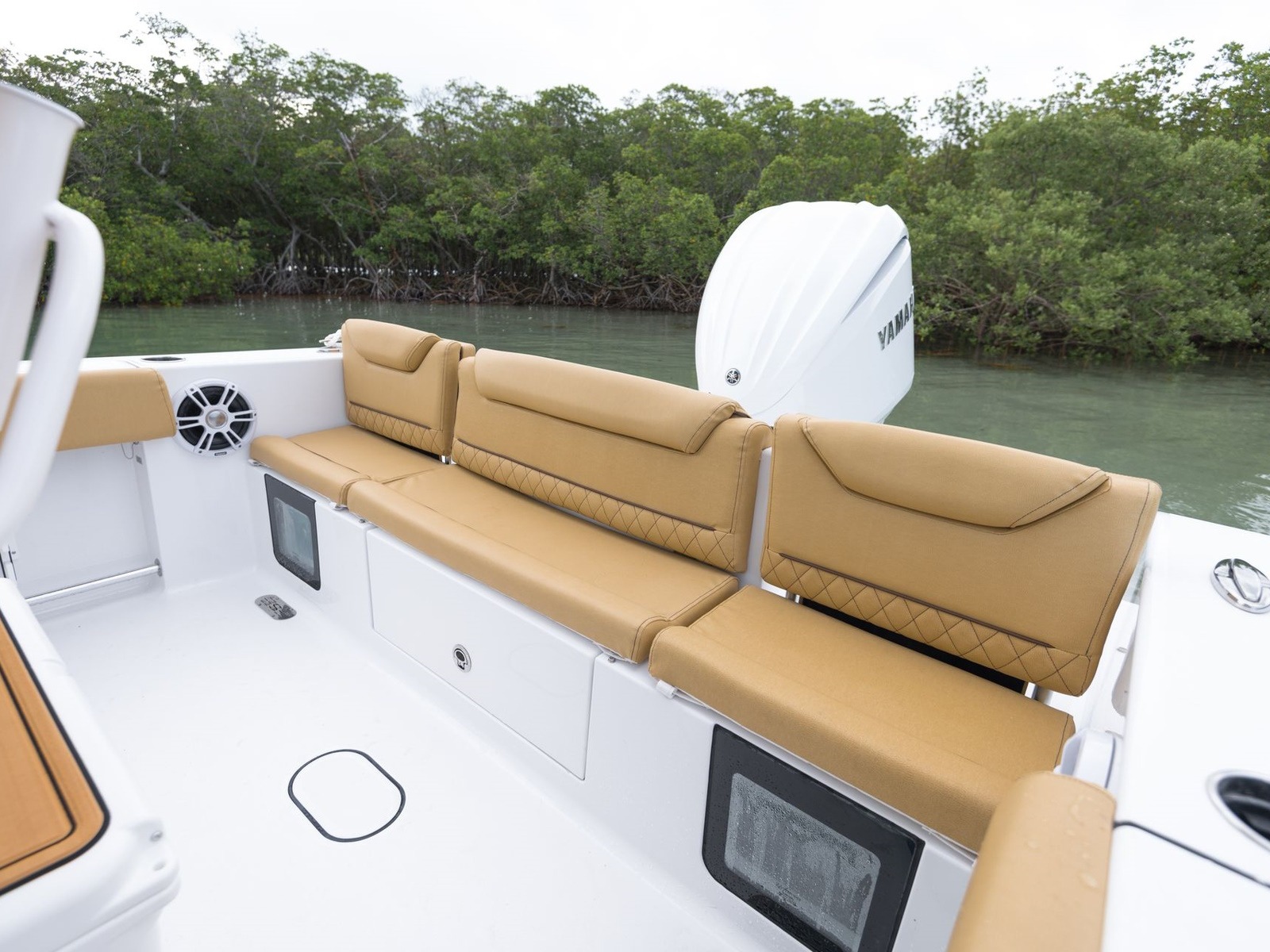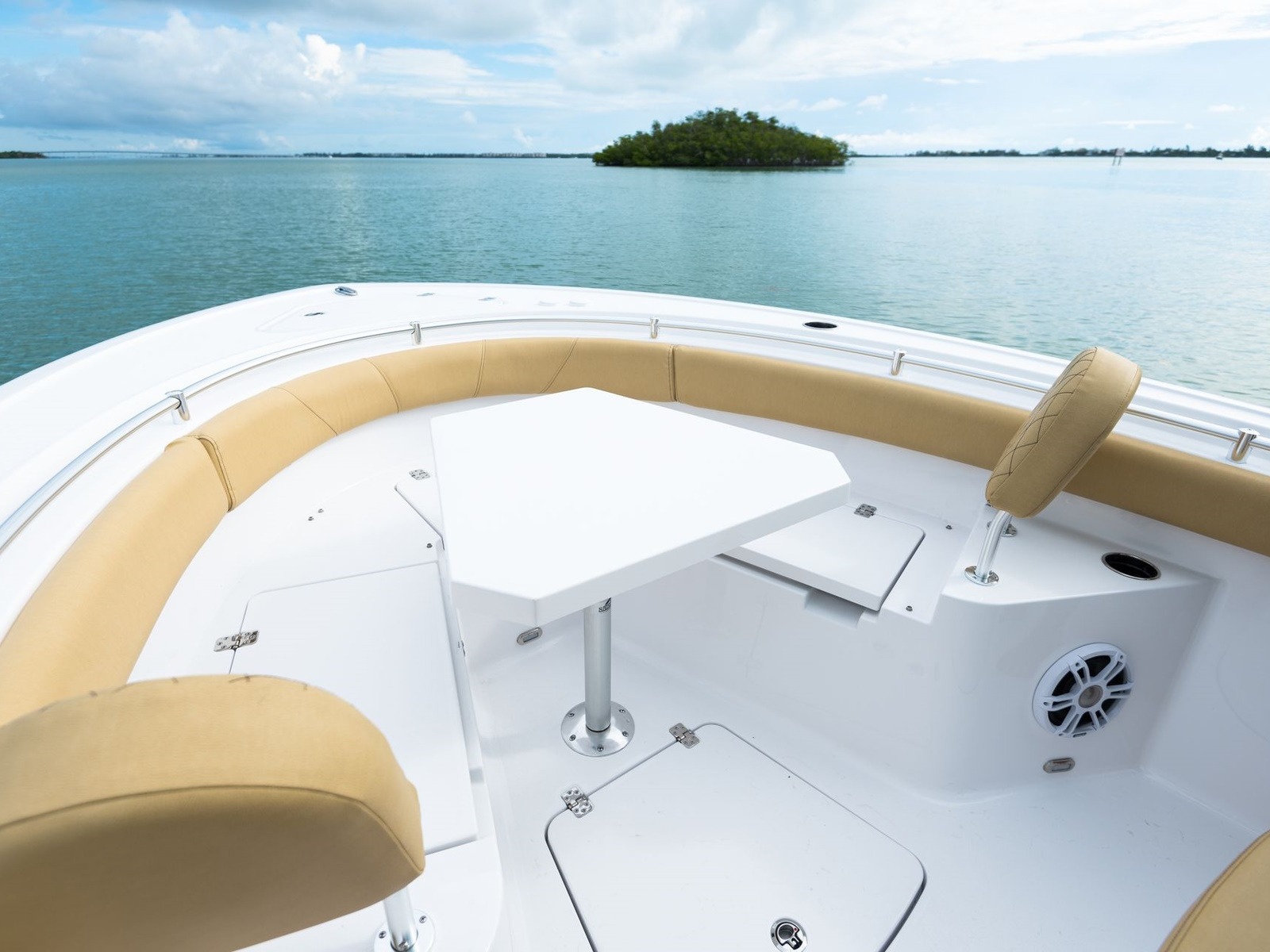 The bow of this boat is designed with entertainment and versatility in mind. Features wrap around seating with all the cushions, removable backrests, 2 easily accessible large insulated fish boxes, drink holders and speakers to play your favorite tunes.
