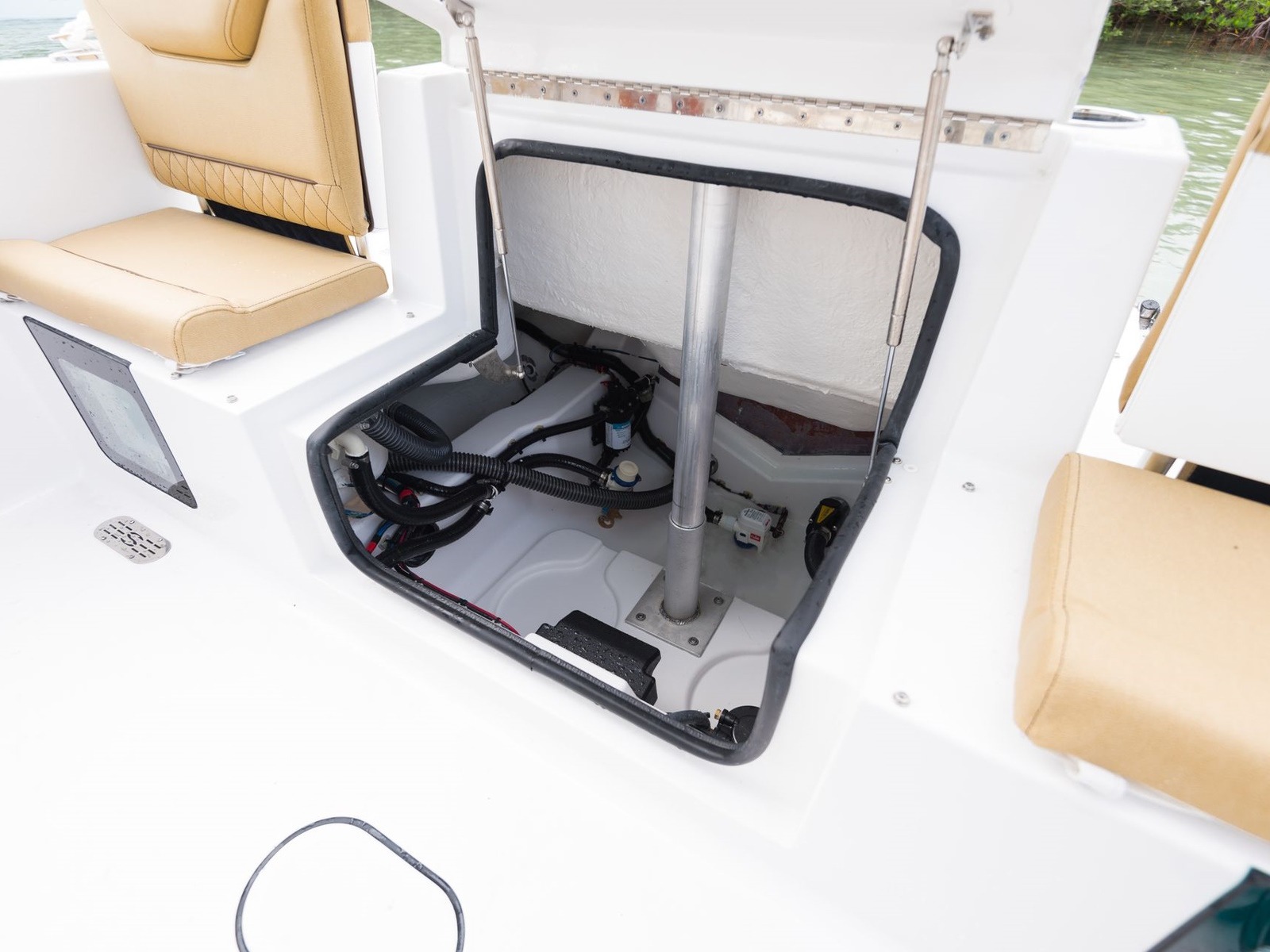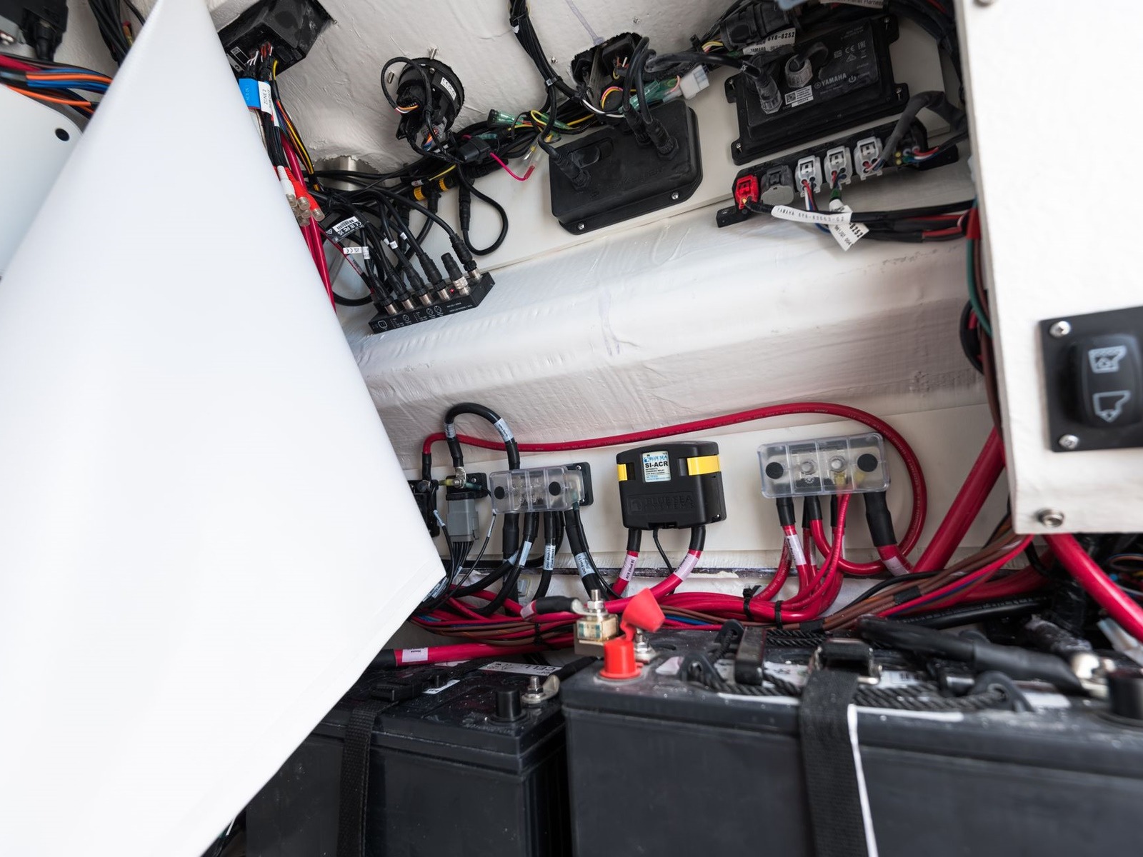 Accessing the electrical components of the boat is a breeze thanks to the large access panel located behind the helm. Our 'boat-in-a-box 2.0' rigging system is a standout feature of this boat, providing a clean and easy-to-maintain electrical hub. The electronics are mounted on removable boards, making it easy to perform maintenance or make repairs without having to dismantle or remove any major components. This innovative system is designed to minimize maintenance requirements.