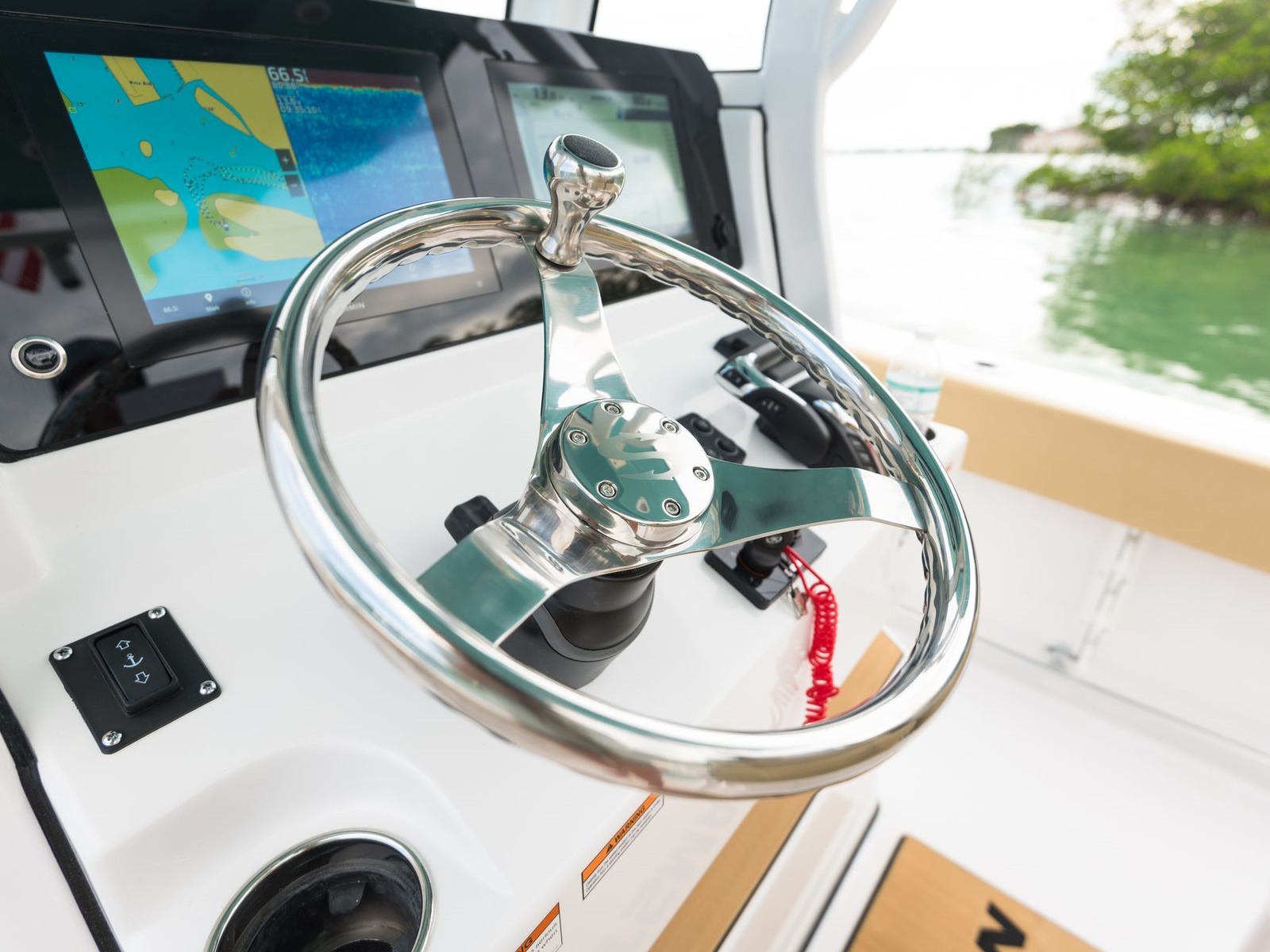 The SeaStar Helm offers over 40 degrees of tilt and locks into 5 different positions and is paired to a high quality stainless steel Sportsman-branded steering wheel with knob. The console layout has comfortable ergonomics for the perfect steering position whether standing up or sitting down.