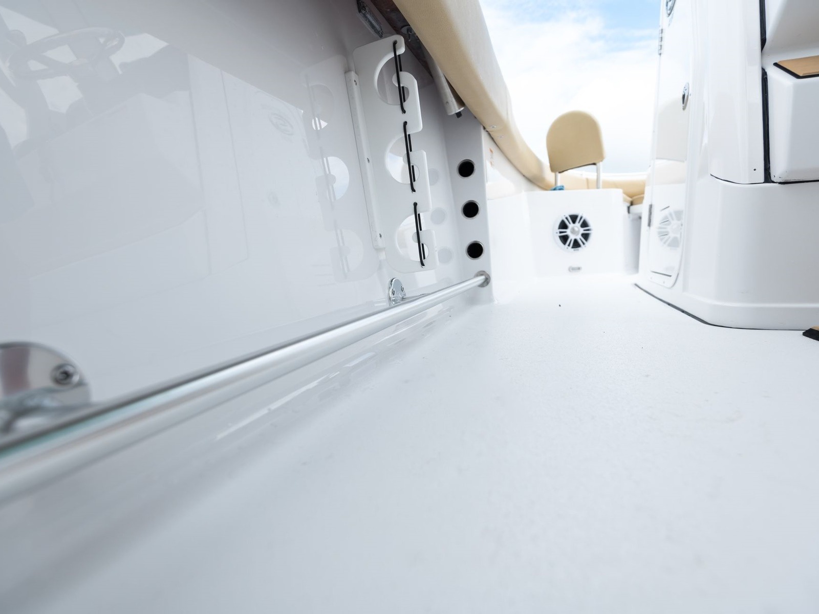 Located under the gunwale rod racks, the toe rail is designed as a brace point when heeling over the side of the boat to gaff or bring in a fish. You slide your toes under the bar and in conjunction with the bolster cushion, it provides a sturdy brace for your legs, even if the deck is wet or slippery.