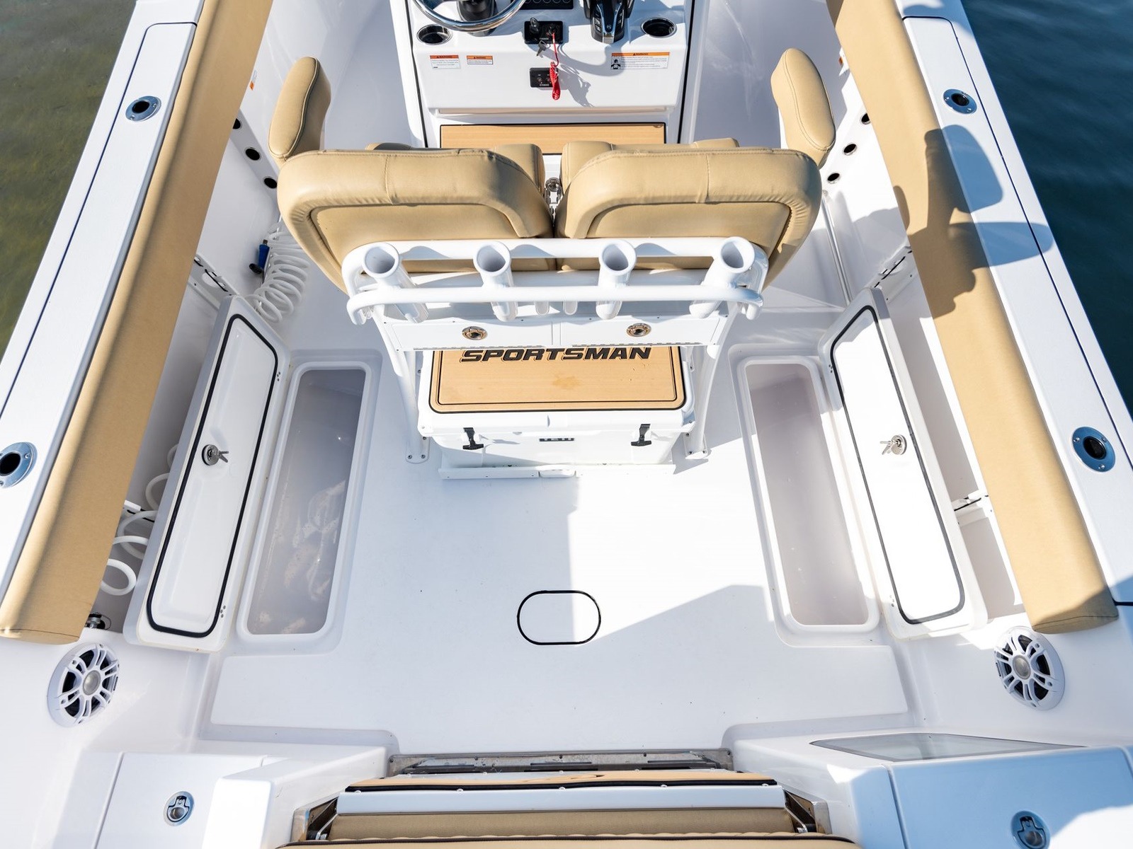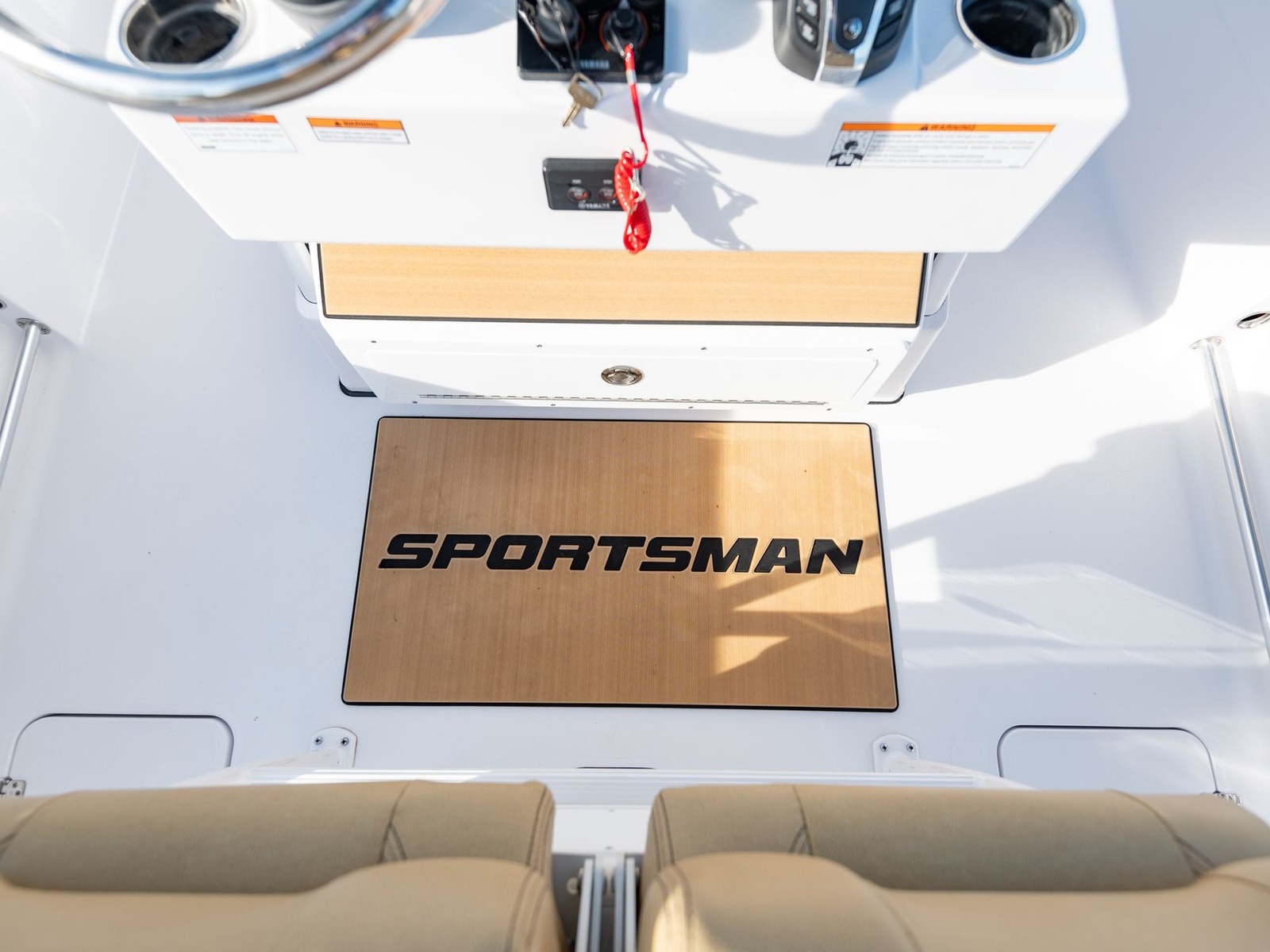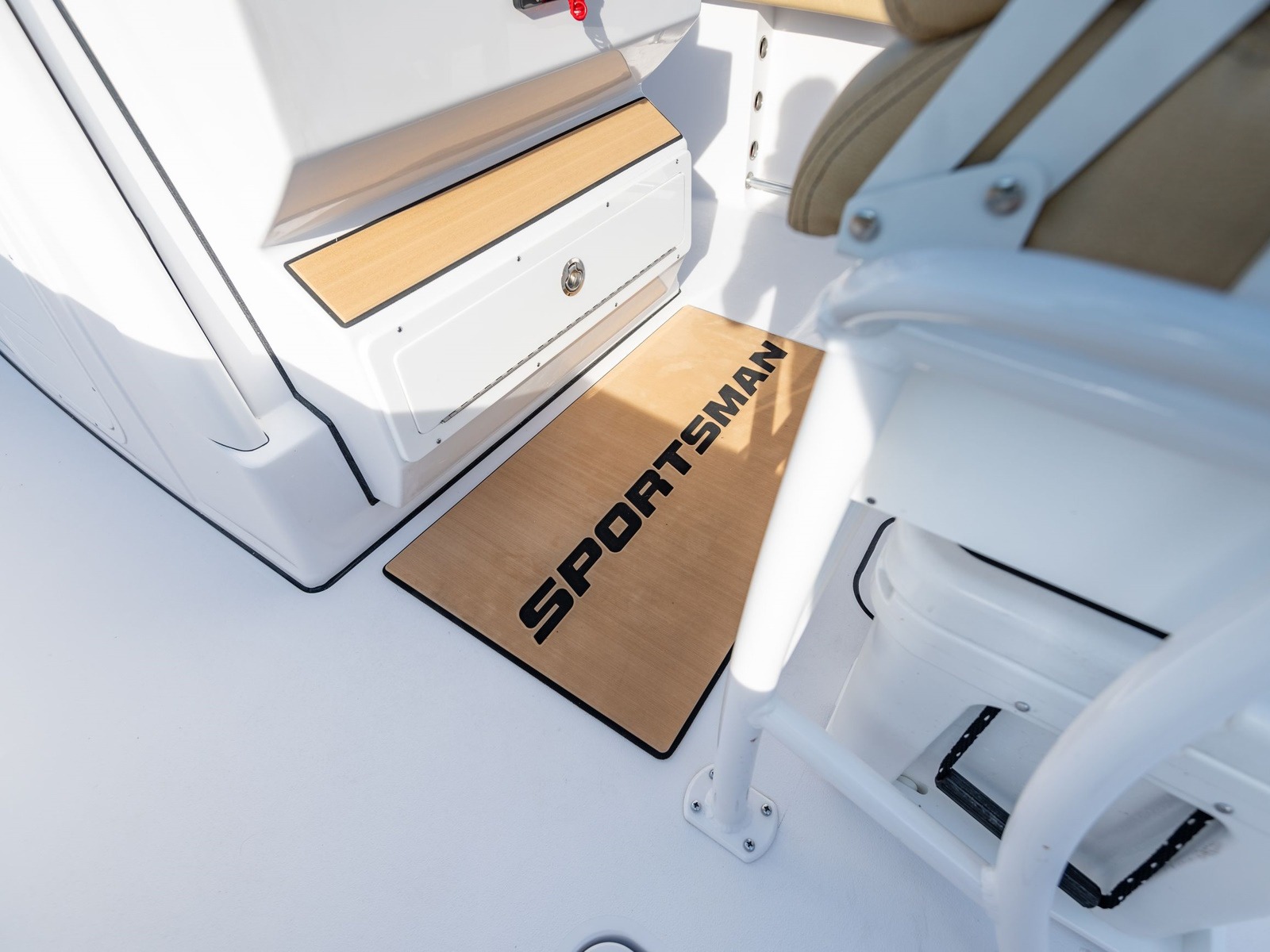 The console has molded in steps to offer a place to put your feet while the boat is underway. They are topped with custom pads with the Sportsman logo.