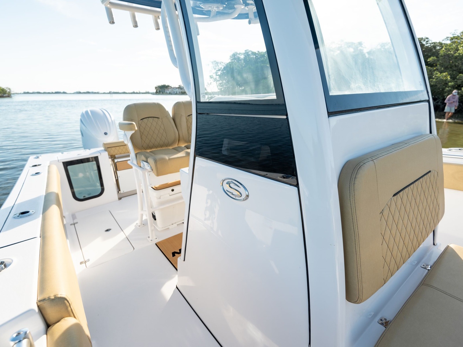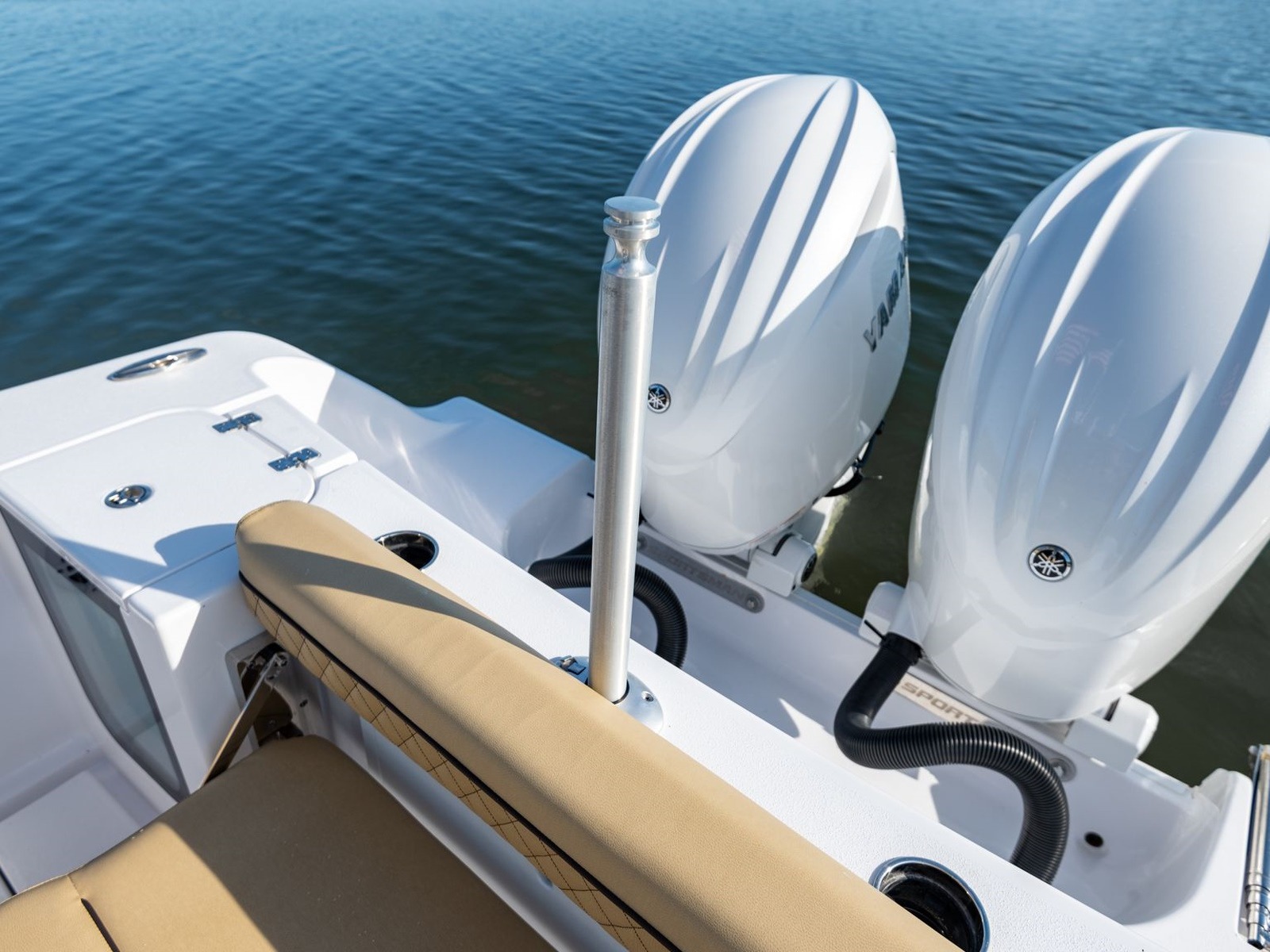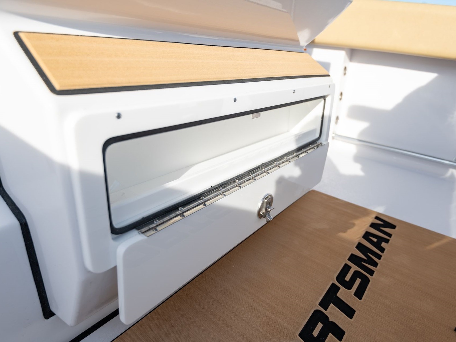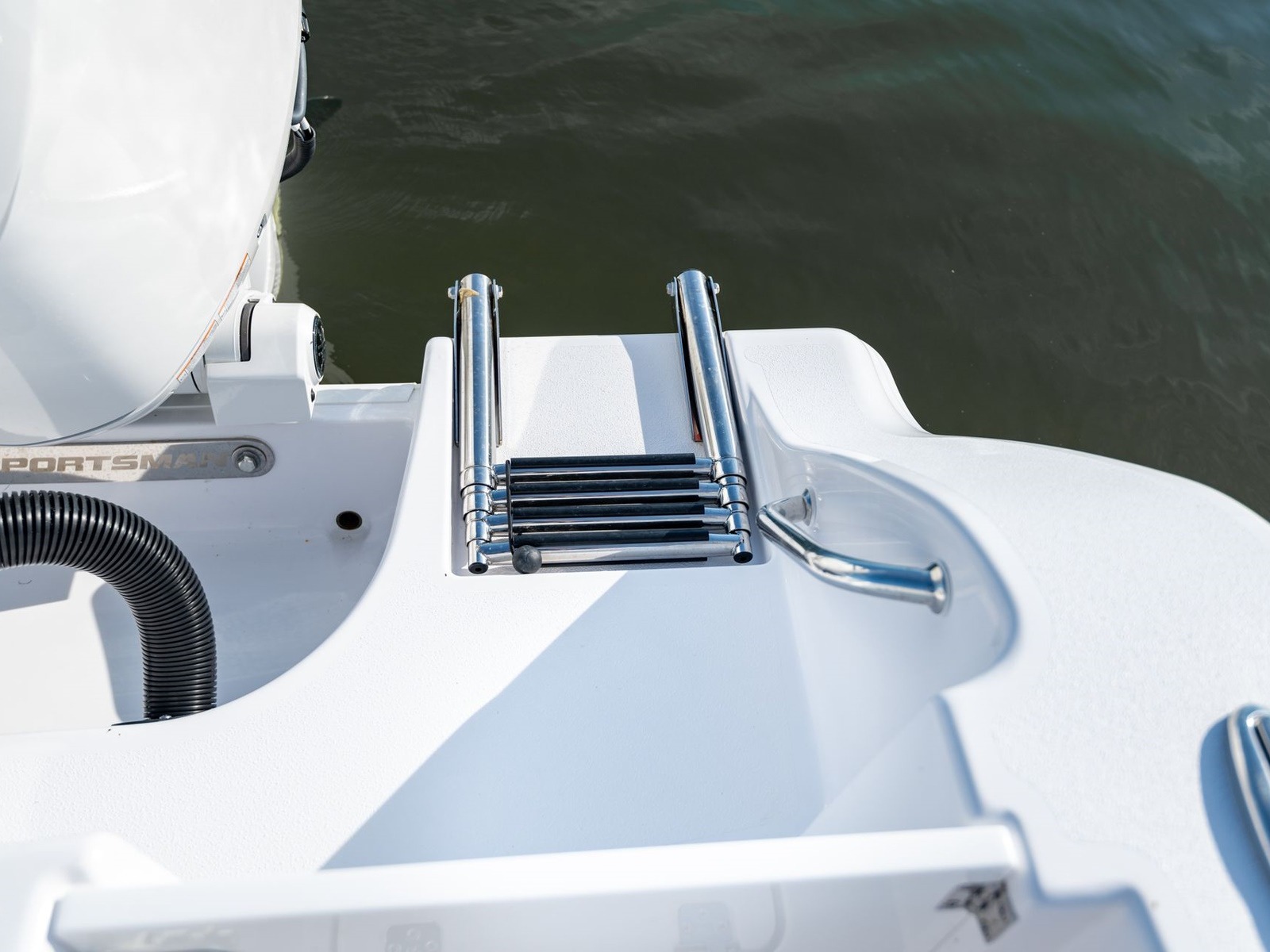The console has molded in steps to offer a place to put your feet while the boat is underway. They are topped with custom pads with the Sportsman logo.