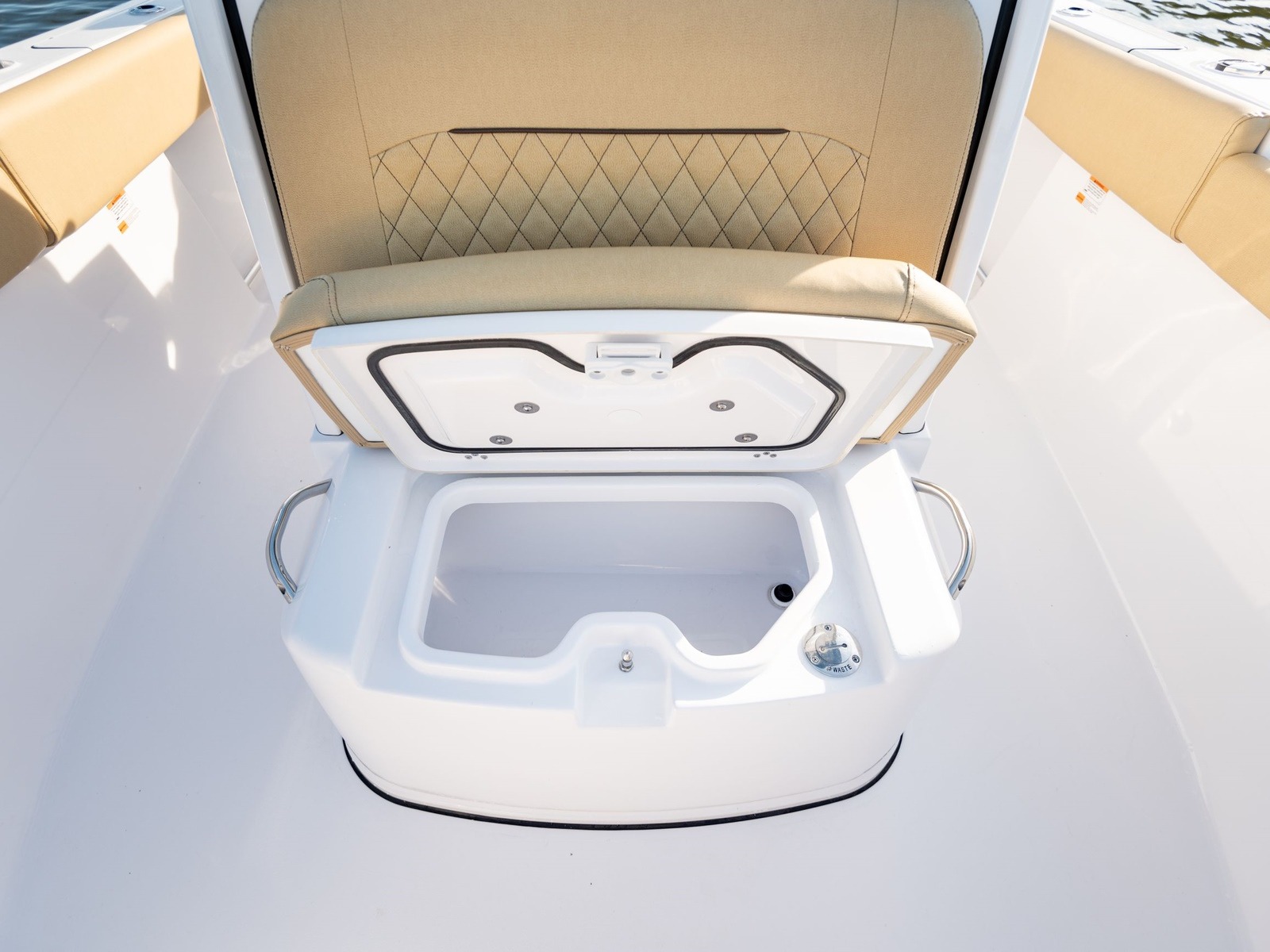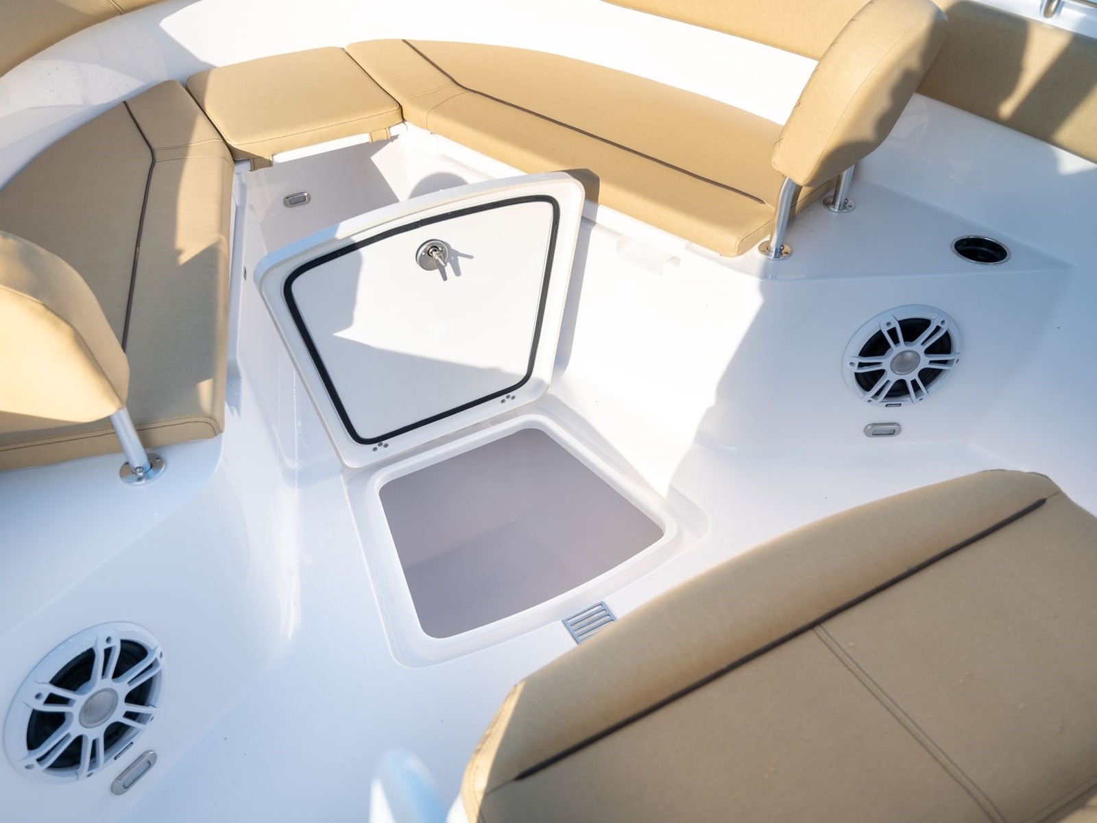 Flip the bottom cushion of the console-front seat to reveal an insulated cooler. Conveniently located for those sitting up front.