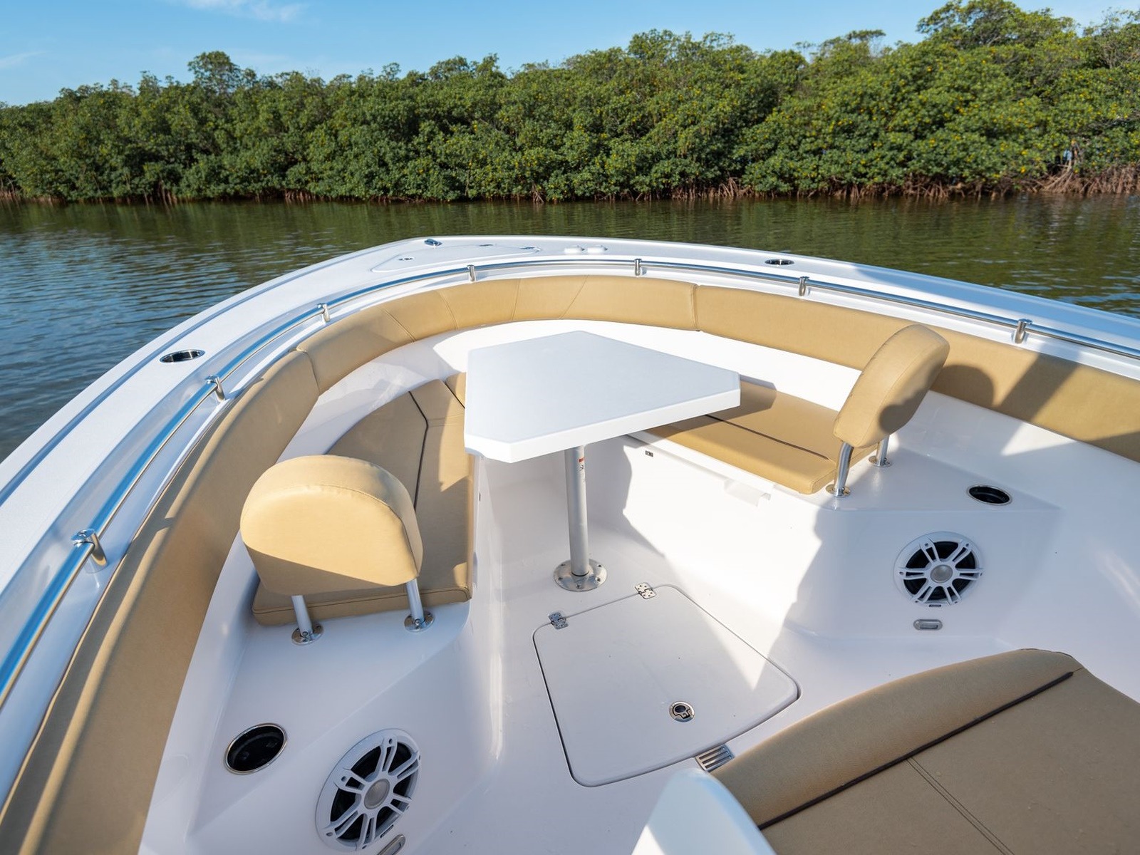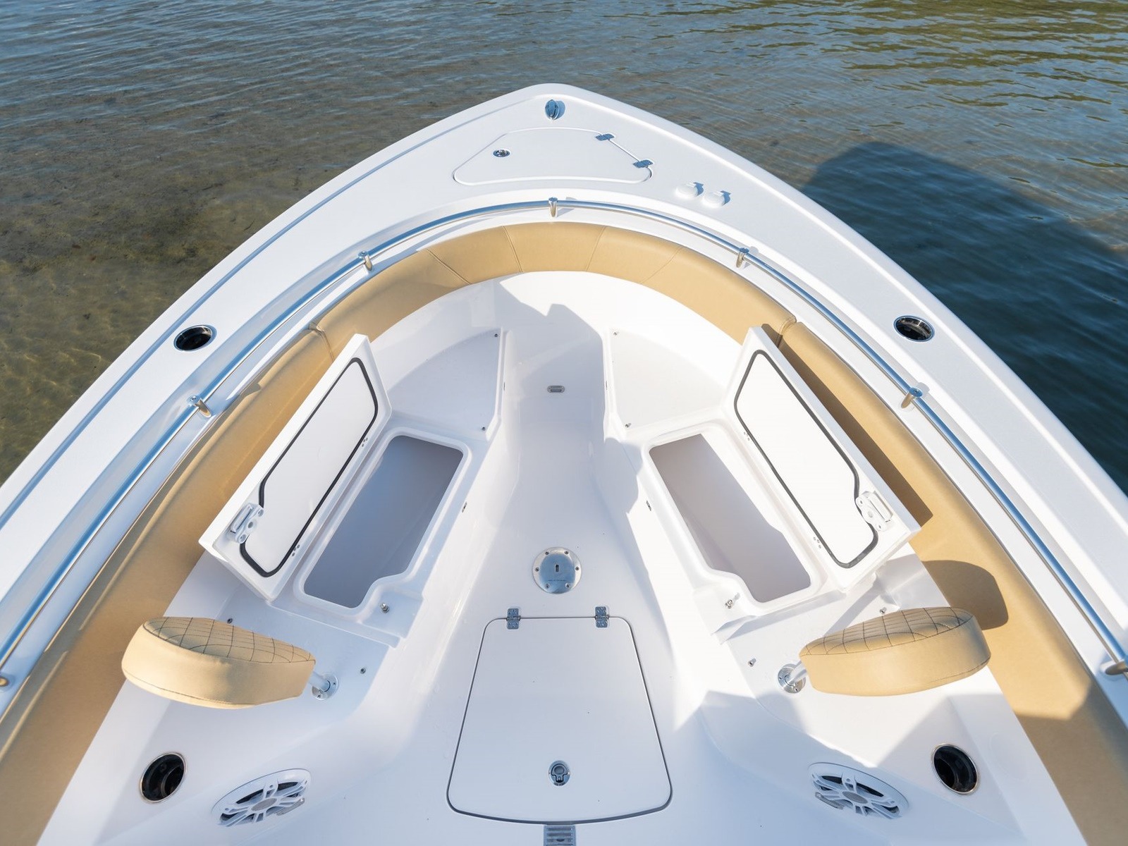 The bow of this boat is designed with entertainment and versatility in mind. Features wrap around seating with all the cushions, removable backrests, 2 easily accessible large insulated fish boxes, drink holders and speakers to play your favorite tunes.