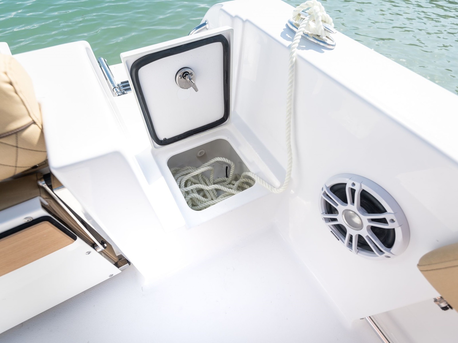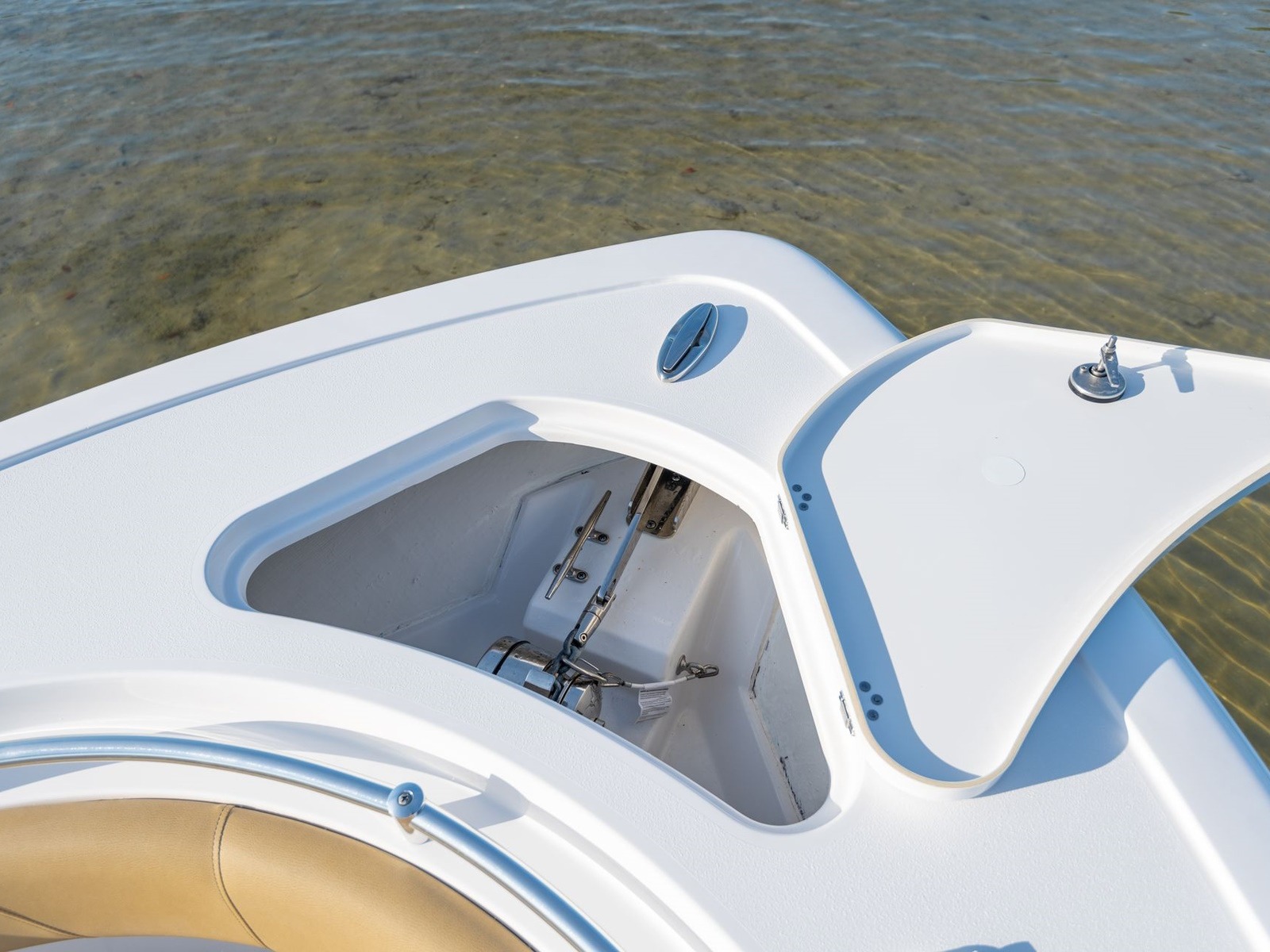 Stow away your anchor when not in use inside this large compartment. It features a molded catch for the anchor to keep it from falling in and the cut out for your rope on the lid makes it easy to store your extra rope neatly inside the compartment.