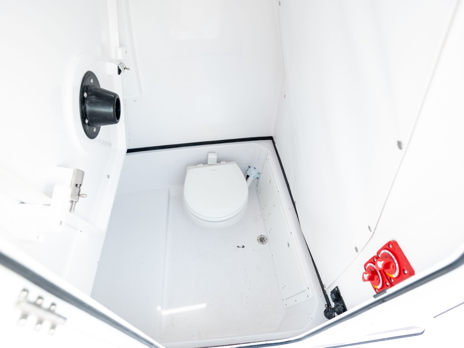 Inside the console, there is a built-in lockable storage area. This enclosed space can be used as a changing room or storage of bulky items. On the back wall, there's access to all of the connections to the electronics and fuses, very convenient for quick troubleshooting. This space can also be optionally fitted with a porta potti.