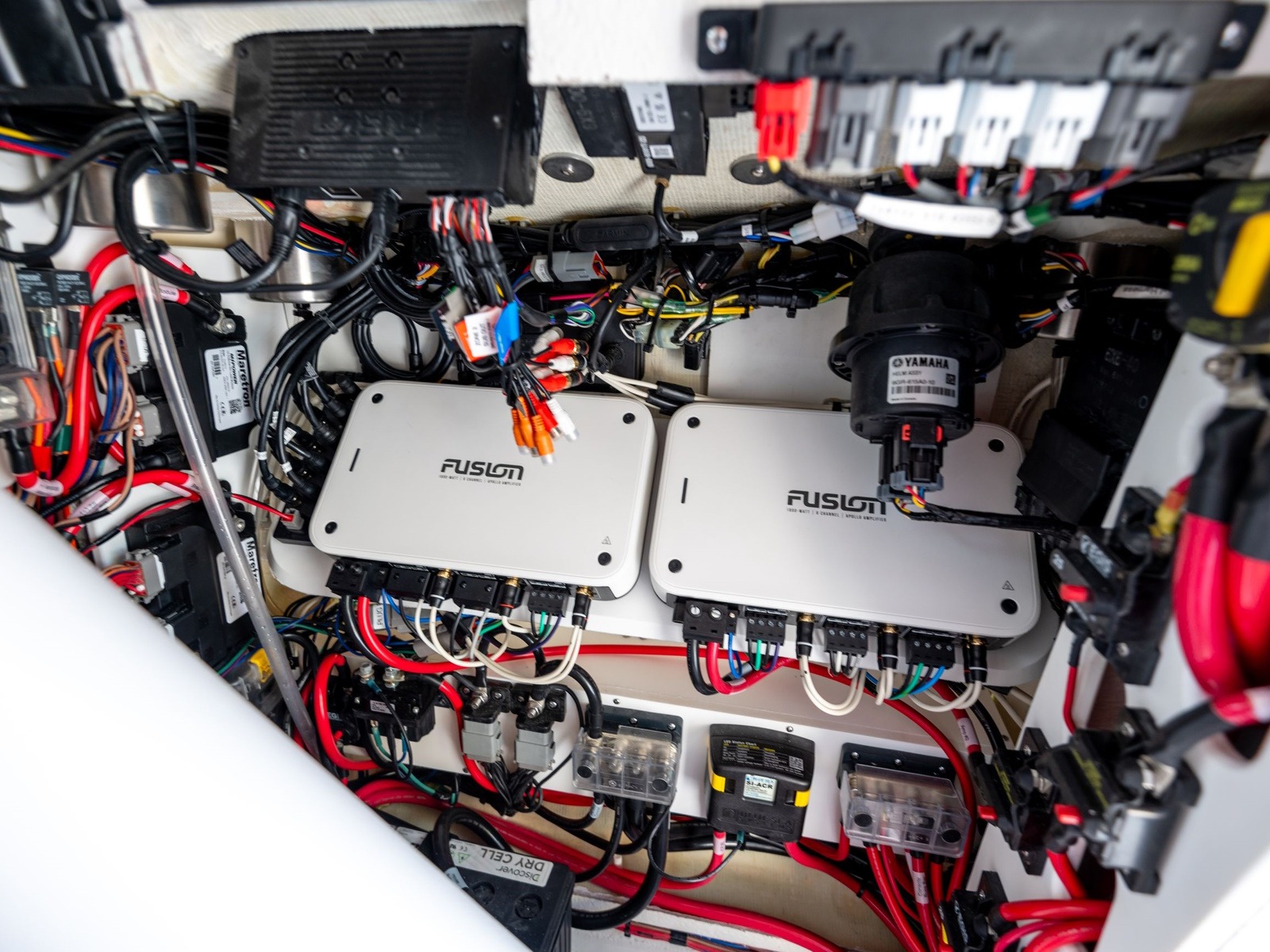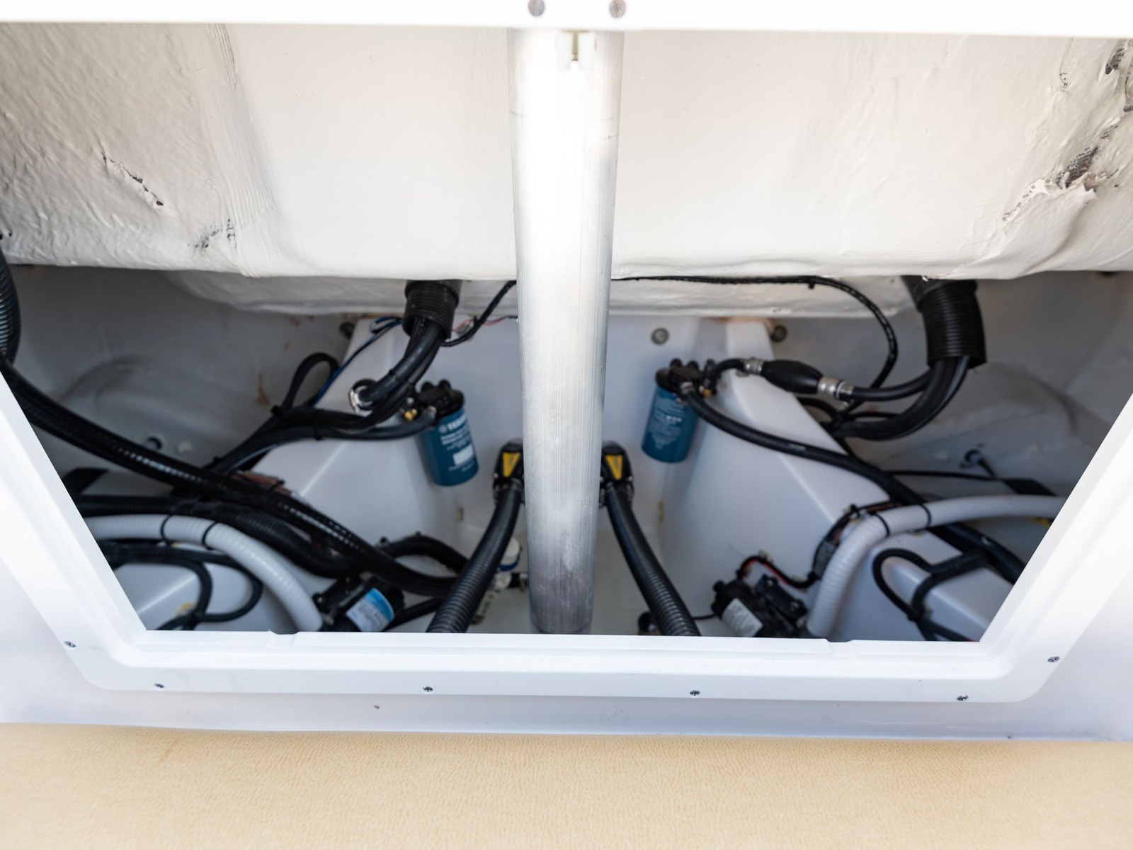 Accessing the electrical components of the boat is a breeze thanks to the large access panel located behind the helm. Our 'boat-in-a-box 2.0' rigging system is a standout feature of this boat, providing a clean and easy-to-maintain electrical hub. The electronics are mounted on removable boards, making it easy to perform maintenance or make repairs without having to dismantle or remove any major components. This innovative system is designed to minimize maintenance requirements.