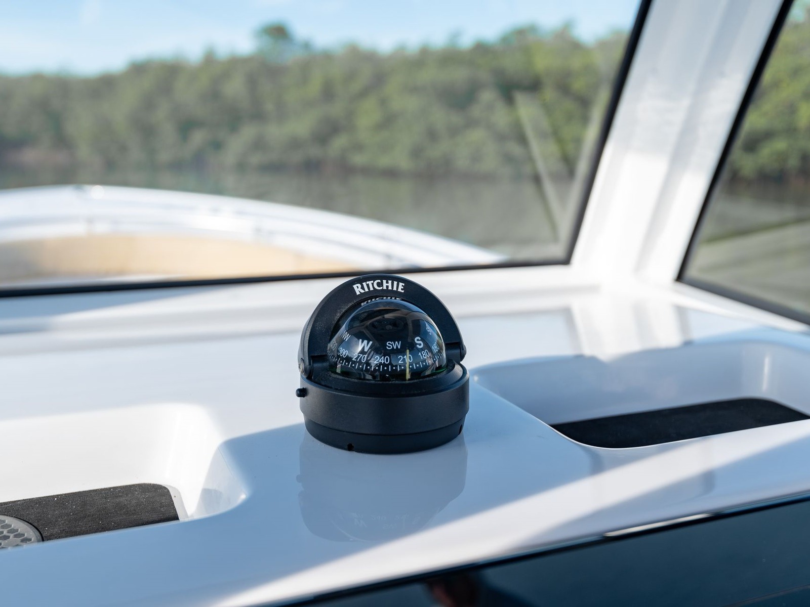 The console of this boat is a highlight of its design, featuring a sleek and modern look that follows the Sportsman design language, as well as several innovative features that enhance both form and function. It boasts a designed-in d-tubing hard-top frame that is extruded from a single piece of aluminum. This design removes the frame legs from the deck, giving you more space around the console and a robust frame structure. Additionally, it yields more space inside the head. The starboard side of the console features the iconic Sportsman side window glass, which floods the interior space with light. The console is wrapped with a tempered glass enclosure that includes a manually actuated vent.