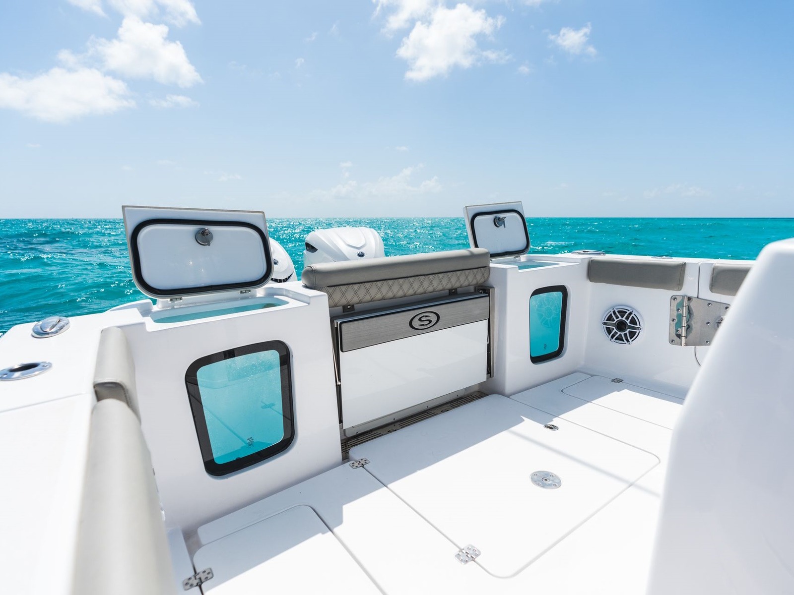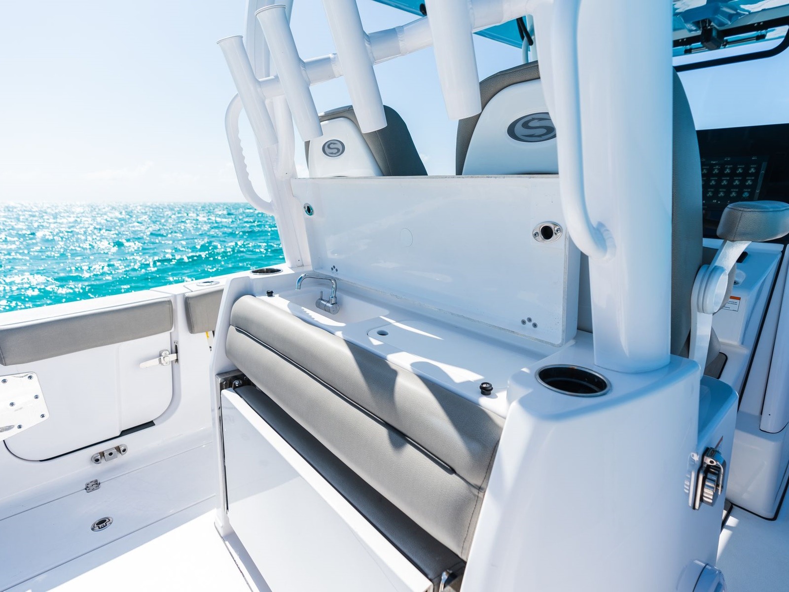 - This option substitutes the tackle center for a rear facing seat with a sink.