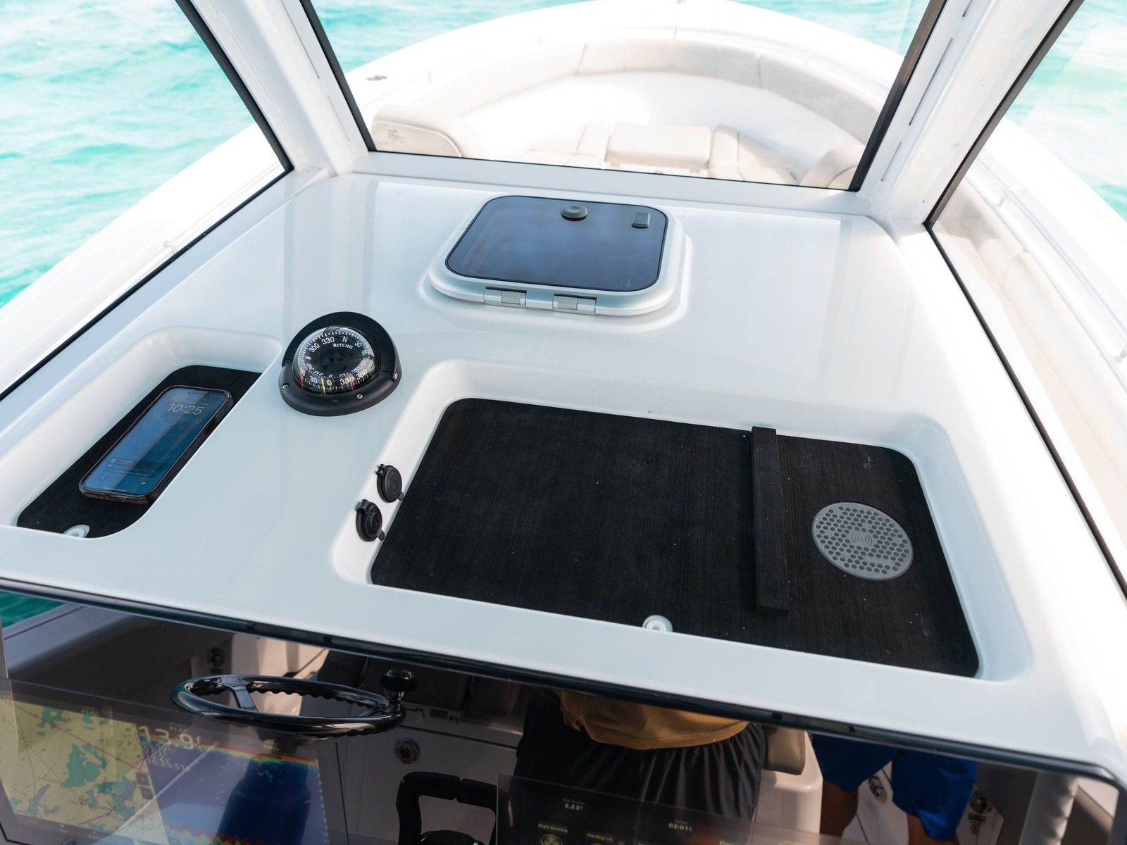 - Under the helm pod, you will find two storage boxes built into the step providing you ample storage at the helm. The port box includes brackets to hold a fire extinguisher safely while underway.