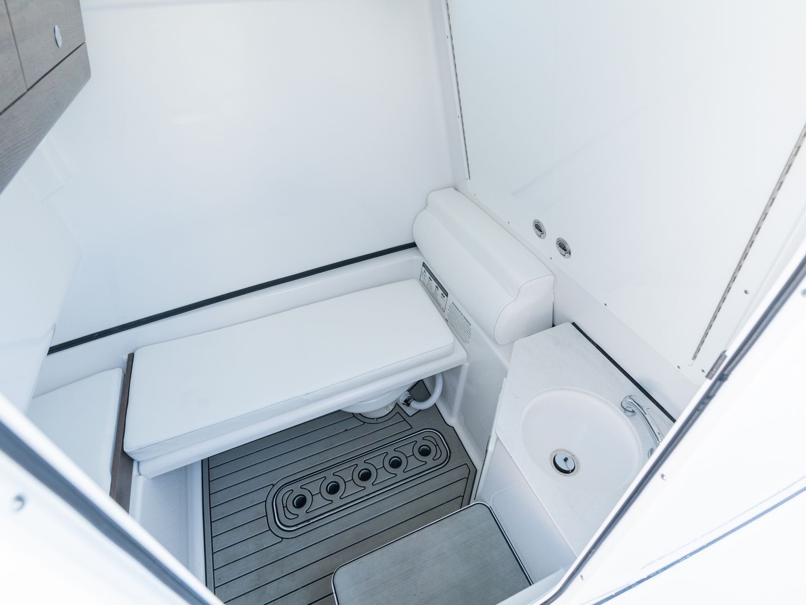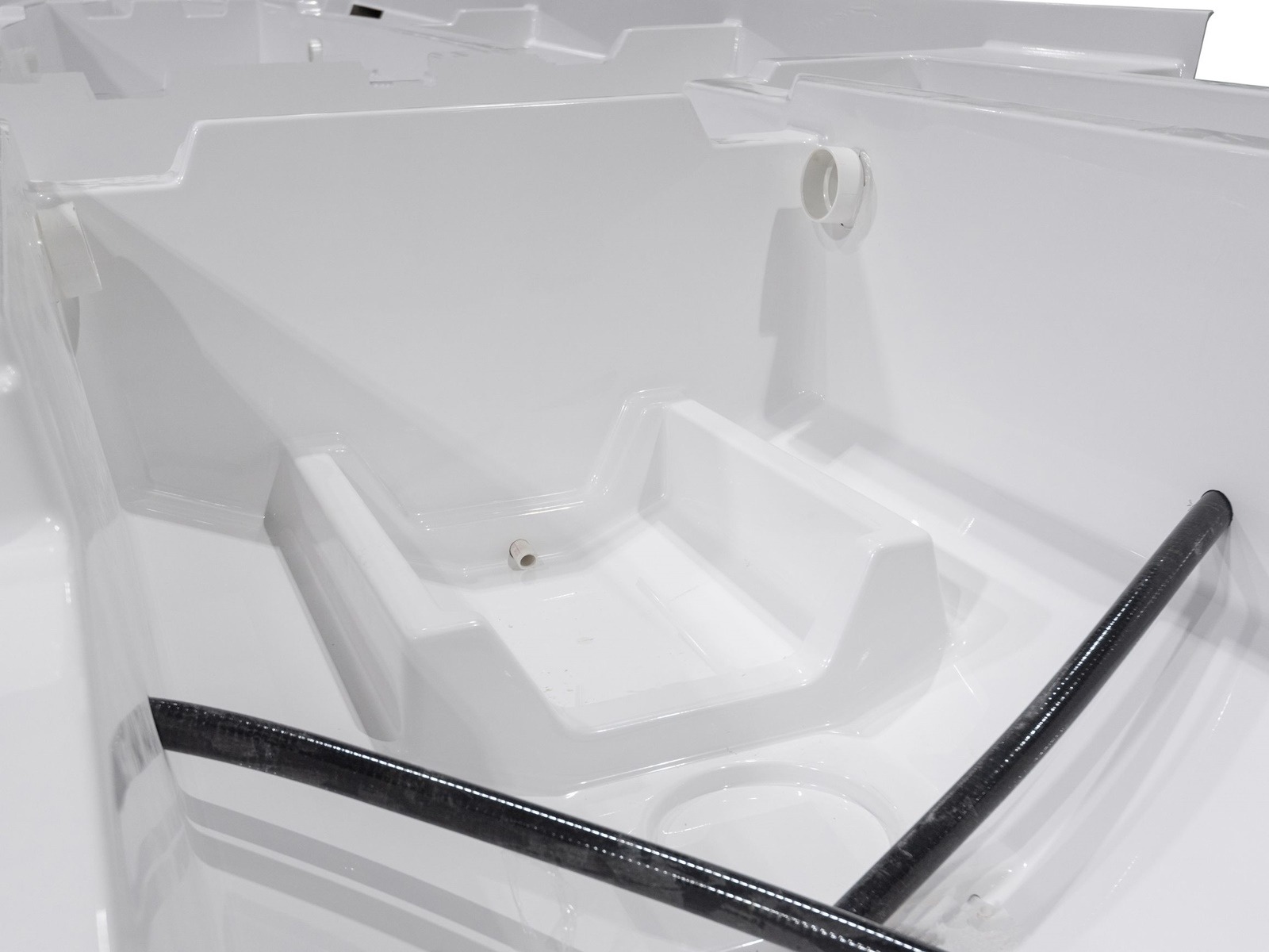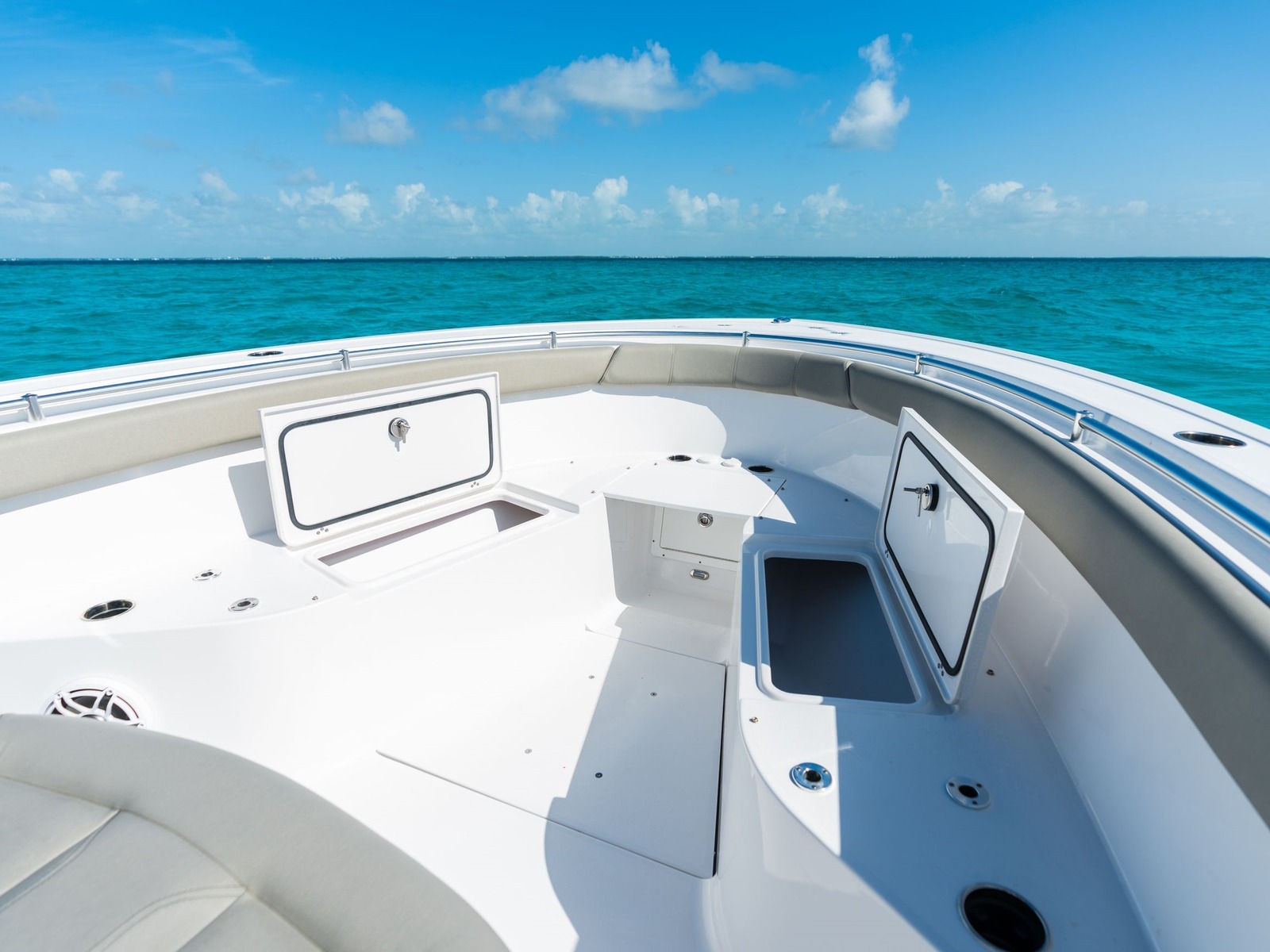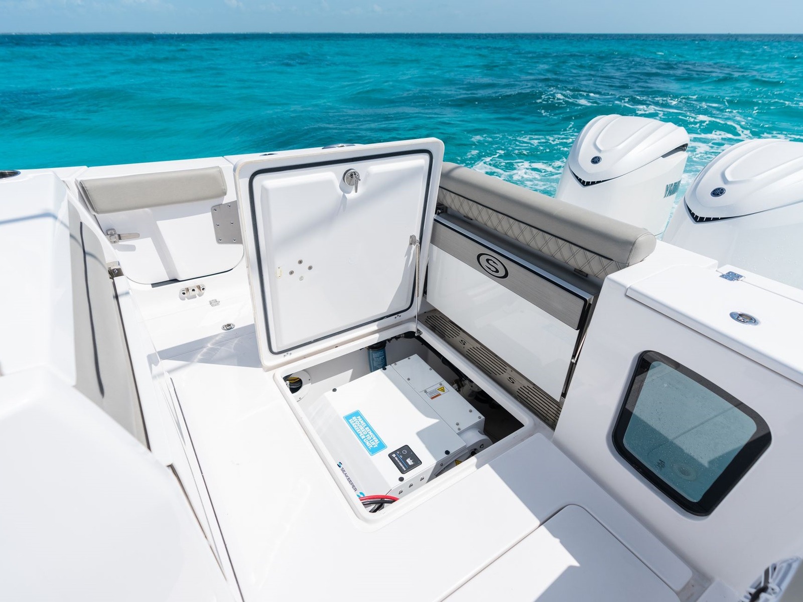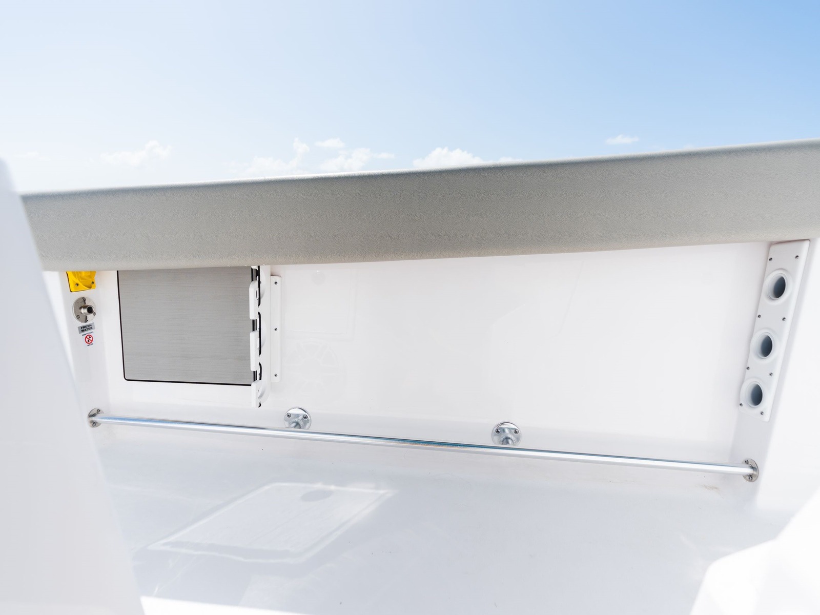 - Opening the large center in-floor lid, reveals the total access compartment. This best-in-class bilge access is one of our signature features and we’ve taken it to the next level with this designed-in larger opening.