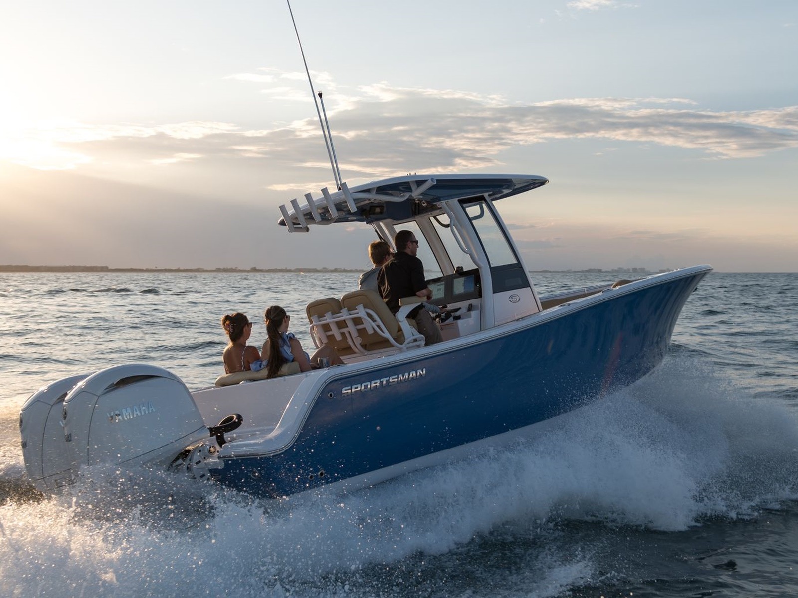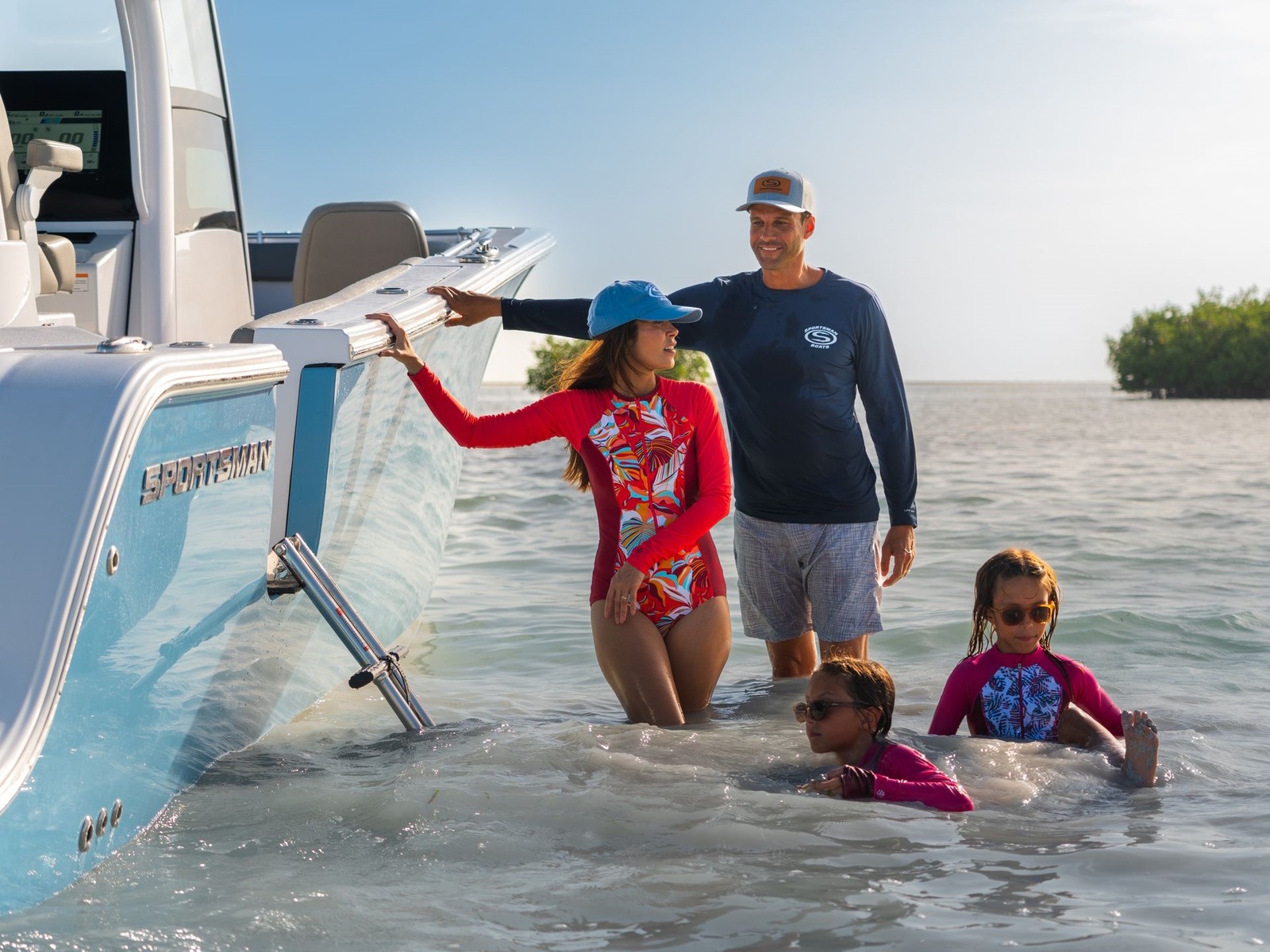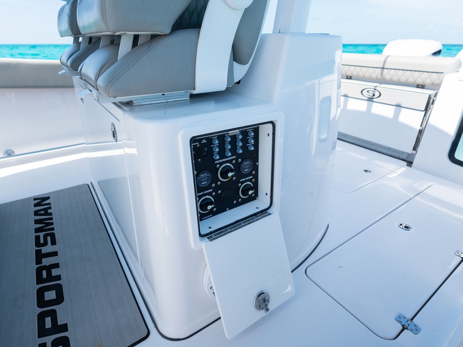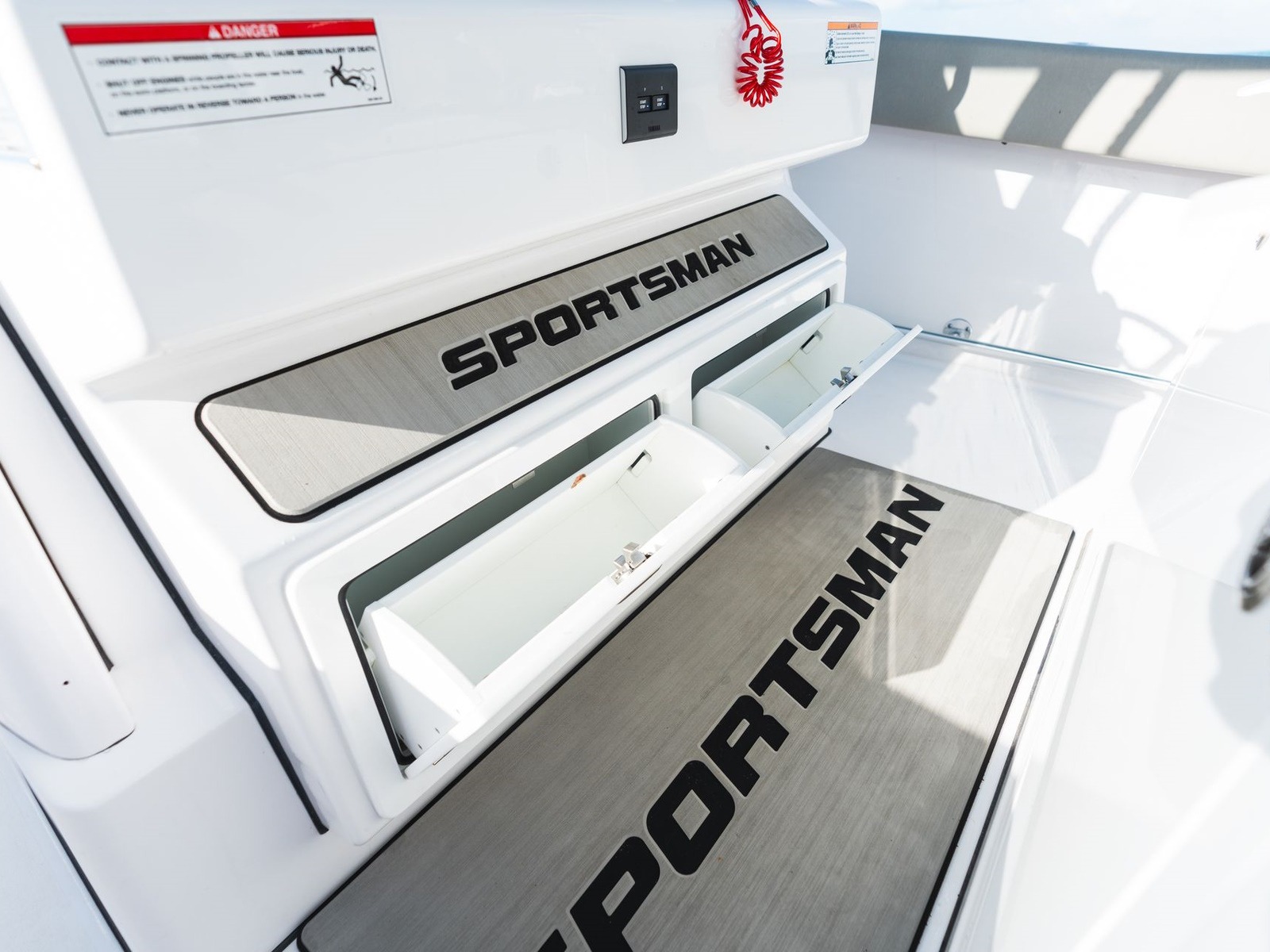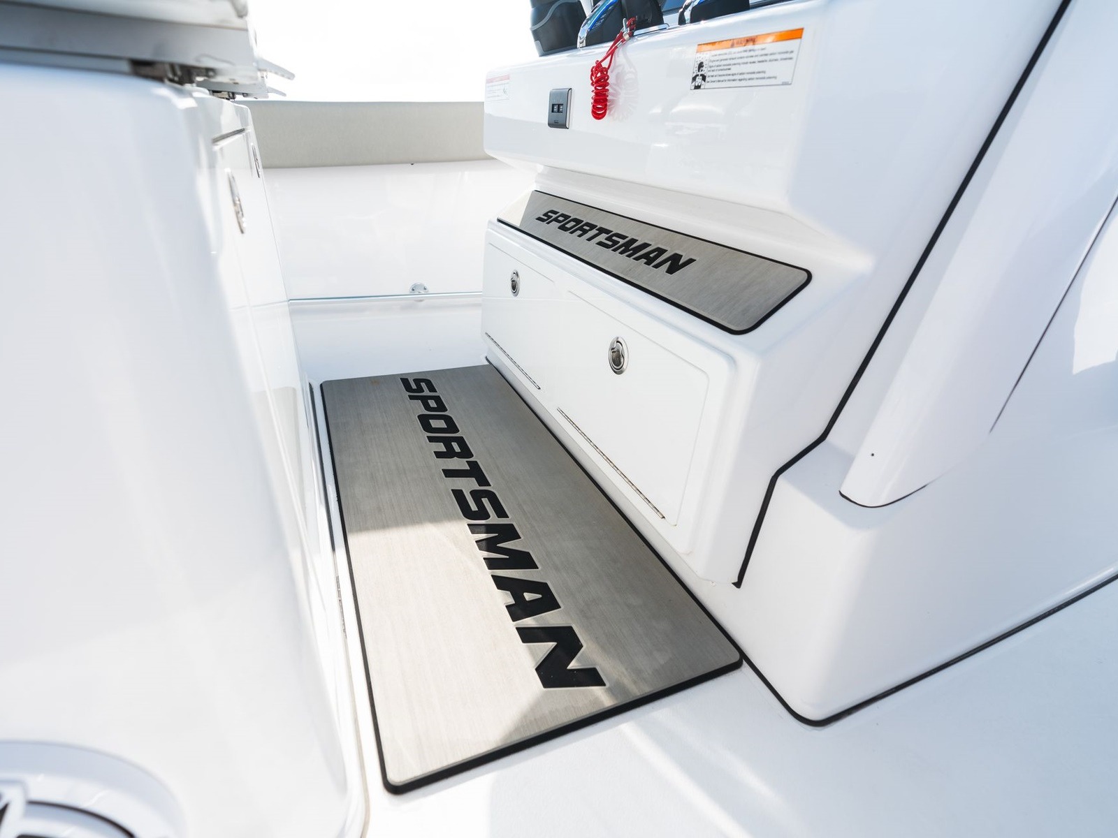 - The console has molded in steps to offer a place to put your feet while the boat is underway. They are topped with custom pads with the Sportsman logo.