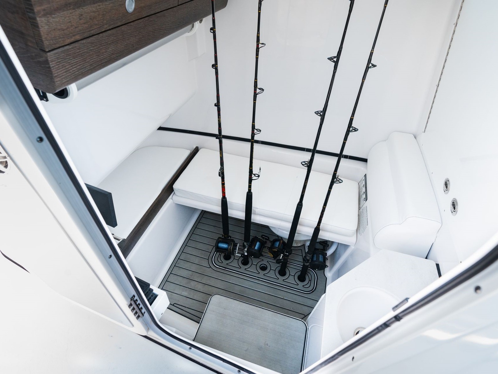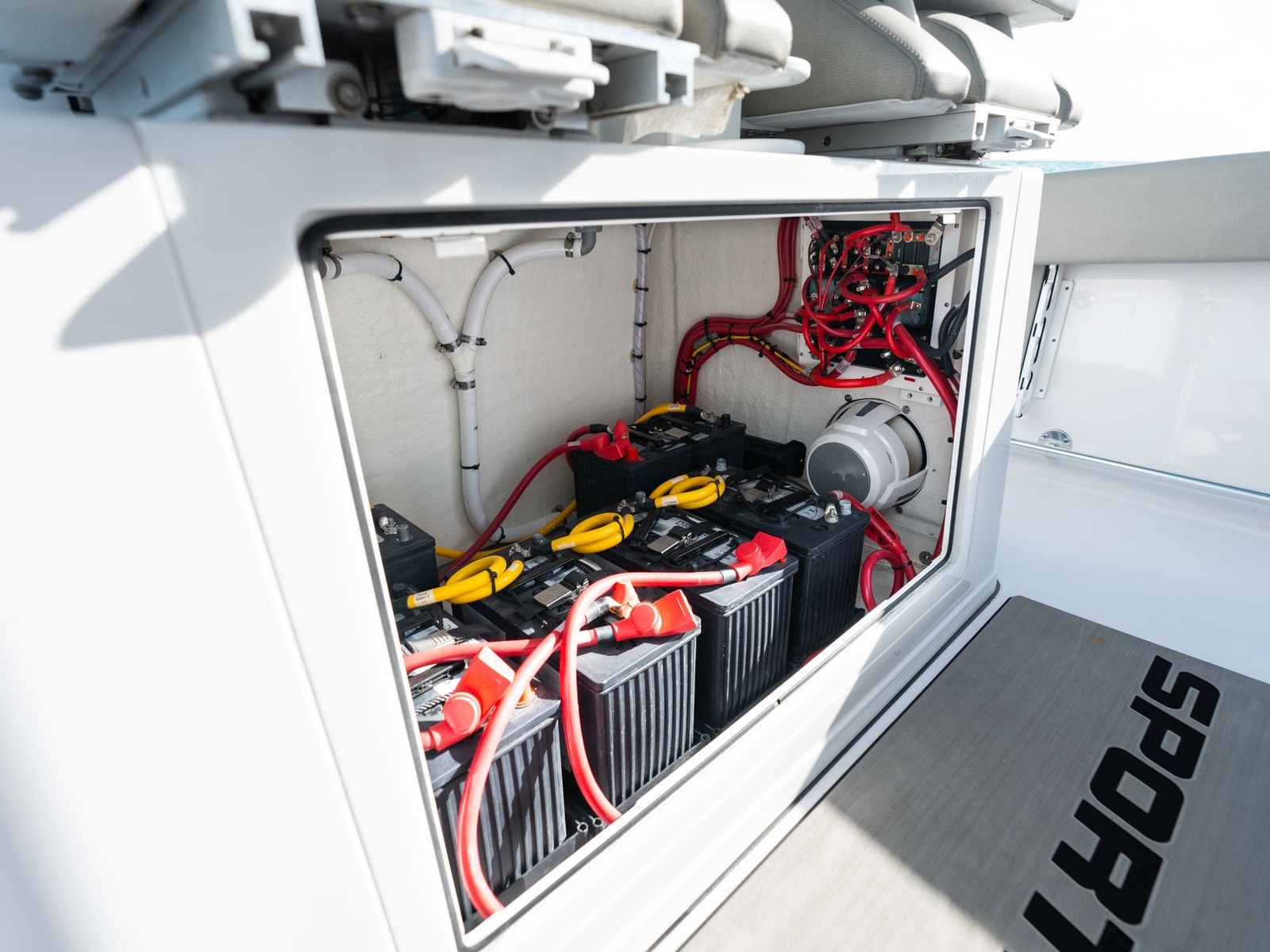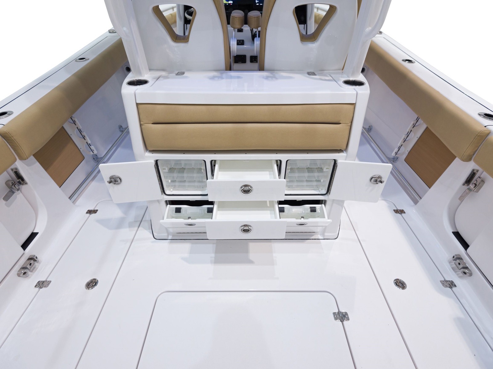 - Under the captain's chairs, you will find your batteries, storage bin and a large tackle center with drawers. For your convenience, the drawers have dividers inside to keep your items organized.