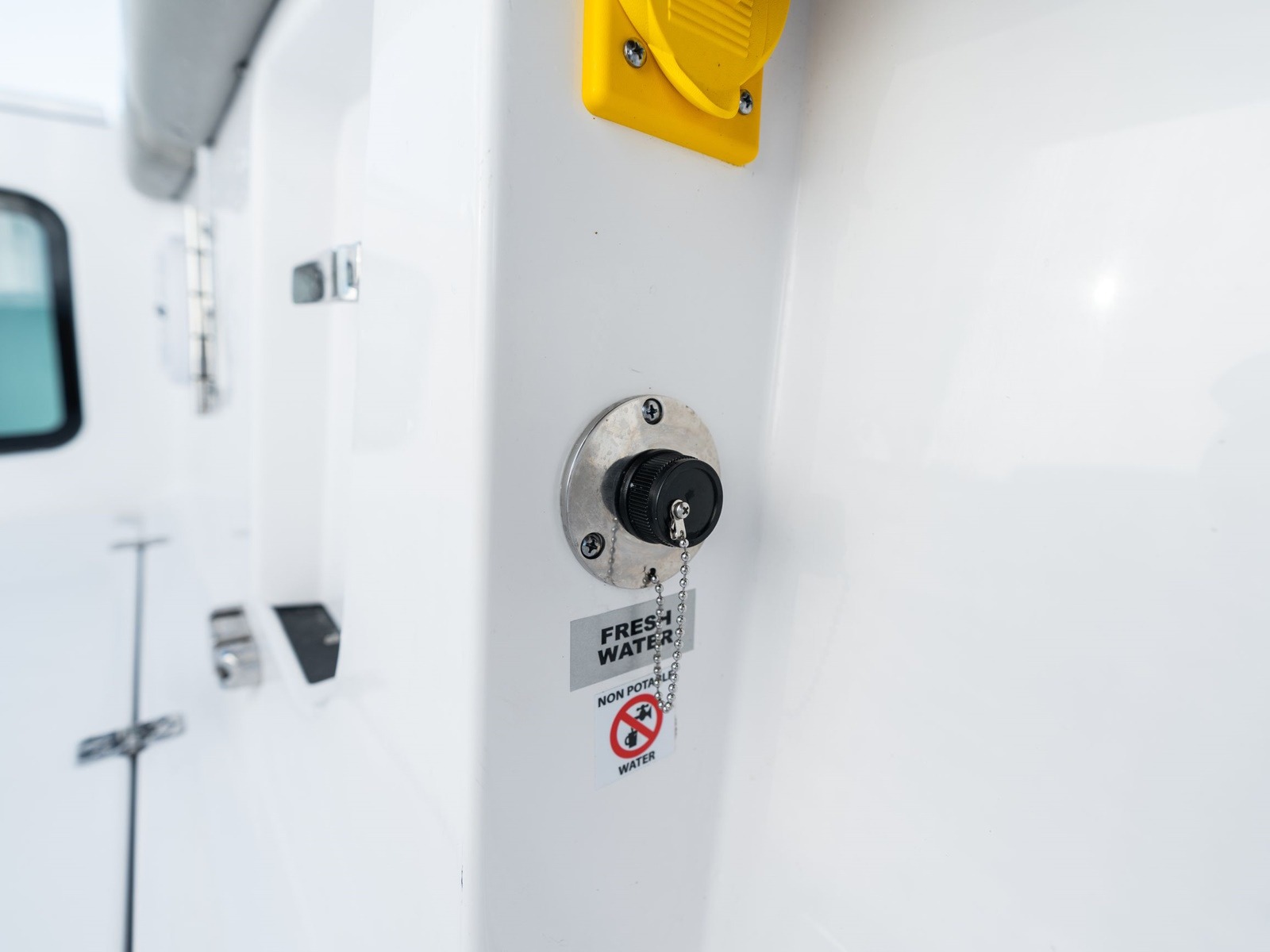 - Over the top of the leaning post, opening the lid reveals a freshwater sink with a removable cutting board insert. Under the right side, you will find a great spot for some food or to thaw baits.