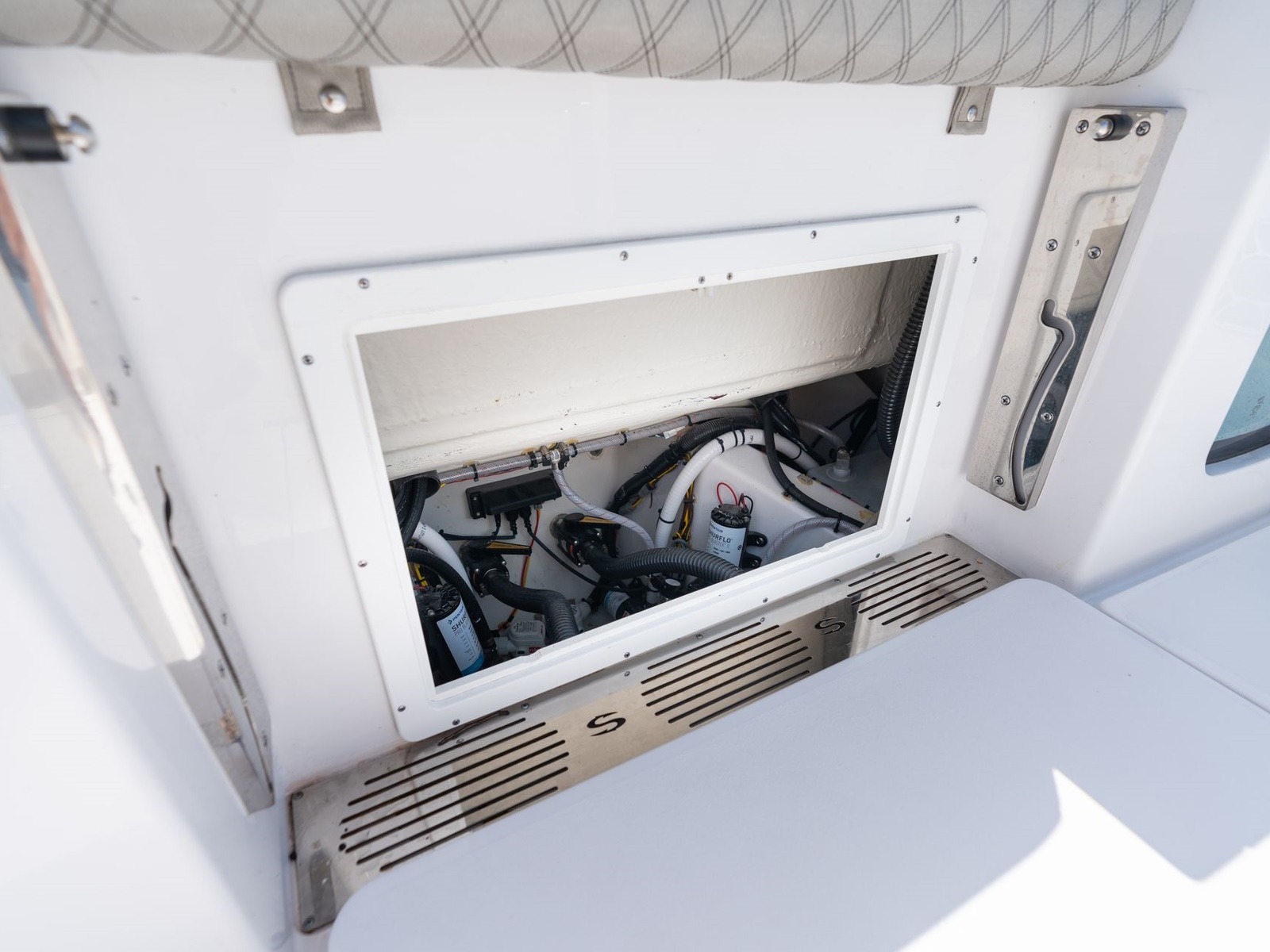 - On the port side, you gain access to the battery switch panel with switches for the house, engines and additional accessories. The main breakers are also located on this panel where they can be easily reset.