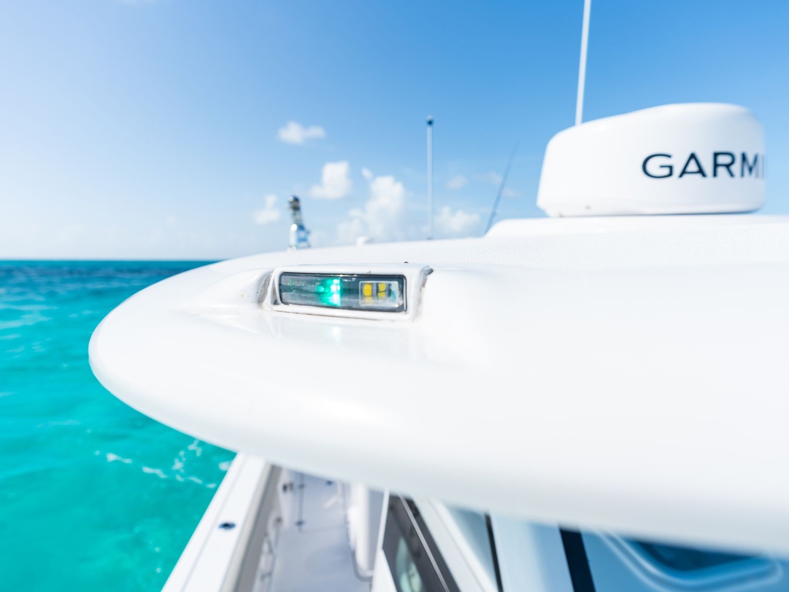 - When the sun goes down, molded in navigation lights can be found at the front corners of the hard-top. This location keeps them out of the way and completely unobstructed. Additionally, these Lumitec lights can dual purpose as docking lights with built in 1000 lumen white dock lights.